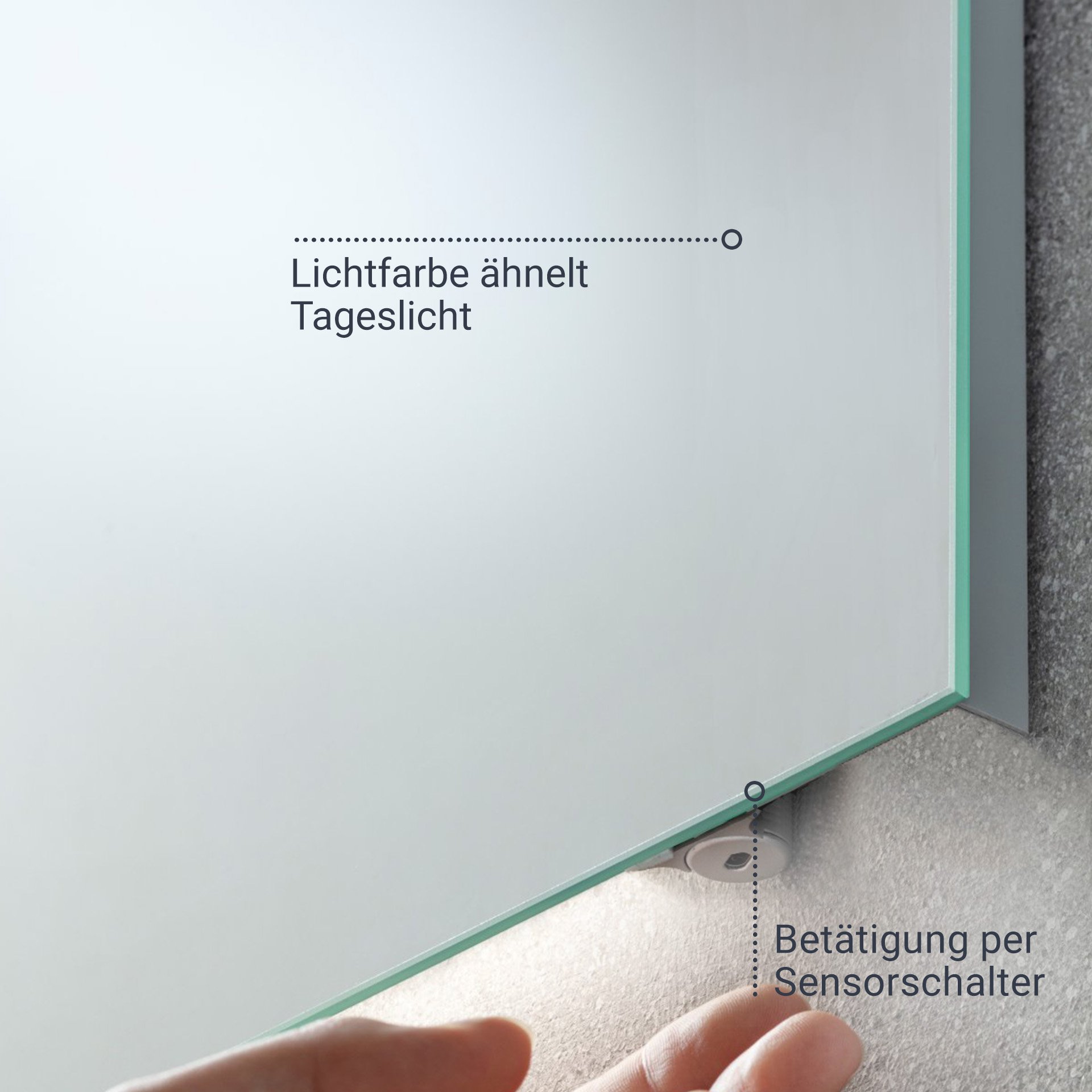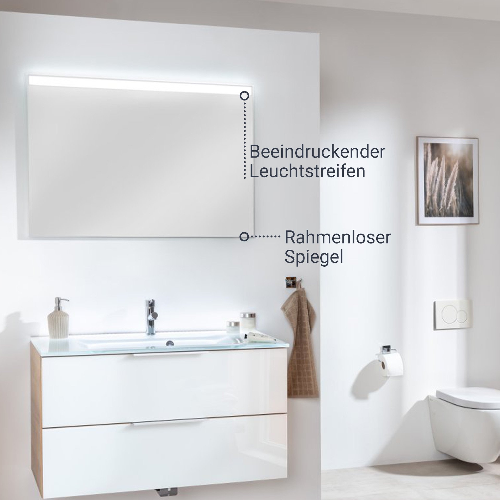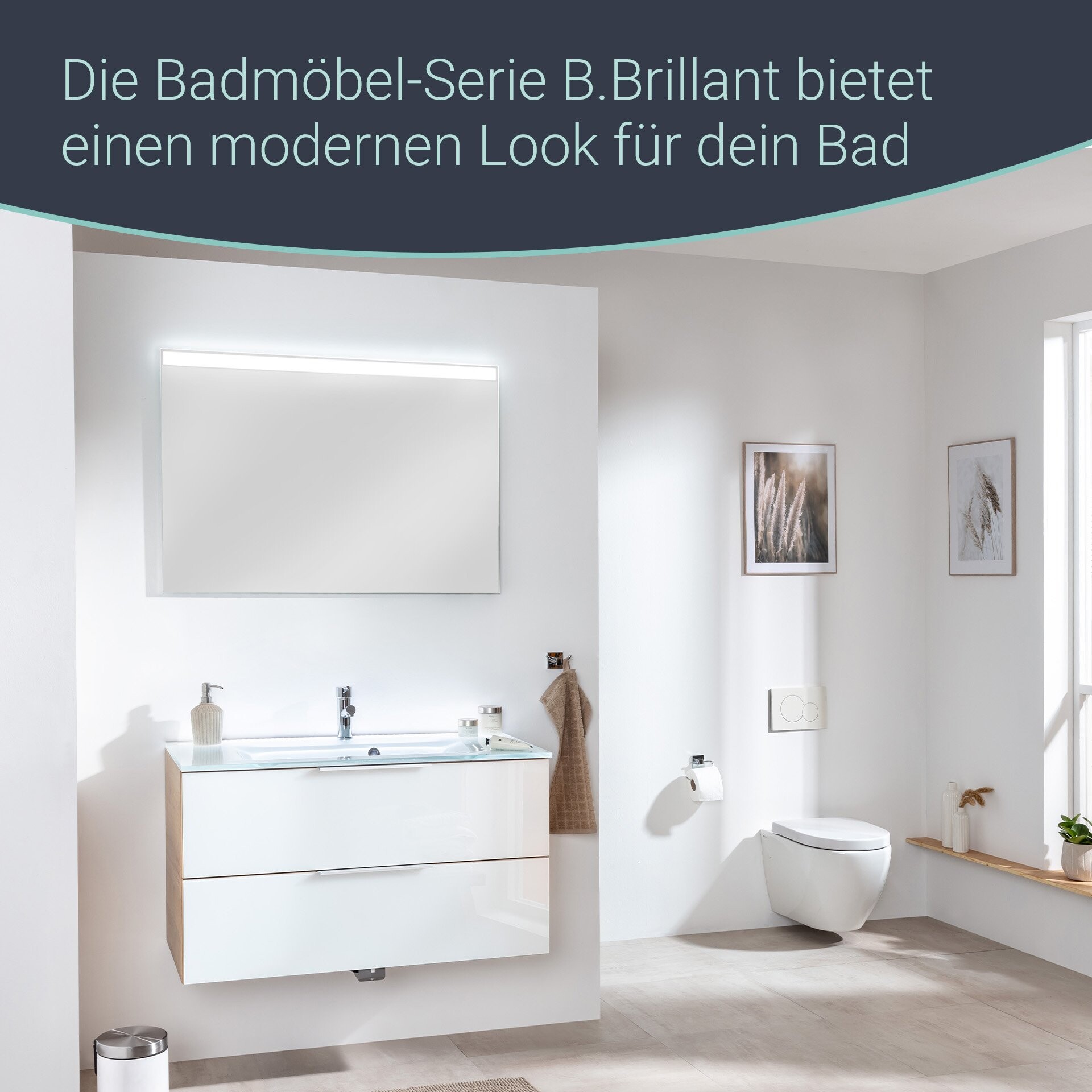 Ein sanfter Fingertipp und schon leuchtet die LED-Beleuchtung des 100 cm breiten Spiegels. Verantwortlich dafür ist der Sensorschalter an der unteren Seite des Spiegels der Firma Fackelmann. Der moderne LED-Spiegel passt hervorragend zu der Serie B.BRILLANT und unterstützt mit seiner Lichtfarbe, die dem Tageslicht ähnelt, die glänzend lackierte Glasfront der Schränke dieser Serie. Das Licht sorgt dafür, das Farben realitätsnah wiedergegeben werden und das tägliche Pflegeritual zu einem Erlebnis wird. Selbstverständlich ist das Befestigungsset im Lieferumfang enthalten.
