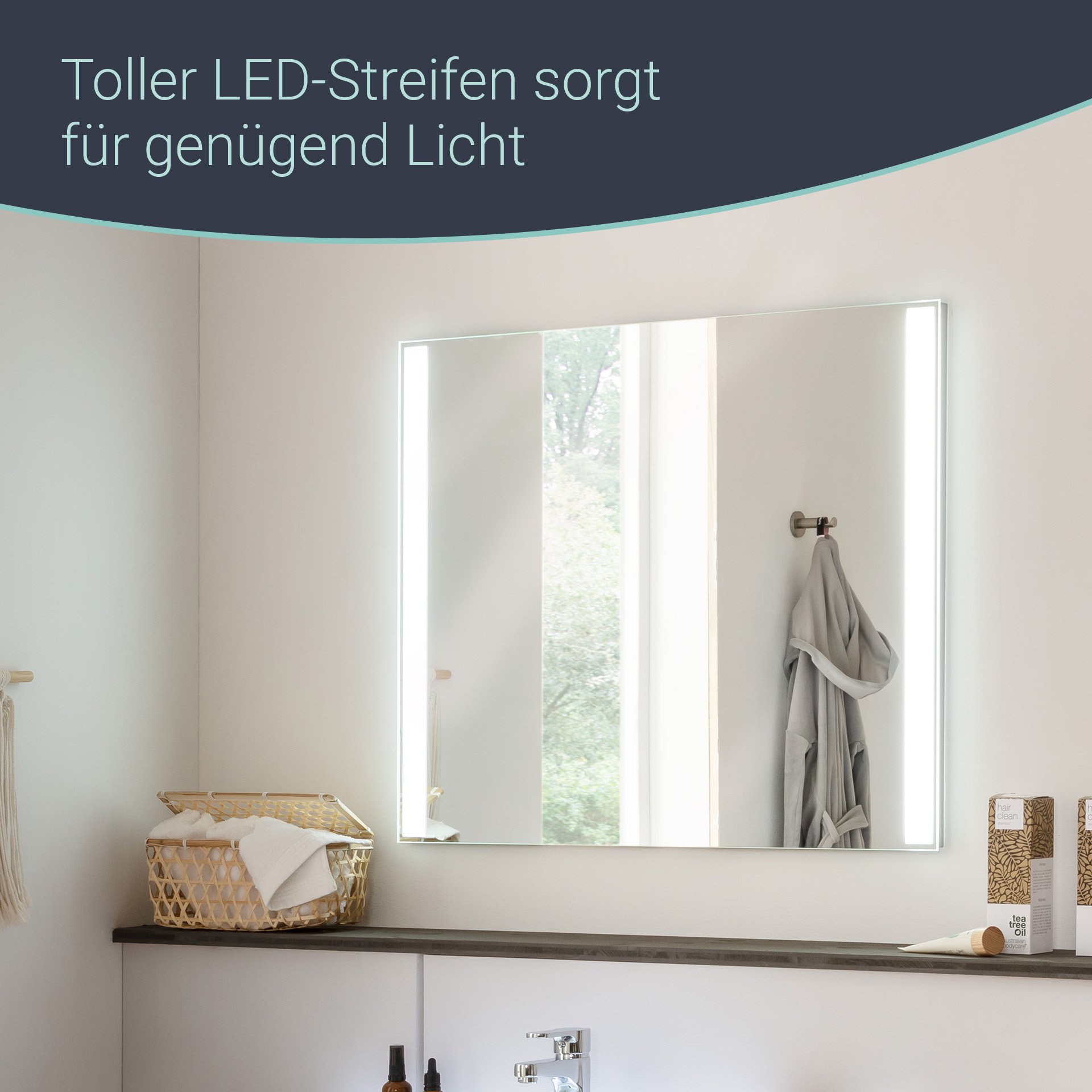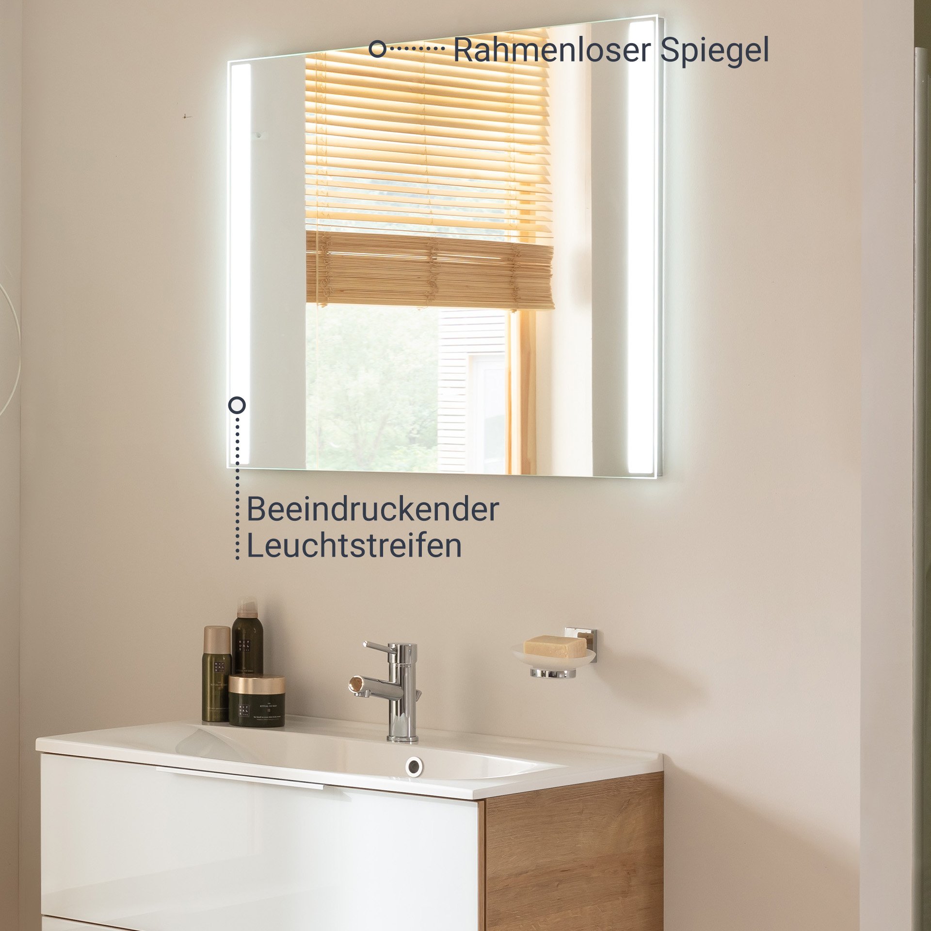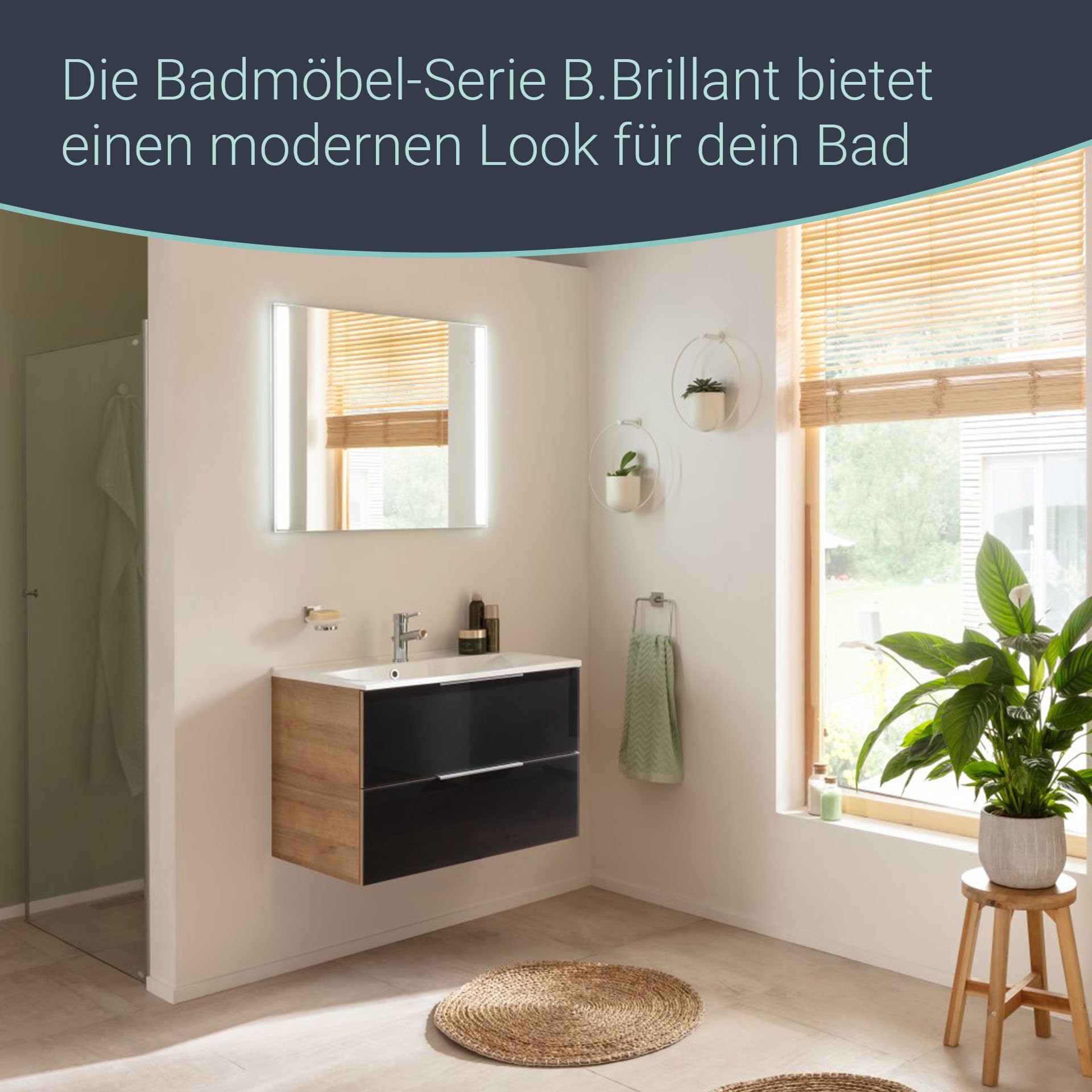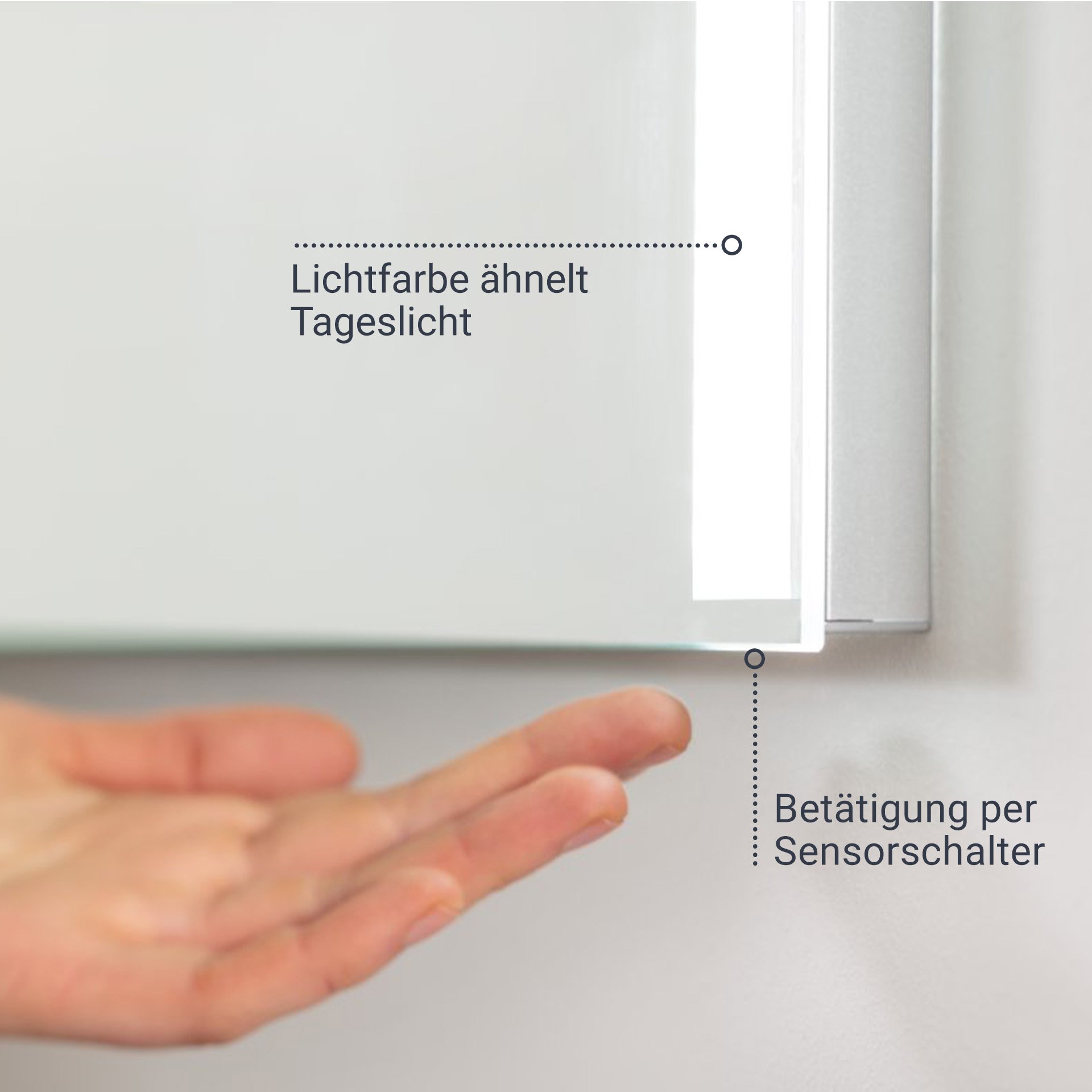 Ein sanfter Fingertipp und schon leuchten die beiden Säulen der LED-Beleuchtung des 80 cm breiten Spiegels. Verantwortlich dafür ist der Sensorschalter an der unteren Seite des Spiegels der Firma Fackelmann. Der moderne LED-Spiegel passt hervorragend zu der Serie B.BRILLANT und unterstützt mit seiner Lichtfarbe, die dem Tageslicht ähnelt, die glänzend lackierte Glasfront der Schränke dieser Serie. Das Licht sorgt dafür, das Farben realitätsnah wiedergegeben werden und das tägliche Pflegeritual zu einem Erlebnis wird. Selbstverständlich ist das Befestigungsset im Lieferumfang enthalten.