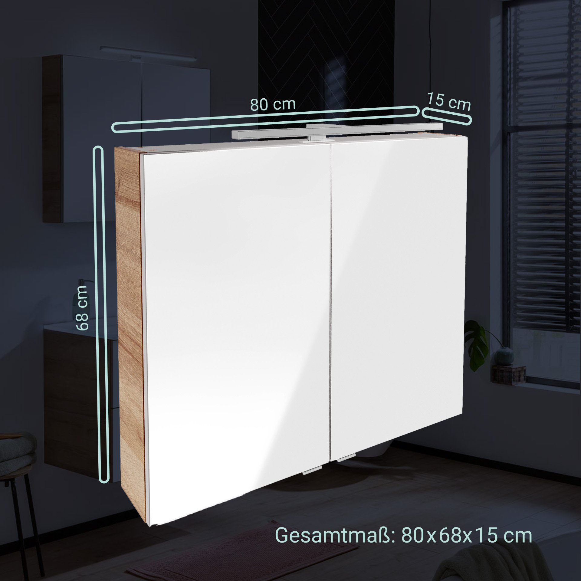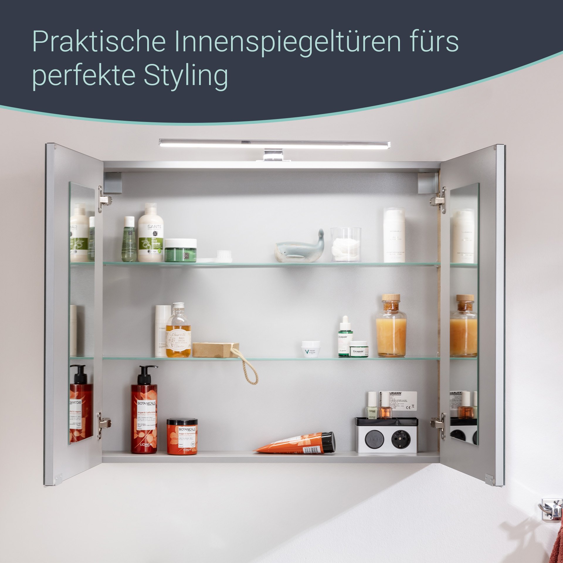 - Ausstattung: 2 Türen mit Innenspiegel, 2 Glasböden, gedämpfte Scharniere, Querteile und Rückwand silbergrau