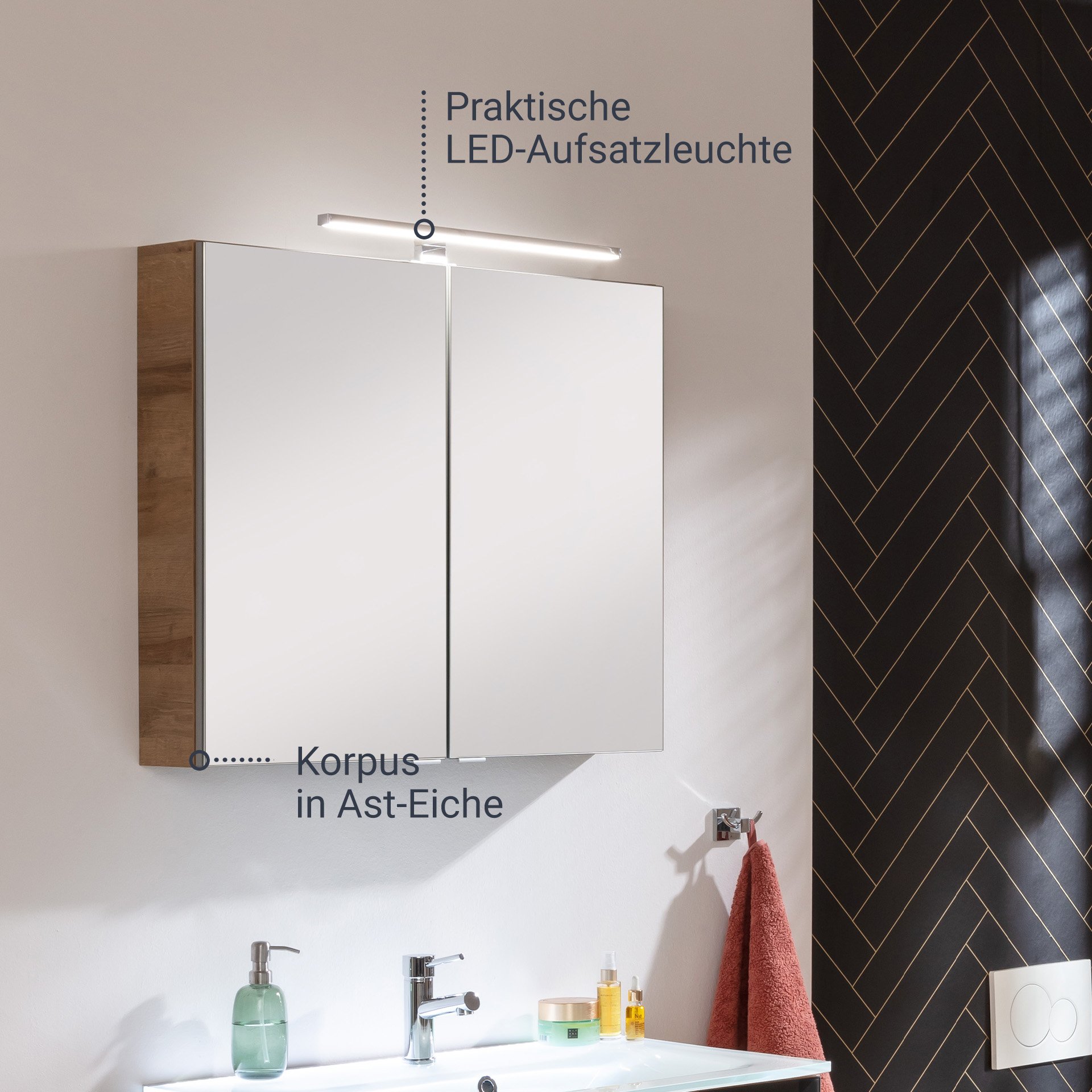 - Design: Korpus Asteiche, Kante Spiegeltür Alu-Optik