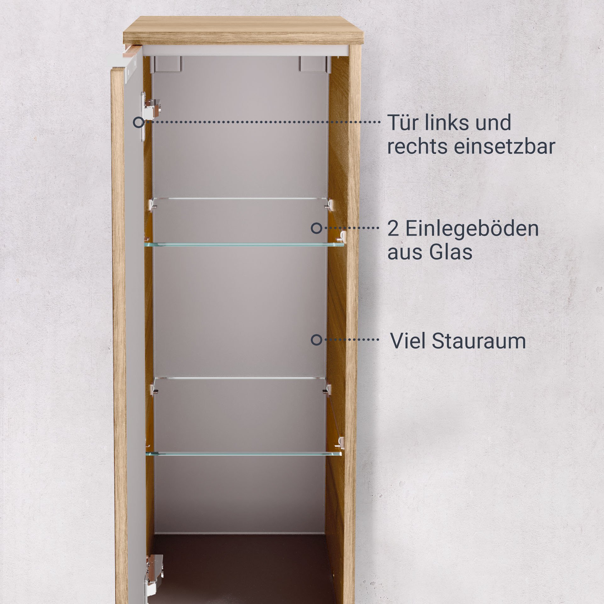 - Ausstattung: 1 Tür, links und rechts einsetzbar, 2 Glaseinlegeböden, 1 Griff Aluminium, gedämpfte Scharniere