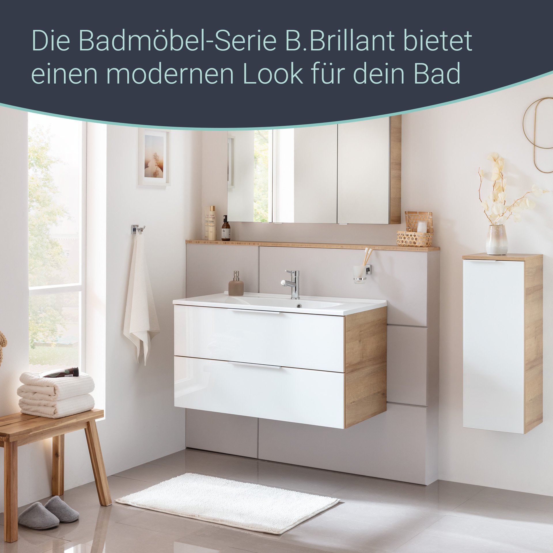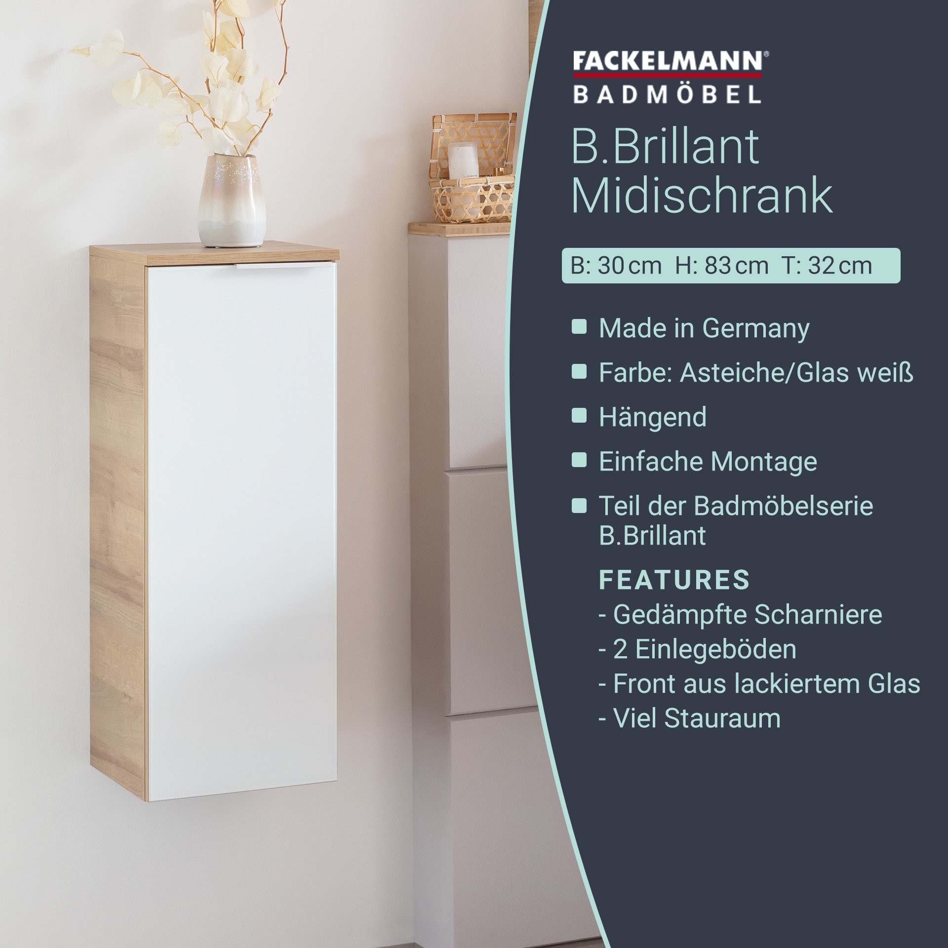 Glänzende Glasfronten verleihen den Möbeln aus der Serie B.BRILLANT von Fackelmann eine atemberaubende Ausstrahlung. Mit dem 82 cm hohen Midischrank mit weißer Glasfront holst Du Dir zusätzlichen Stauraum in Dein Badezimmer. Die Front aus lackiertem Glas bringt Dir Brillanz in Dein neues Bad. 2 Glaseinlegeböden sorgen für Struktur im Inneren des Badschranks. So sind Deine Badaccessoires immer ordentlich aufgeräumt und griffbereit. Da es sich um ein zerlegtes Badmöbel handelt, kannst Du die Tür mit rechten oder linken Türanschlag montieren. Die weiße Front aus lackiertem Glas bildet einen beeindruckenden Kontrast zu dem der Natur angelehnten Korpus in Ast-Eiche. Badmöbel von Fackelmann werden mit viel Liebe zum Detail in Deutschland hergestellt. Der Fackelmann B.BRILLANT Midischrank, 30 cm breit, Weiß Glas/Braun hell ist zerlegt und wird mit einer leicht verständlichen Aufbauanleitung geliefert.