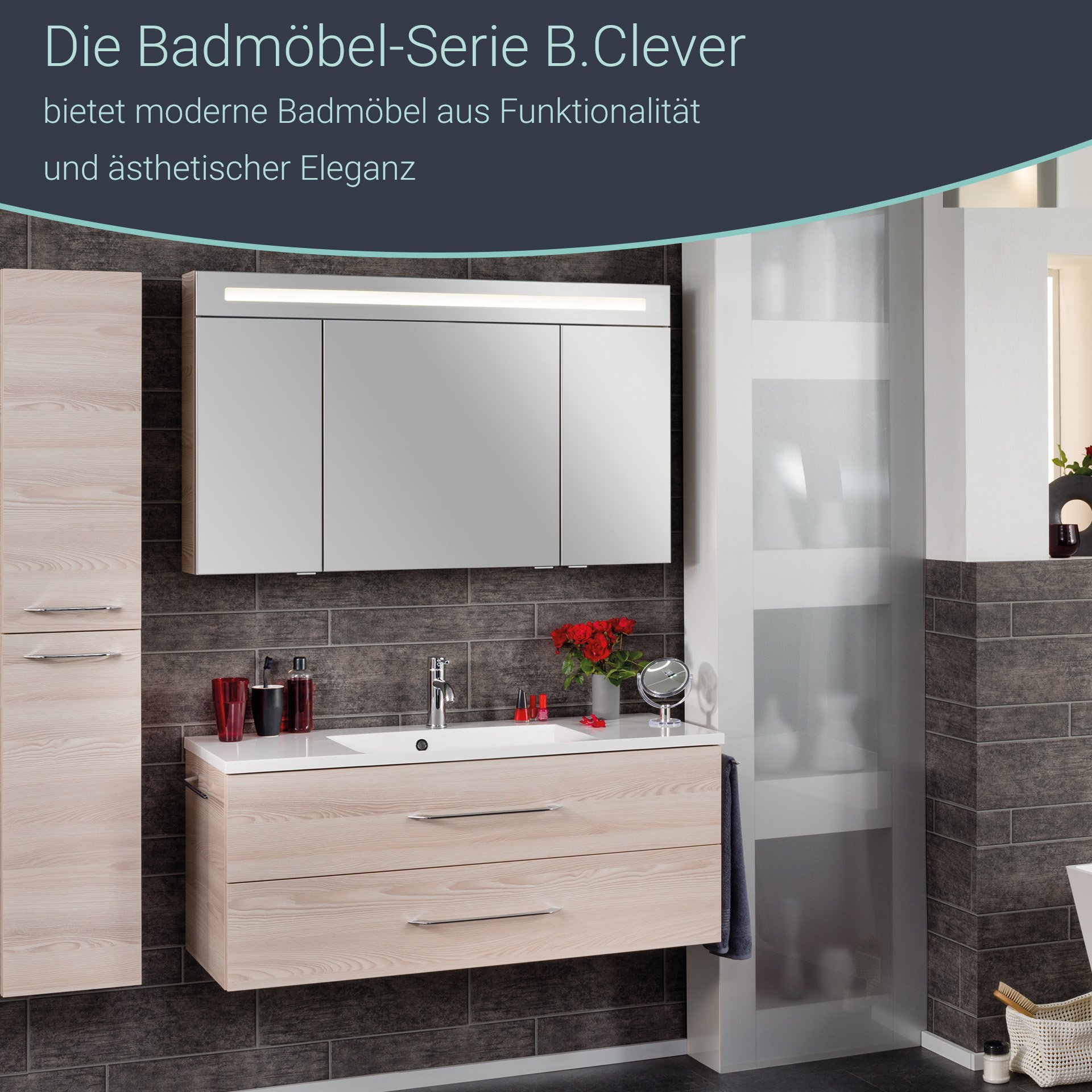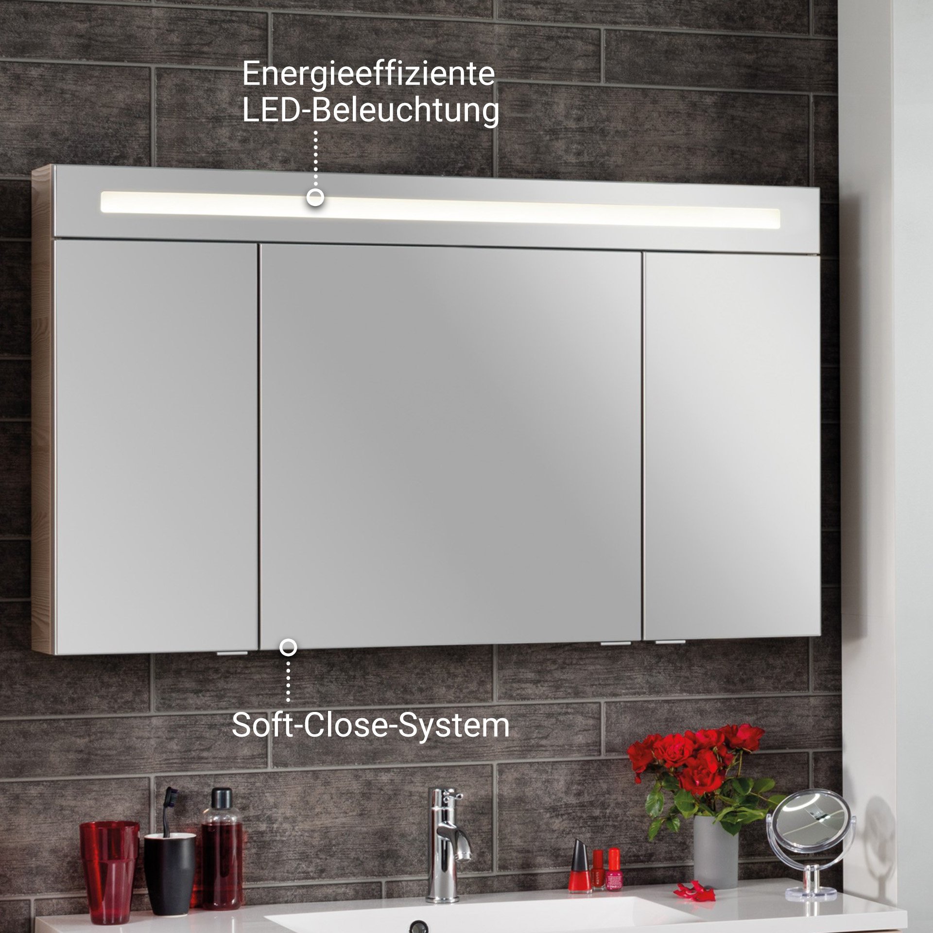 - Besonderheit: Farbtemperatur Kaltweiß, Softclose, Rückwand silbergrau, LED Beleuchtung austauschbar, 3D/180°