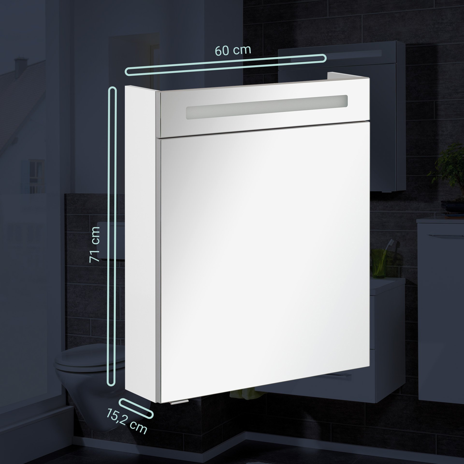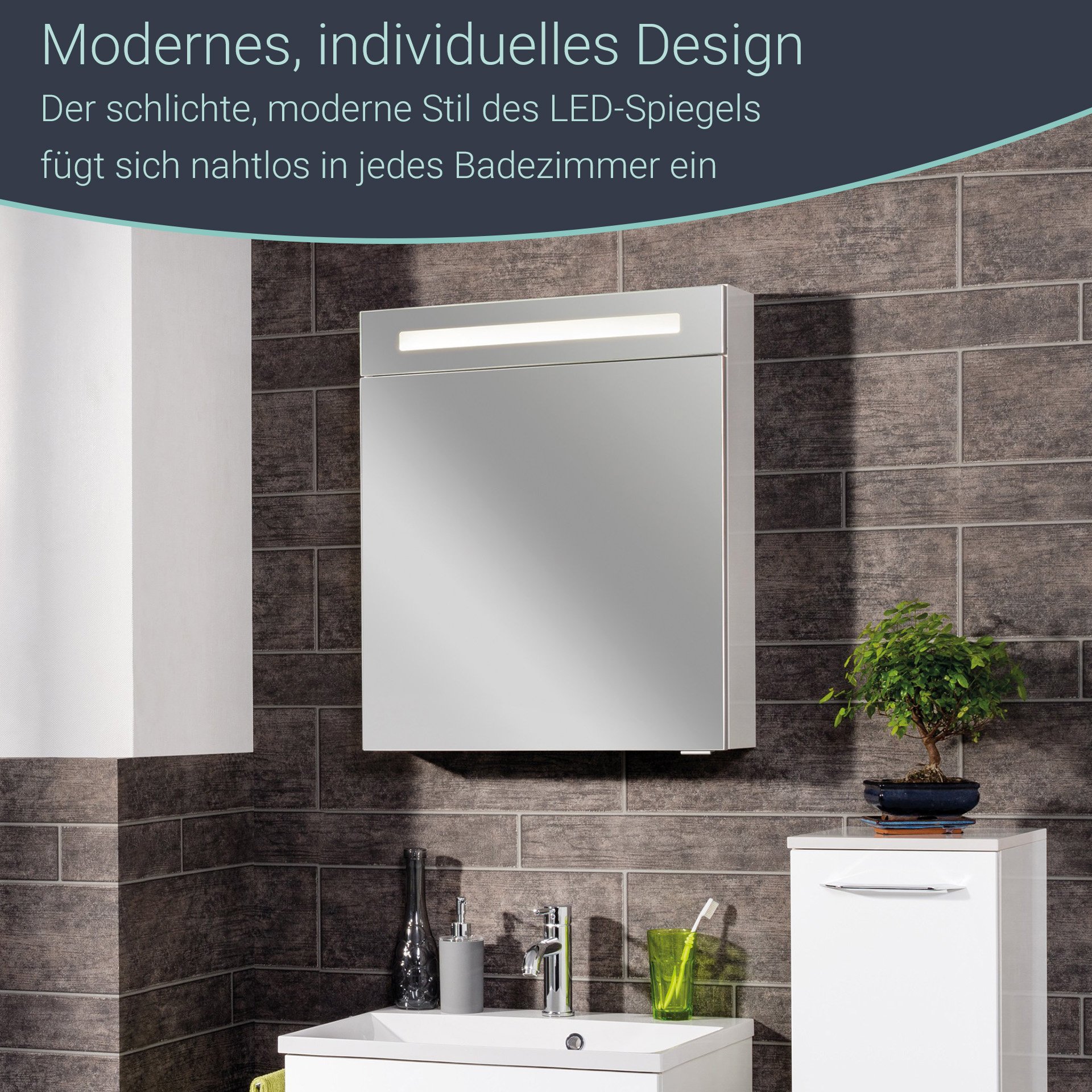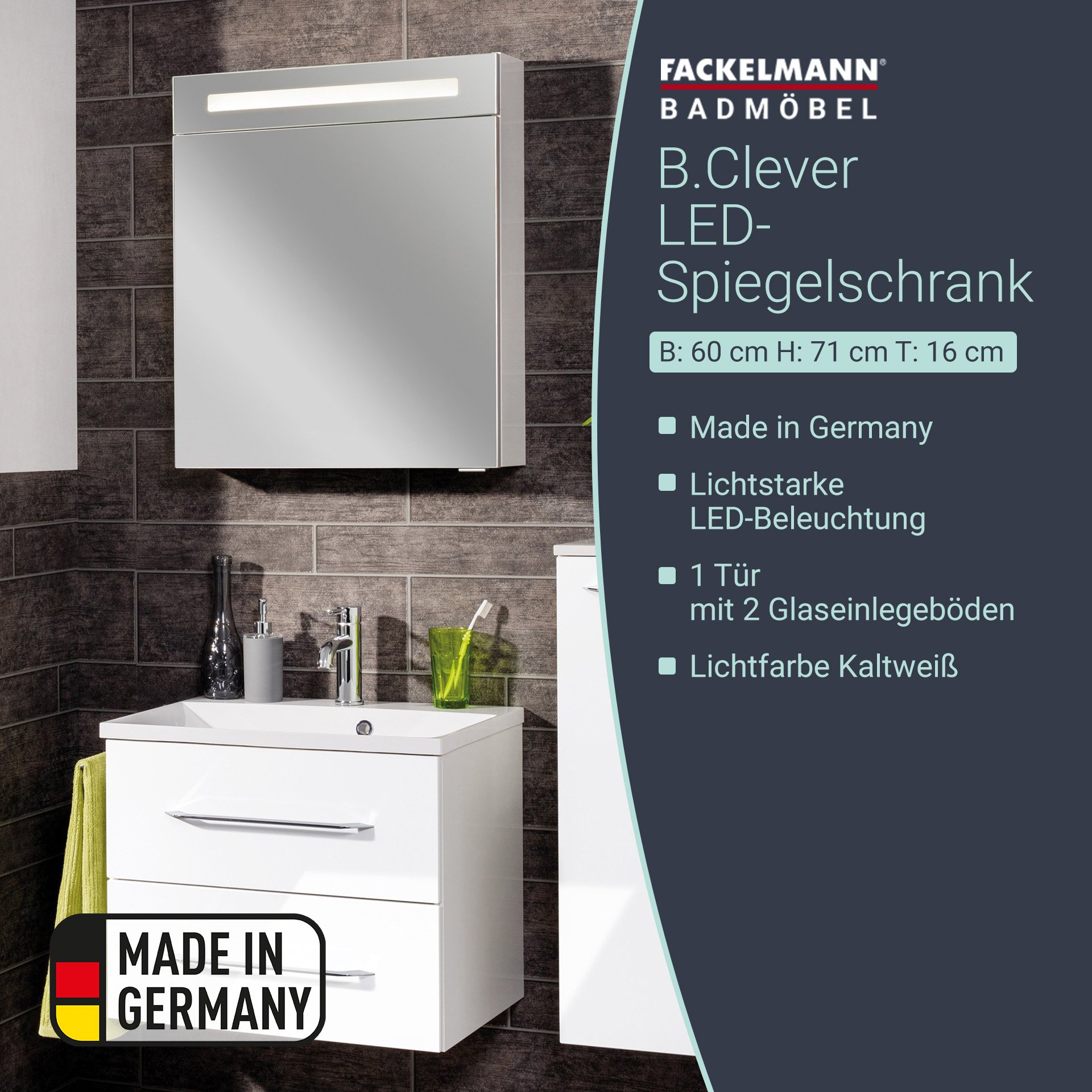 Der moderne LED-Spiegelschrank aus der Serie B.CLEVER von Fackelmann ist mit energiesparender Beleuchtung ausgestattet. Diese besteht aus 60 LEDs mit 4,8 Watt. Das Leuchtmittel ist austauschbar. Der Korpus ist in einem matten Weiß gehalten. Mit seinen zwei Glaseinlegeböden bietet er eine durchdachte Unterteilung des Innenraums und ausreichend Stauraum für Kosmetikartikel. Er hat eine Spiegeltür mit gedämpften Scharnieren. Diese gestatten ein sanftes Schließen. Eine Kante in Alu-Optik, die als Einfassung des Spiegels dient, unterstreicht die Wertigkeit des LED Spiegelschranks. Im Spiegelschrank findest Du einen Schalter und eine Steckdose. Die Badmöbel werden mit viel Liebe zum Detail in Deutschland hergestellt. Eine clevere und leicht verständliche Aufbauanleitung hilft Dir beim Aufbau Deines zerlegten Fackelmann B.CLEVER LED Spiegelschrank 60 cm, Weiß.
