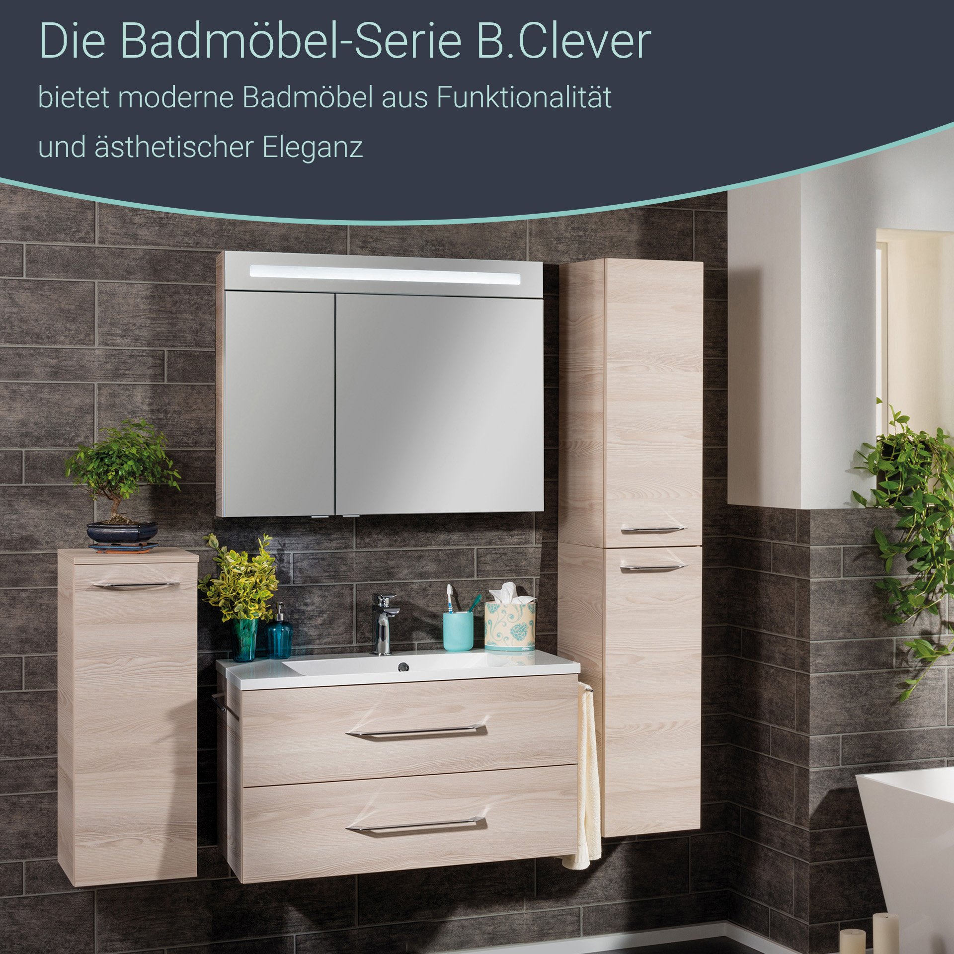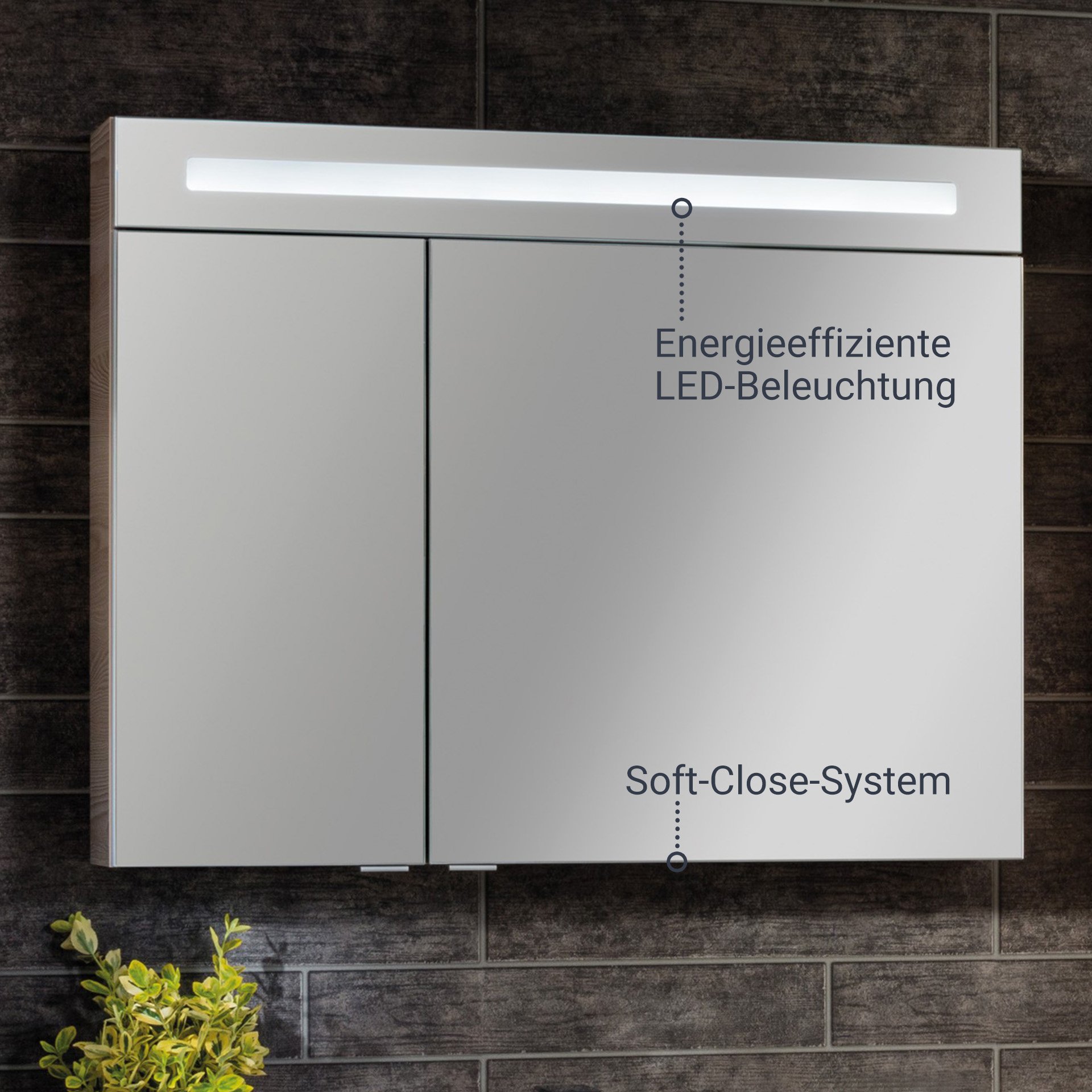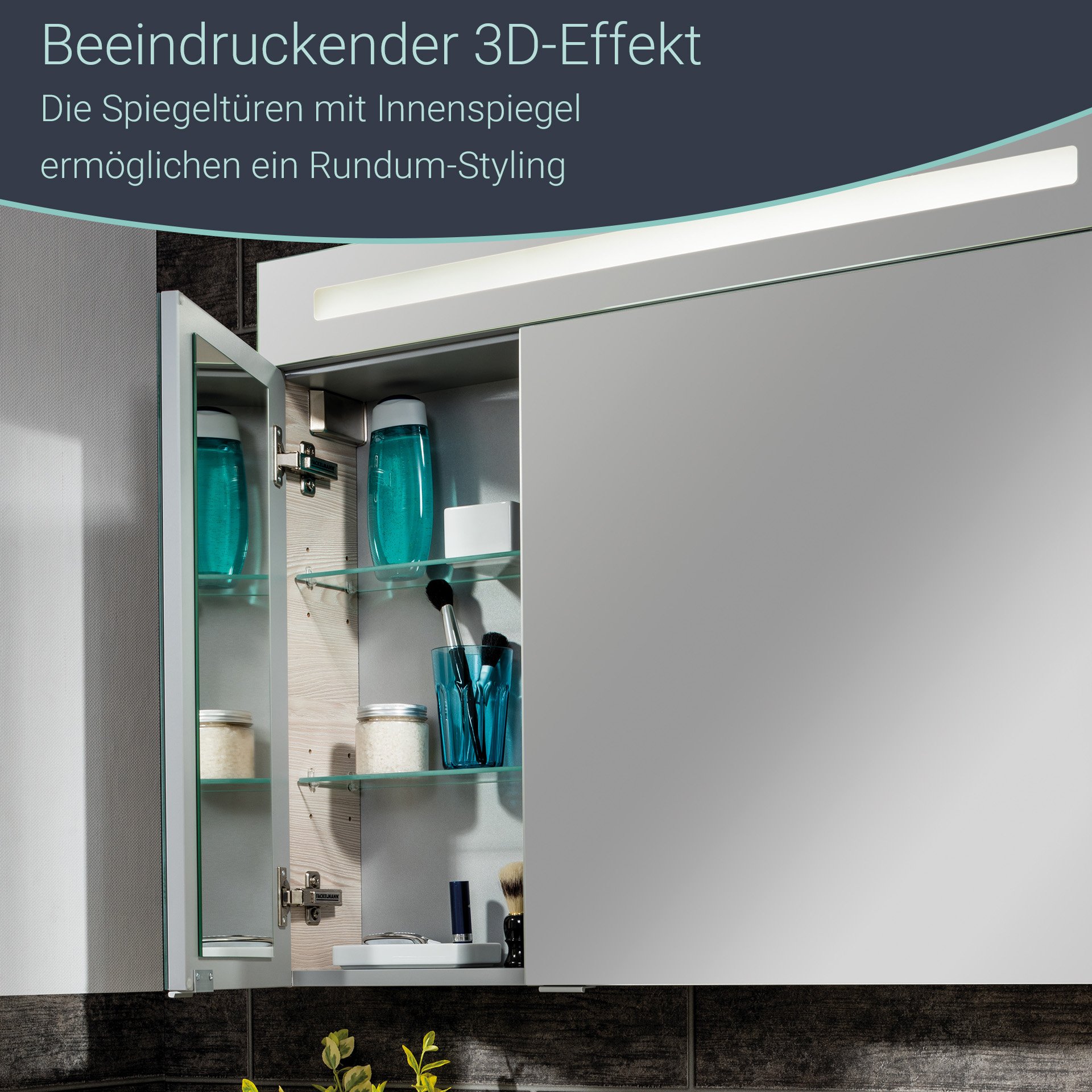 - Besonderheit: Farbtemperatur Kaltweiß, Softclose, Rückwand silbergrau, LED Beleuchtung austauschbar, 3D/180°