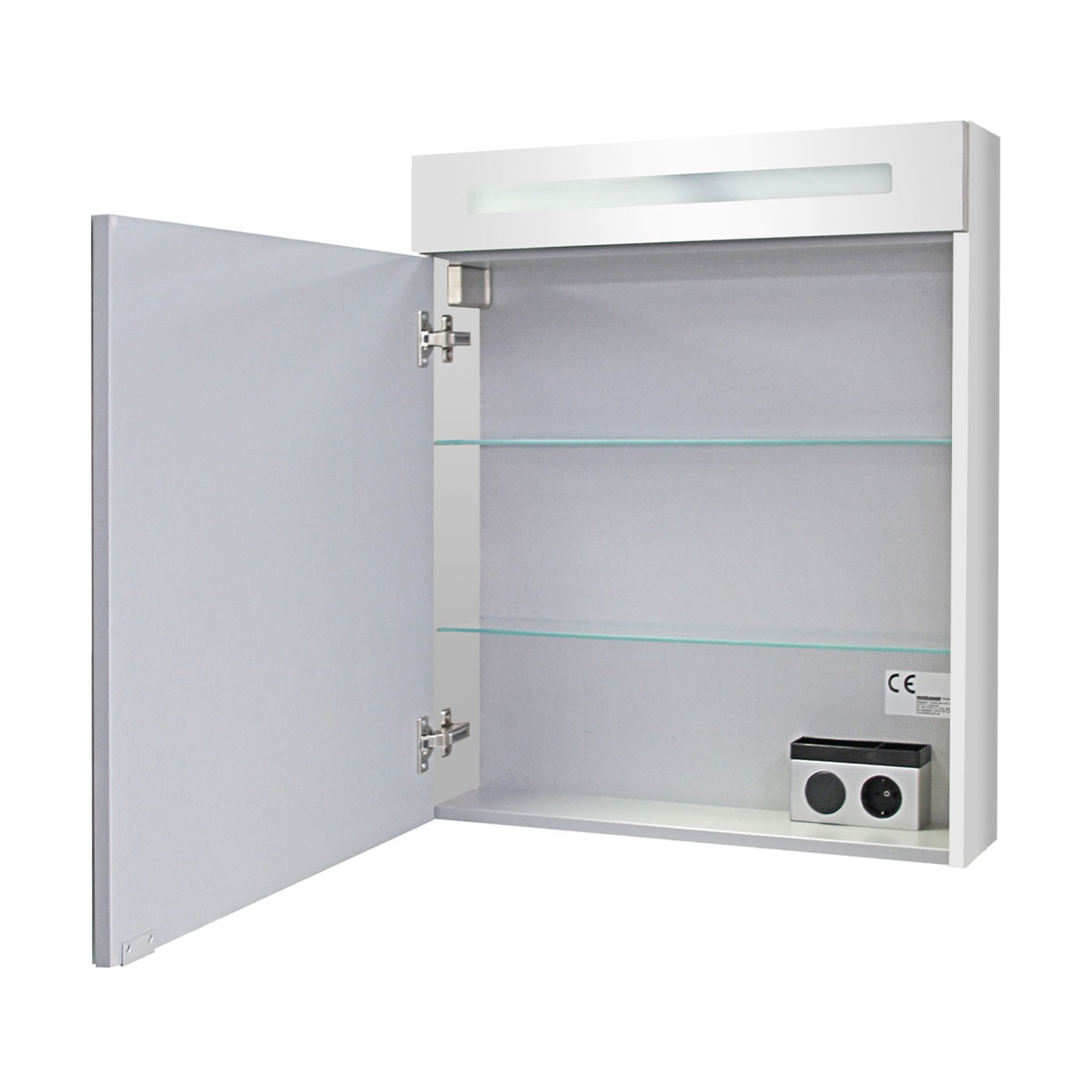 - Ausstattung: energiesparende LED-Beleuchtung (4,8W), 1 Tür mit gedämpften Scharnieren, 2 Glaseinlegeböden, E-Box mit Steckdose und Schalter