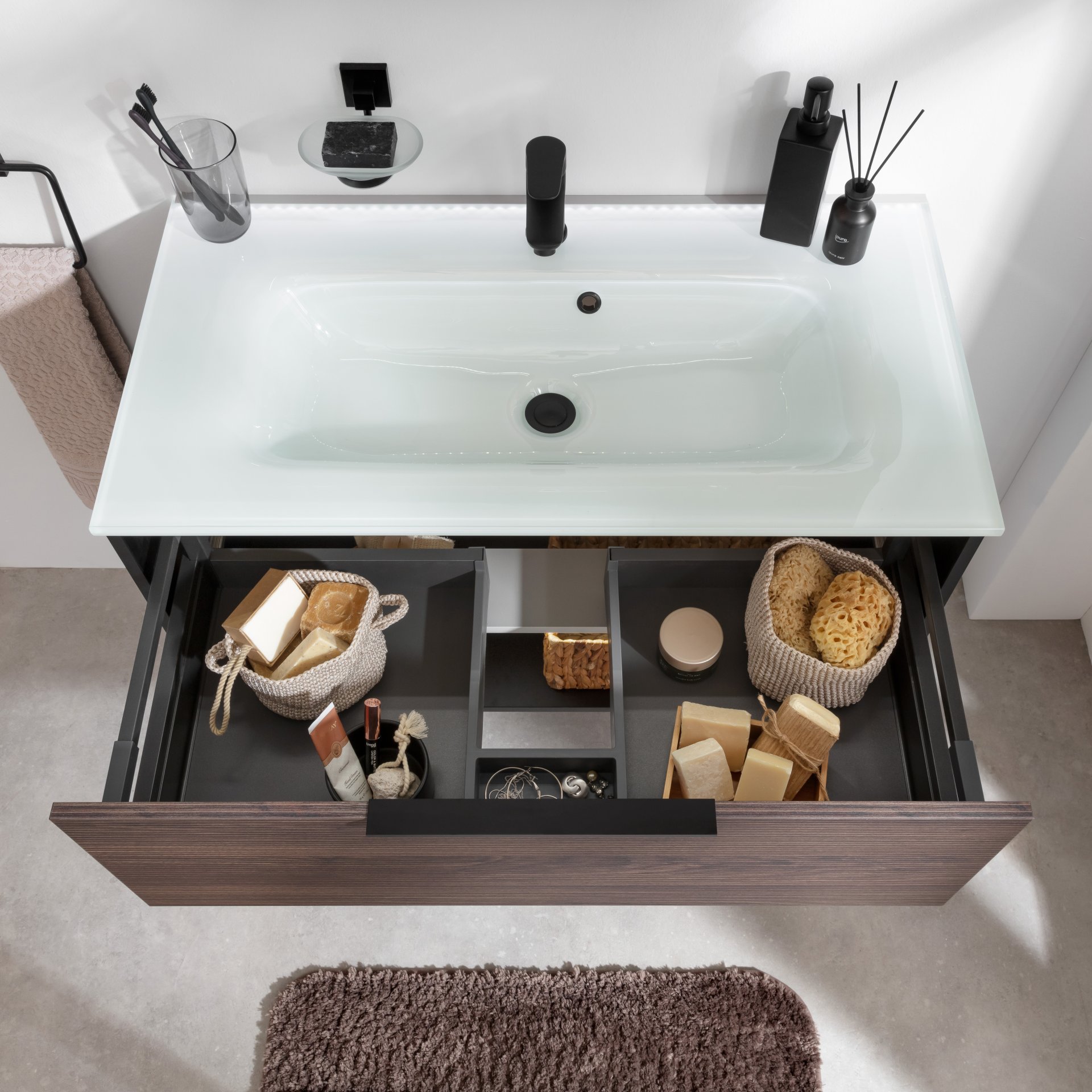 - Ausstattung: 1 Schublade, 1 Ablagefach beleuchtet, 1 Universalkörbchen Textil