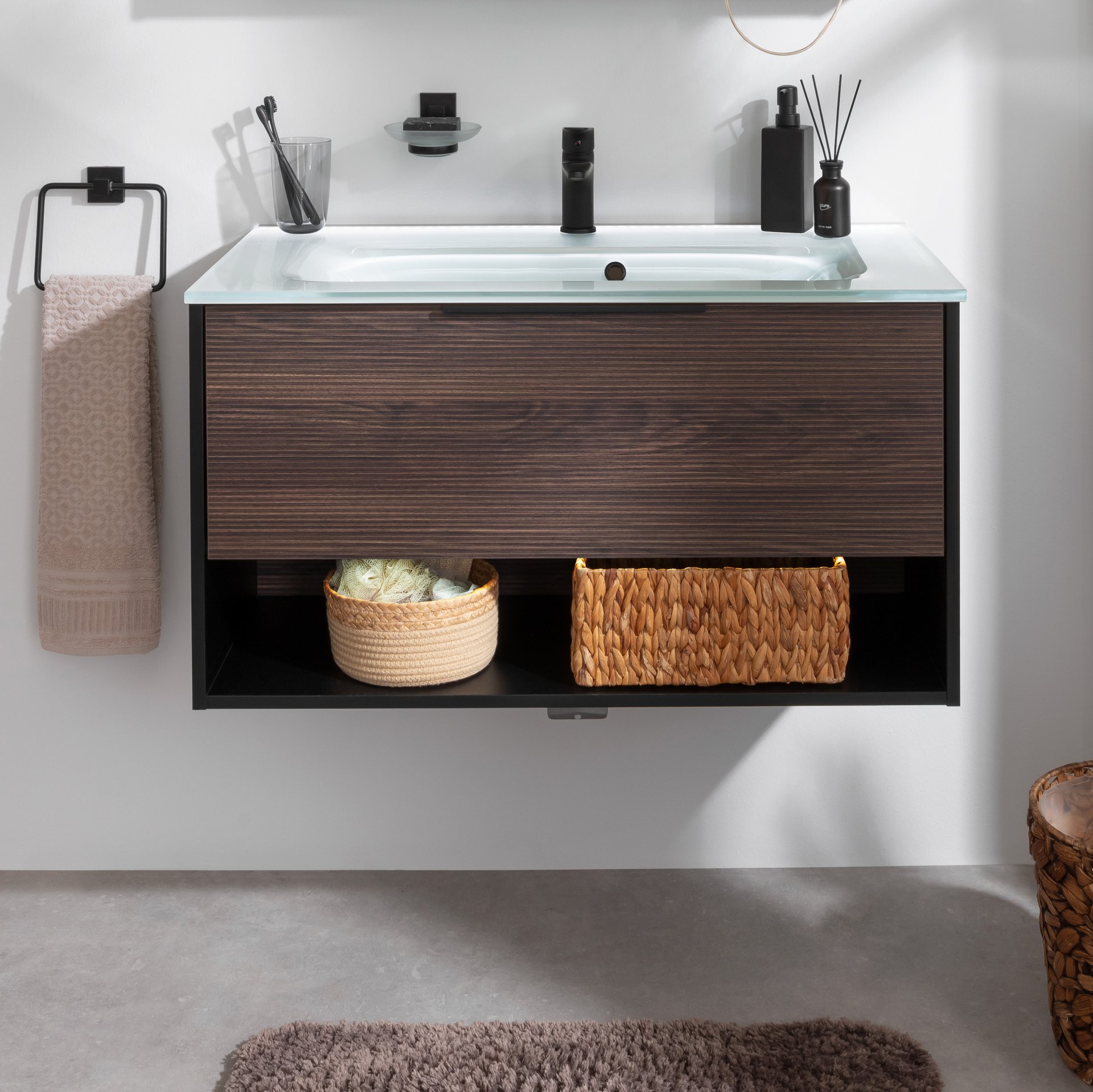 Entdecke die perfekte Kombination aus Funktionalität und modernem Design für Dein Badezimmer. Das 90 cm breite 2-teilige Badmöbelset aus der Serie B.PARIS von Fackelmann besteht aus einem hochwertigen Waschbecken aus Glas und einem modernen Waschtischunterschrank. In eleganter Rigoletto Eiche mit beeindruckender Maserung präsentiert sich die Front und in schlichtem mattem Schwarz der Korpus. Der Unterschrank beeindruckt durch seine geräumige Schublade mit Soft-Close System und einem offenen Ablagefach. Ein batteriebetriebener Bewegungsmelder mit Sensor illuminiert das Ablagefach unter der Schublade. Er wird automatisch an- und ausgeschaltet. Zusätzlichen, praktischen Stauraum bietet das schwarze faltbare Universalkörbchen aus Textil für kleinere Badaccessoires. Solltest Du zusätzlichen Stauraum benötigen kannst Du weitere Körbchen ergänzen. Das Waschbecken aus Glas ist nicht nur ein Blickfang, sondern durch sein hochwertiges Material prädestiniert für eine langlebige Ästhetik. Es ist hygienisch, leicht zu reinigen und unterstreicht die Schönheit Deines neuen Badezimmers. Du kannst Dein Waschbecken mit der Glas-Waschtisch Beleuchtung (Art.Nr. 77450) in Szene setzen (nicht im Lieferumfang enthalten). Badmöbel von Fackelmann werden mit viel Liebe zum Detail in Deutschland hergestellt. Das Fackelmann B.PARIS Badmöbel Set 2-teilig 90 cm breit, Braun dunkel/Schwarz, Glas weiß ist bereits vormontiert. Damit ist die Montage denkbar einfach und Du kannst Dein Badezimmer schnell und ohne großen Aufwand umgestalten.