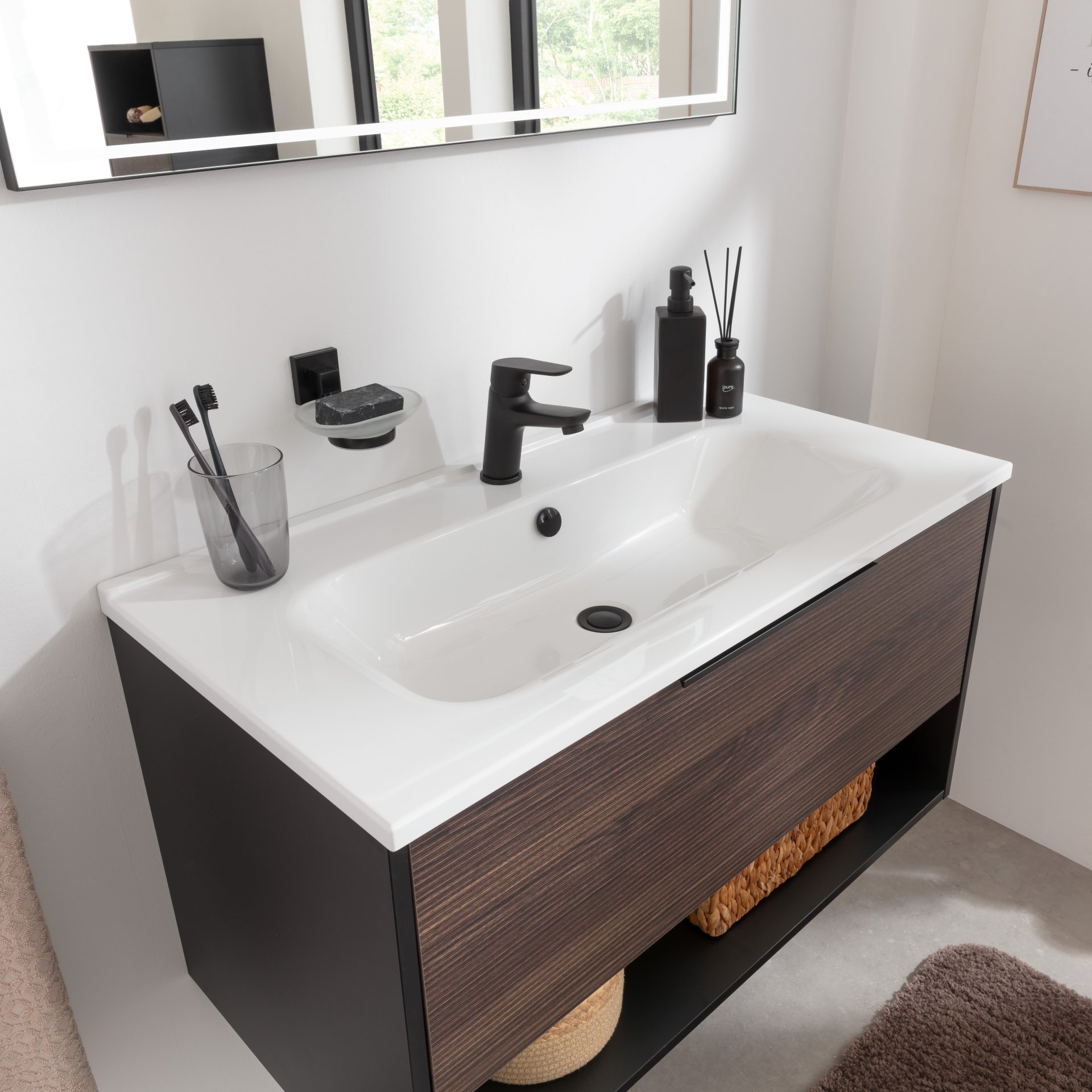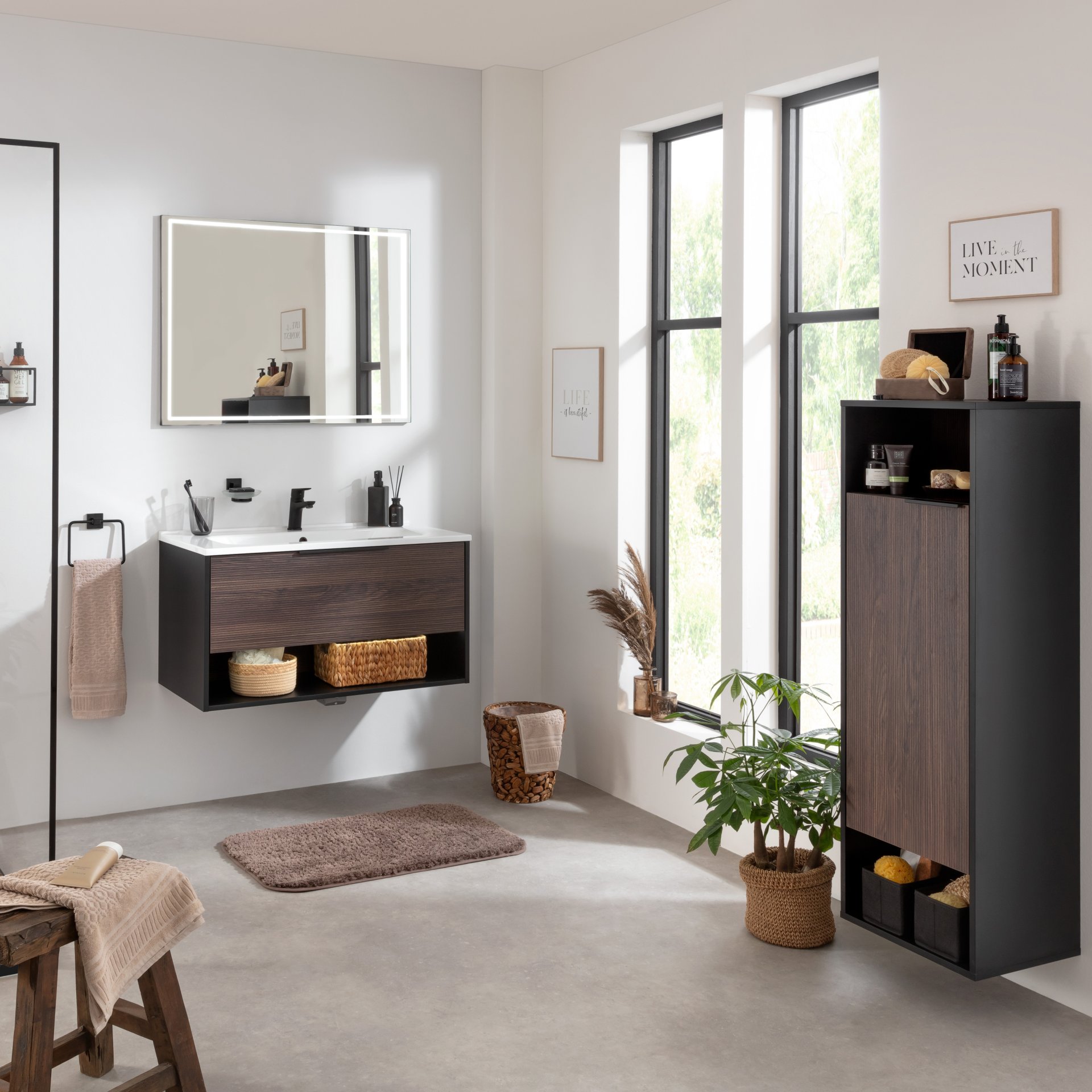 Entdecke die perfekte Kombination aus Funktionalität und modernem Design für Dein Badezimmer. Das 90 cm breite 2-teilige Badezimmer Set aus der Serie B.PARIS von Fackelmann, bestehend aus Waschtischunterschrank und einem Waschtisch aus Gussmarmor verleiht Deinem Bad zeitlose Eleganz. Der moderne Unterschrank präsentiert sich mit einer Front in eleganter Rigoletto Eiche mit beeindruckender Maserung und einem Korpus in mattem Schwarz. Seine geräumige Schublade beeindruckt mit viel Stauraum. Unter der Schublade mit Soft-Close System befindet sich ein offenes, beleuchtetes Ablagefach. Gesteuert von einem batteriebetriebener Bewegungsmelder mit Sensor, der das Ablagefach illuminiert. Das Licht schaltet sich beim Betreten des Bades automatisch ein und beim Verlassen nach zirka 30 Sekunden wieder aus. Praktischen Stauraum bietet das schwarze, faltbare Körbchen aus Textil, das genau ins Ablagefach passt. Kleine Badaccessoires können hier ideal untergebracht werden. Falls zusätzlicher Platz erforderlich ist, kannst Du weitere Körbchen bestellen. Ein Waschtisch aus pflegeleichten Gussmarmor ergänzt den Unterschrank ideal und bringt viele Vorteile mit sich. Gussmarmor zeichnet sich seine glatte, porenfreie Oberfläche aus, die sehr widerstandsfähig ist. Badmöbel von Fackelmann werden mit viel Liebe zum Detail in Deutschland hergestellt. Das Fackelmann B.PARIS Badmöbel Set 2-teilig 90 cm breit, Braun dunkel/Schwarz, Gussmarmor ist bereits vormontiert. Damit ist die Montage denkbar einfach und Du kannst Dein Badezimmer schnell und ohne großen Aufwand umgestalten.