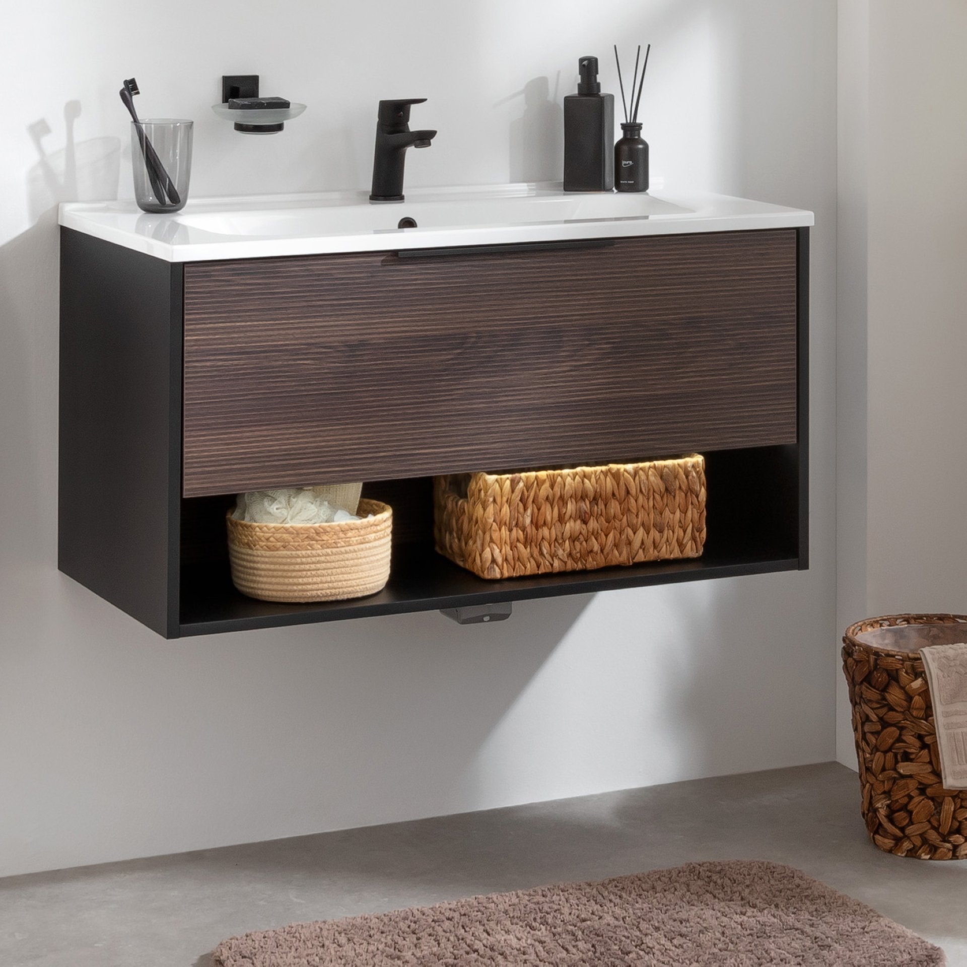 Fackelmann B.PARIS Badmöbel Set 2-teilig 90 cm breit, Braun dunkel/Schwarz, Gussmarmor