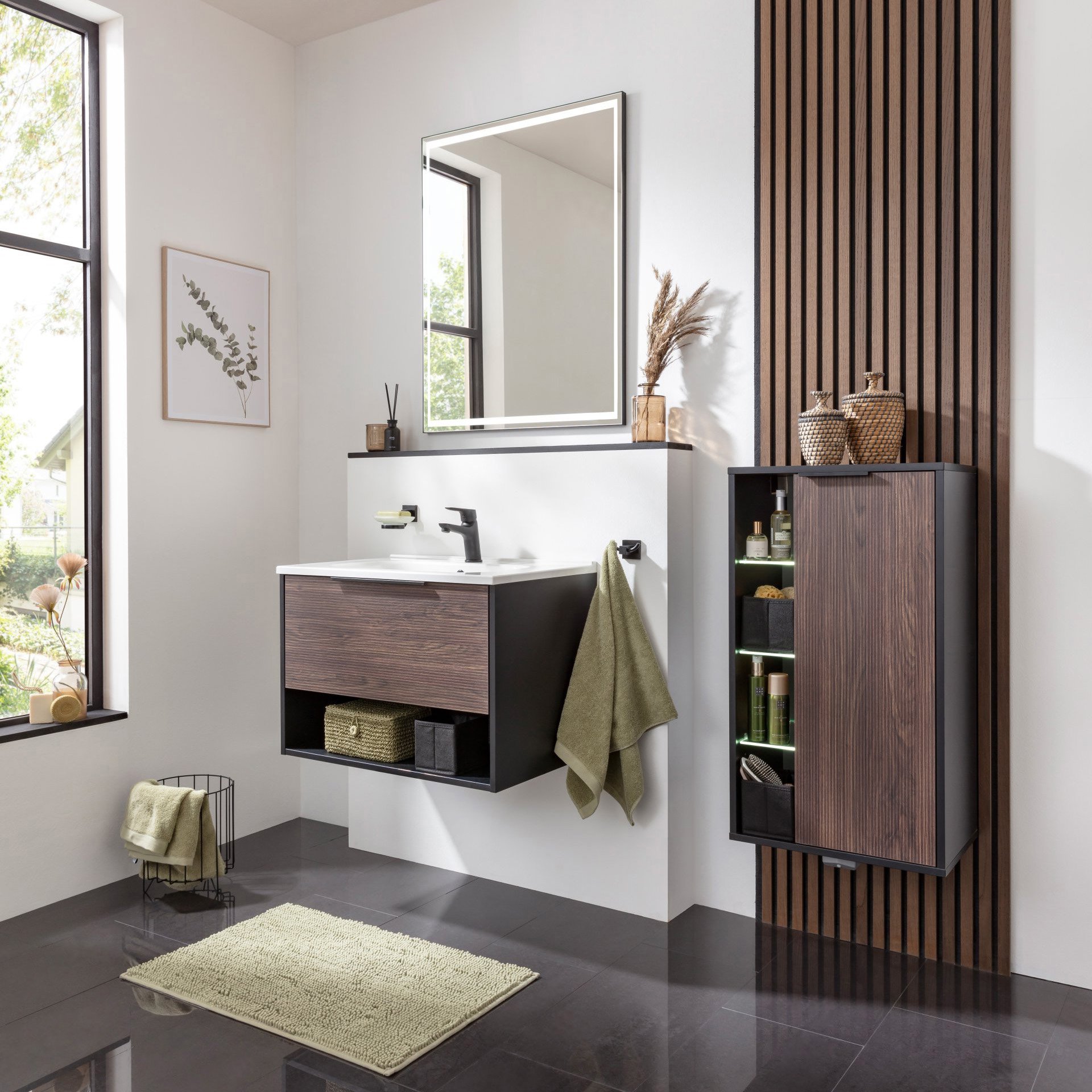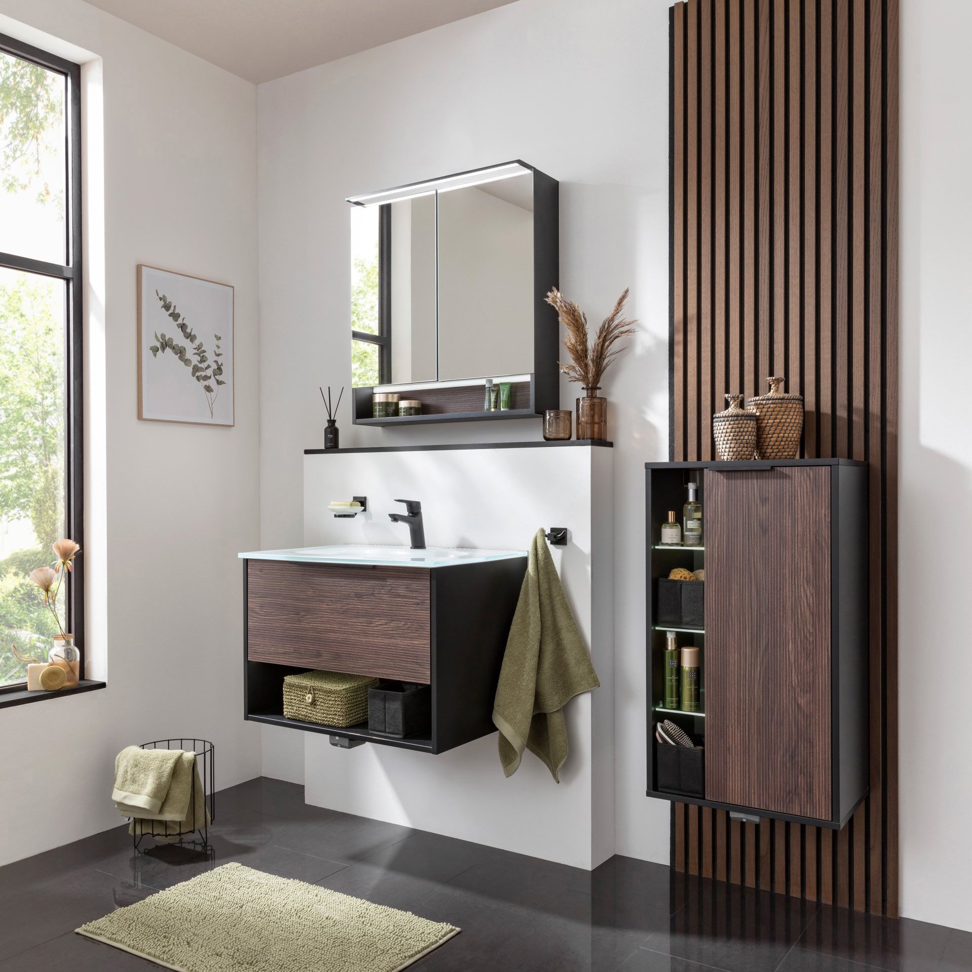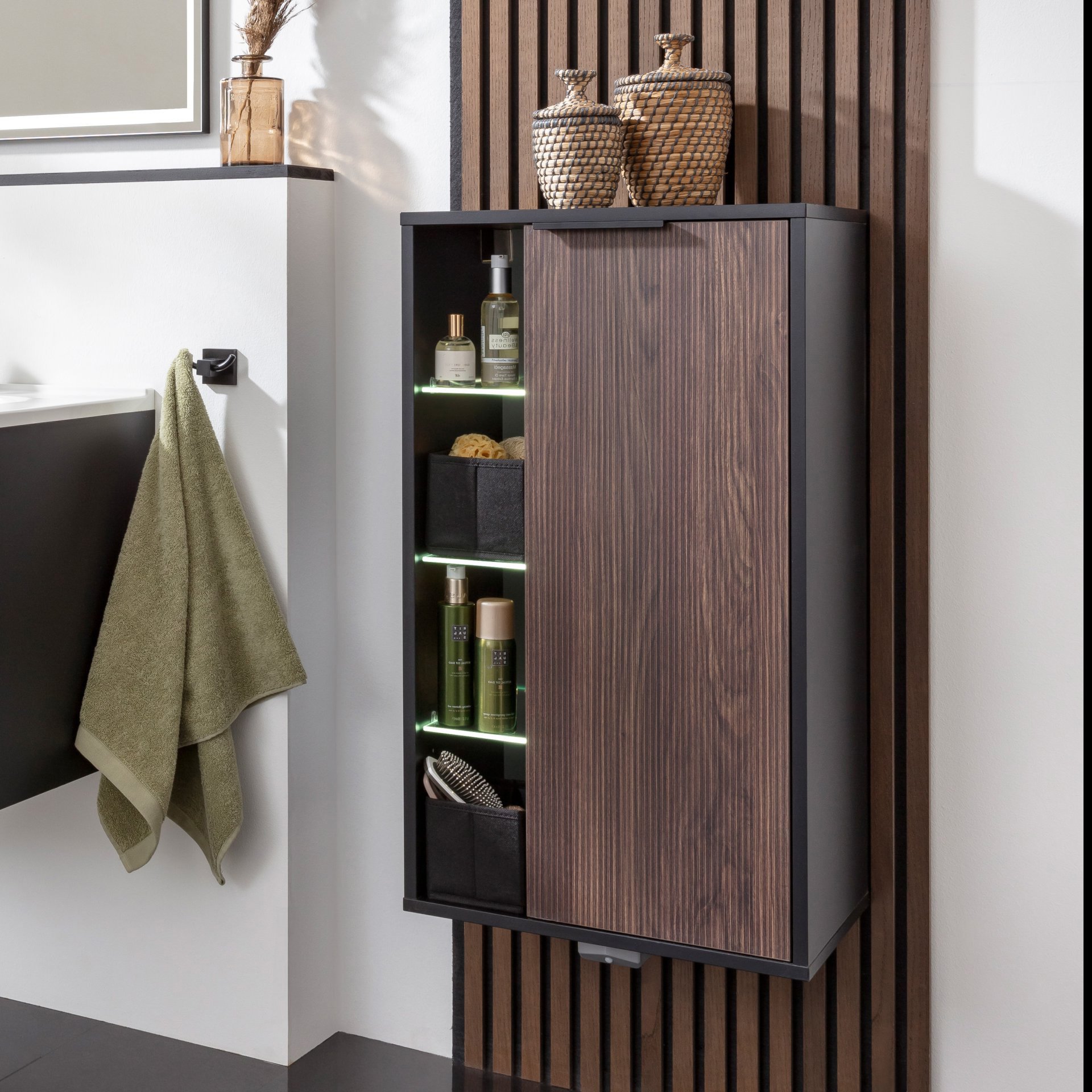 Optimiere Dein Badezimmer mit dem eleganten 47 cm breiten Midischrank aus der Serie B.PARIS von Fackelmann. Dieser Schrank ist ein perfekter Mix aus Funktionalität und modernem Design. Der Korpus in mattem Schwarz verleiht dem Badschrank ein ästhetisches und zeitloses Aussehen, während die Front in Rigoletto Eiche eine warme und einladende Atmosphäre schafft. Die sechs Glaseinlegeböden bieten reichlich Platz für Deine Badutensilien. Die integrierte Beleuchtung der drei offenen Einlegeböden ist nicht nur praktisch, sondern auch ein visueller Blickfang. Sie sorgt dafür, dass der Inhalt des Regals immer gut sichtbar ist und ansprechend präsentiert wird. Besonders in dunkleren Räumen oder bei schwachem Licht ist das von Vorteil. Die Beleuchtung wird durch einen batteriebetriebenen Bewegungsmelder mit Sensor automatisch ein- und ausgeschaltet. Durch den rechten Türanschlag lasst sich der Schrank leicht in die meisten Raumkonzepte mühelos einfügen. Gedämpfte Scharniere schließen die Tür sanft. Badmöbel von Fackelmann werden mit viel Liebe zum Detail in Deutschland gefertigt. Der Fackelmann B.PARIS Midischrank 47 cm breit, Braun dunkel/Schwarz, Anschlag rechts ist vormontiert und denkbar einfach in Deinem Badezimmer zu integrieren.