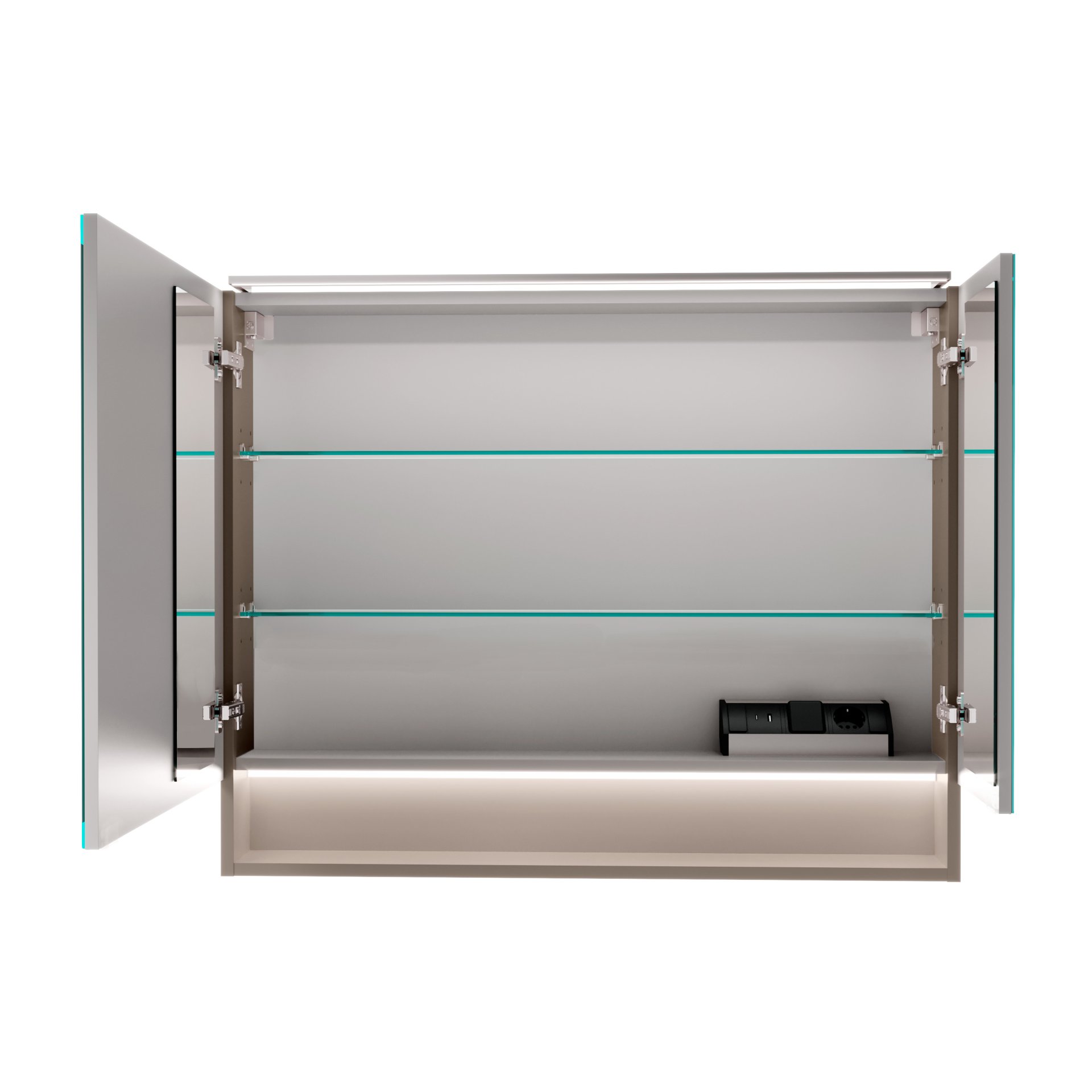 - Ausstattung: 2 Türen mit Innenspiegel, 2 Glaseinlegeböden, Elektrobox mit Schalter/Steckdose, LED-Aufsatzleuchte, Kante Spiegeltür Alu-Optik