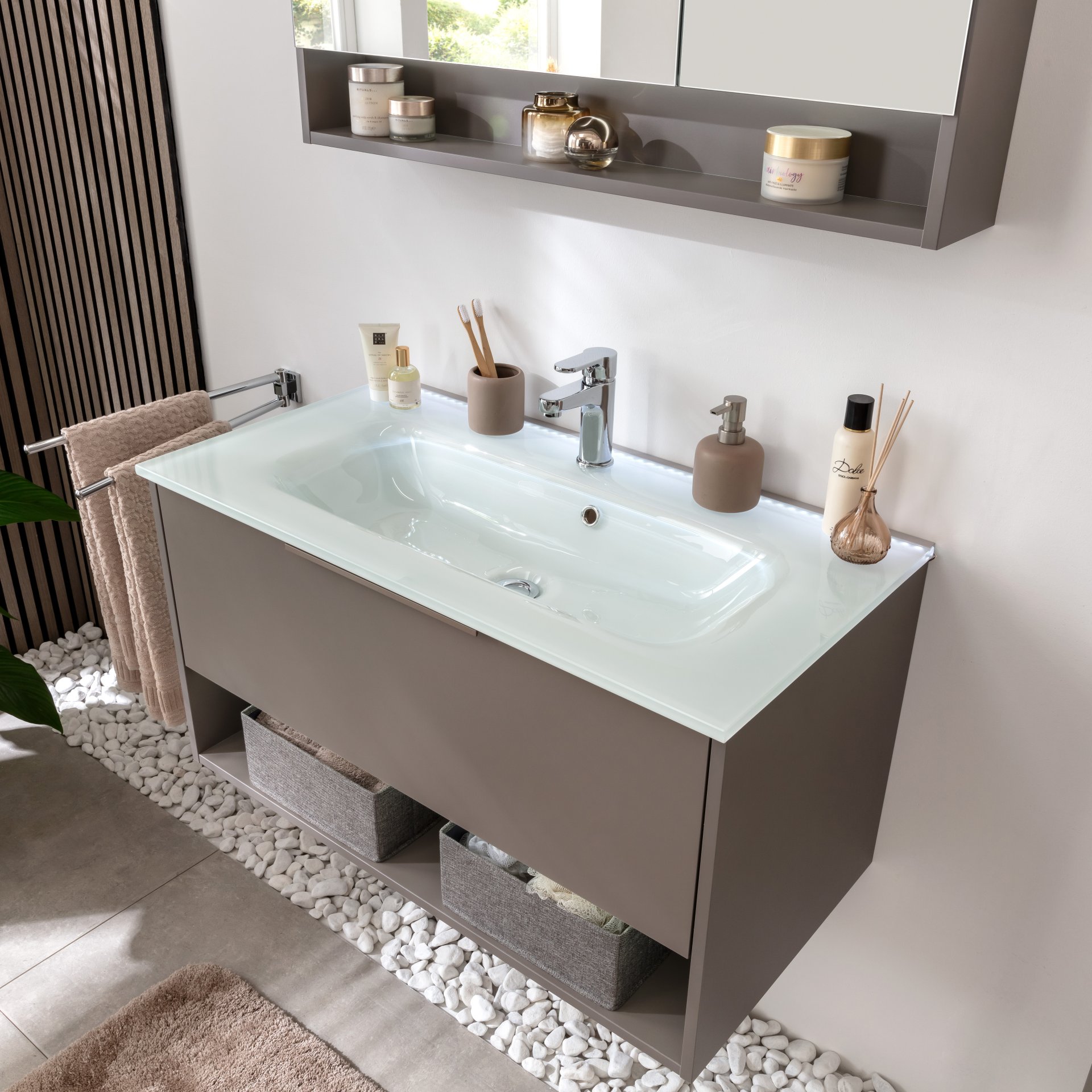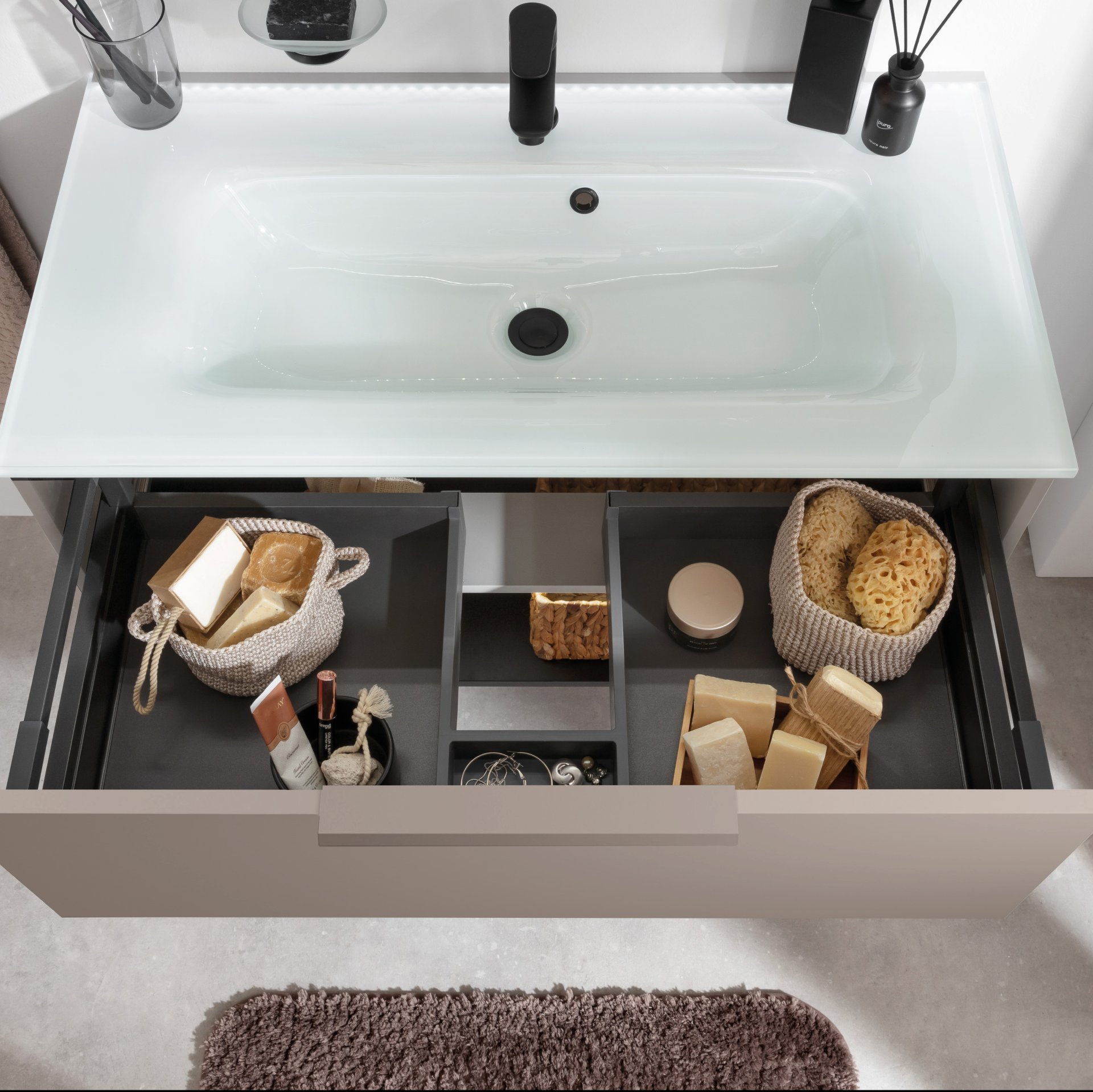 - Ausstattung: 1 Schublade, 1 Ablagefach beleuchtet, 1 Universalkörbchen Textil