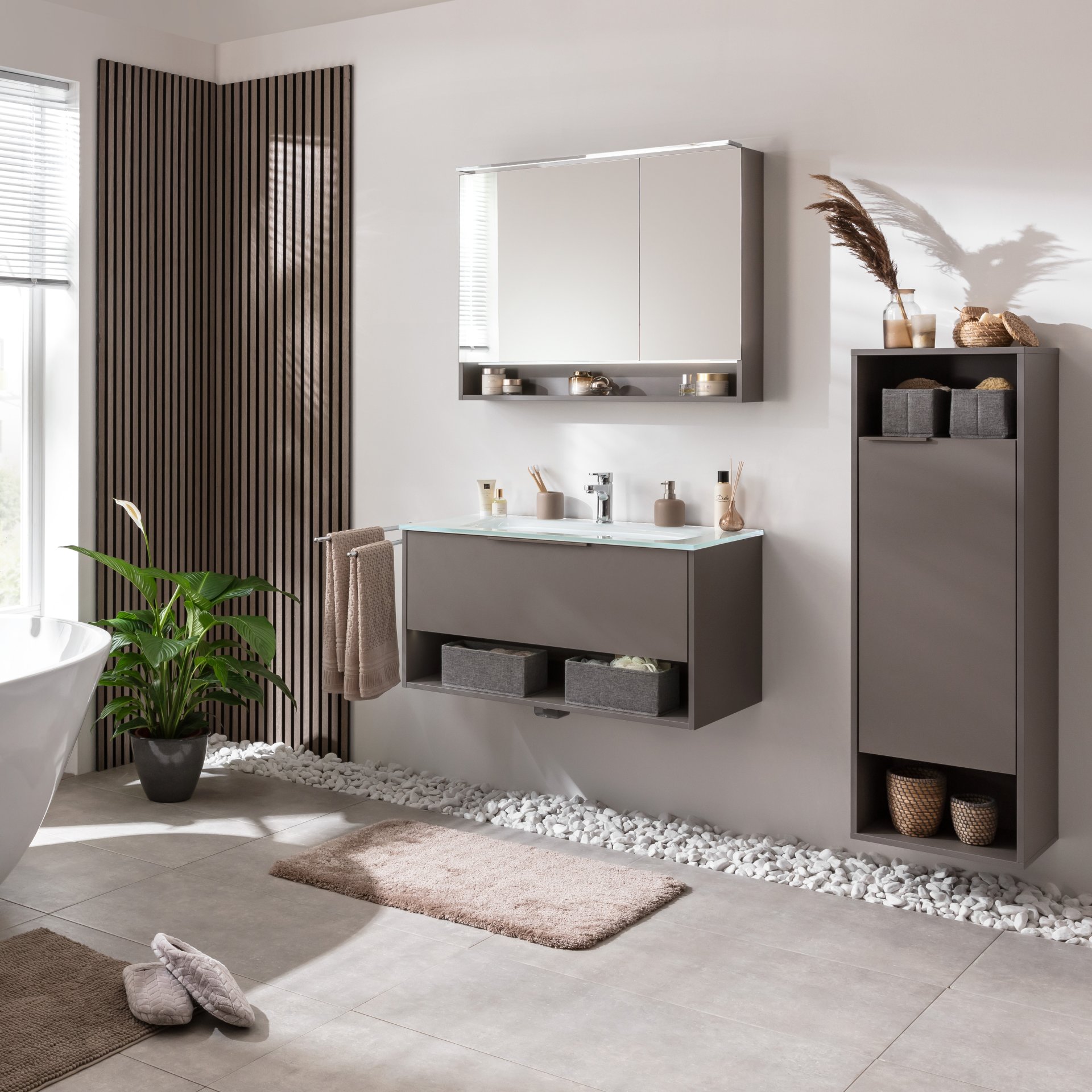 Du brauchst eine Spiegelfläche, die Dich begeistert und exquisiten Stauraum für Deine Kosmetikartikel bietet? Dann hast Du mit dem 3- teiligen Fackelmann B.PARIS Waschtisch Set mit Spiegelschrank genau das Passende gefunden. Neben dem clever strukturierten Stauraum im Spiegelschrank bringt das Ensemble harmonisch aufeinander abgestimmt klare Formen und modernes Design in Dein Bad. Mit der eleganten Farbwahl Cubanit Grau zieht Eleganz in Dein Badezimmer. Dieser Farbton lässt sich harmonisch mit Holz oder Grünpflanzen kombinieren. Reizvoll ist der Kontrast mit dem weißen Waschbecken aus Glas. Seine Oberfläche eignet sich perfekt für den täglichen Gebrauch und strahlt einen Hauch Luxus aus. Sie ist pflegeleicht, hygienisch und langlebig. Der Waschbeckenunterschrank mit seiner Breite von 90 cm in beruhigendem Grau bietet in der Schublade viel Platz für Deine Pflegeprodukte. Besonders beeindruckend ist das beleuchtete Ablagefach. Es wird durch den integrierten Bewegungsmelder beim Betreten des Bades automatisch aktiviert. So entsteht eine stimmungsvolle Atmosphäre, die besonders in der Dunkelheit zusätzliche Sicherheit vermittelt. Formvollendet rundet der 90 cm breite Spiegelschrank oberhalb des Badsets das Ensemble ab. Eine perfekte Wahl, um eine behagliche Atmosphäre zu schaffen. Zwei Türen mit Innenspiegeln unterstützen Dich beim täglichen Pflegeritual. Im Inneren sorgen die beiden Glaseinlegeböden für eine clevere Unterteilung und Deine Badaccessoires sind immer griffbereit. Ein besonderer Blickfang ist das beleuchtete Ablagefach im unteren Teil des Spiegelschranks. Das FACKELMANN B.PARIS Waschtisch Set mit Spiegelschrank 90 cm breit, Grau, Waschbecken Glas Weiß ist vormontiert und wird direkt zu Dir nach Hause geliefert. So kannst Du es im Handumdrehen in Deinem Bad montieren. Badmöbel von Fackelmann werden mit viel Liebe zum Detail in Deutschland gefertigt und überzeugen durch ihren hohen Qualitätsstandard.