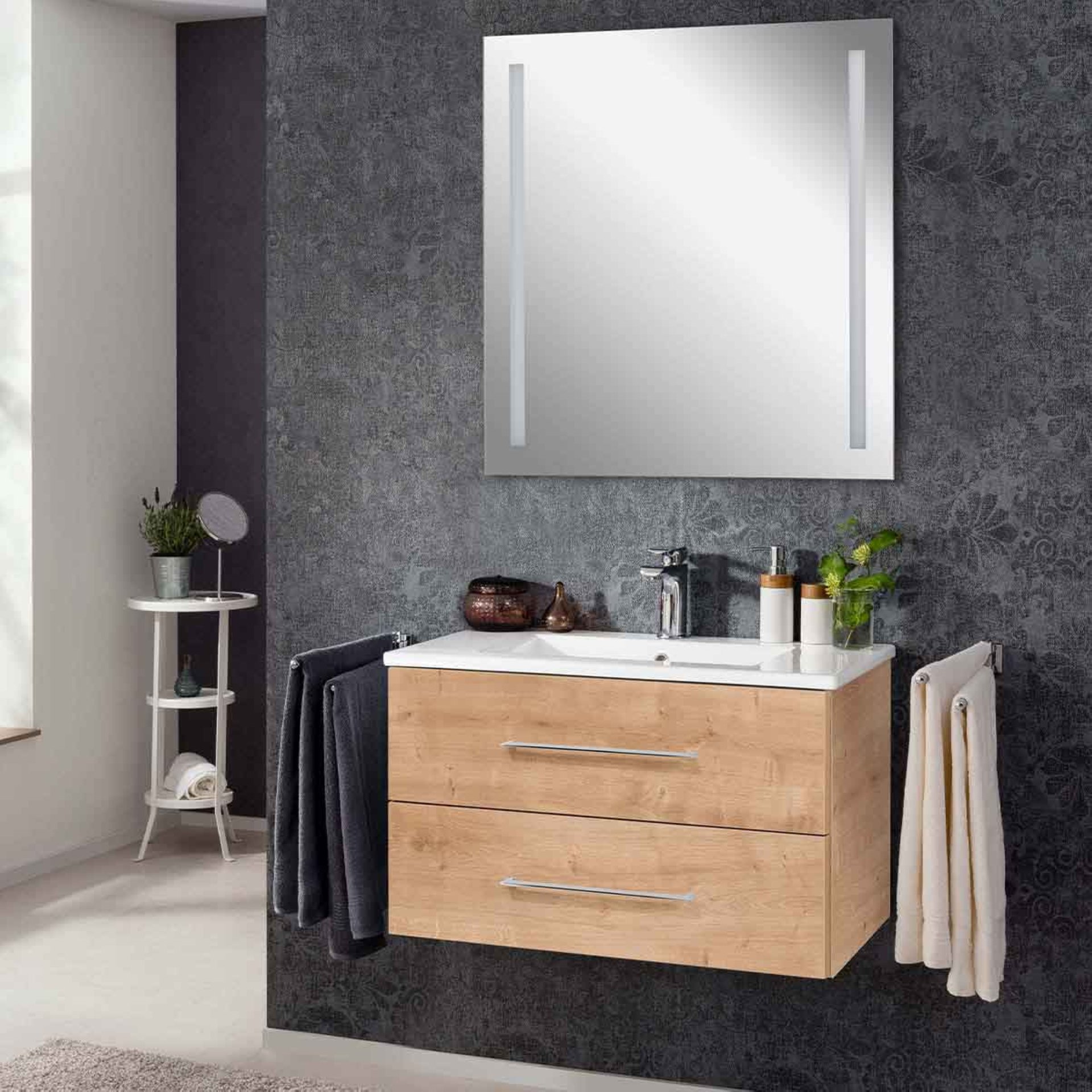 Das 3-teilige 80 cm breite Badmöbel Set aus der Serie B.perfekt von Fackelmann besticht durch seine symmetrische Gestaltung. Die Breite des Waschtischunterschrank mit Waschbecken wird von dem 80 cm breiten LED Spiegelelement aufgenommen. So entsteht eine perfekte Harmonie. Das helle Braun des Unterschranks nimmt gekonnt den Trend zu natürlichen Tönen im Badezimmer auf. Holzstrukturen der Eiche sind deutlich zu erkennen. Zwei Schubladen mit chromglänzenden Griffen bieten ausreichend Platz für Deine Badaccessoires. Perfekt auf den Waschtischunterschrank passt das hochwertige Keramikbecken. Der 80 cm breite Spiegel mit austauschbarer LED-Beleuchtung garantiert ein gut ausgeleuchtetes Spiegelbild. Durch die beiden Leuchtstreifen, die links und rechts im Spiegel integriert sind, wird Schminken oder Rasieren zu einem Erlebnis. Das Fackelmann B.perfekt Badmöbel Set 3-teilig, 80 cm, Braun hell, LED-Spiegel wird mit viel Liebe zum Detail in Deutschland hergestellt. Eine perfekte und leicht verständliche Aufbauanleitung hilft Dir beim Aufbau Deines zerlegten Badmöbel Sets.
