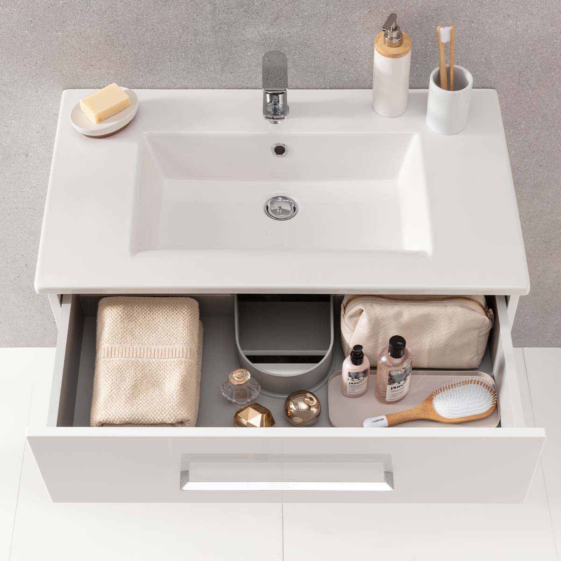 - Ausstattung: 2 Auszüge mit Einzugsdämpfung, Soft-Close-System, 2 Griffe, Chrom glänzend