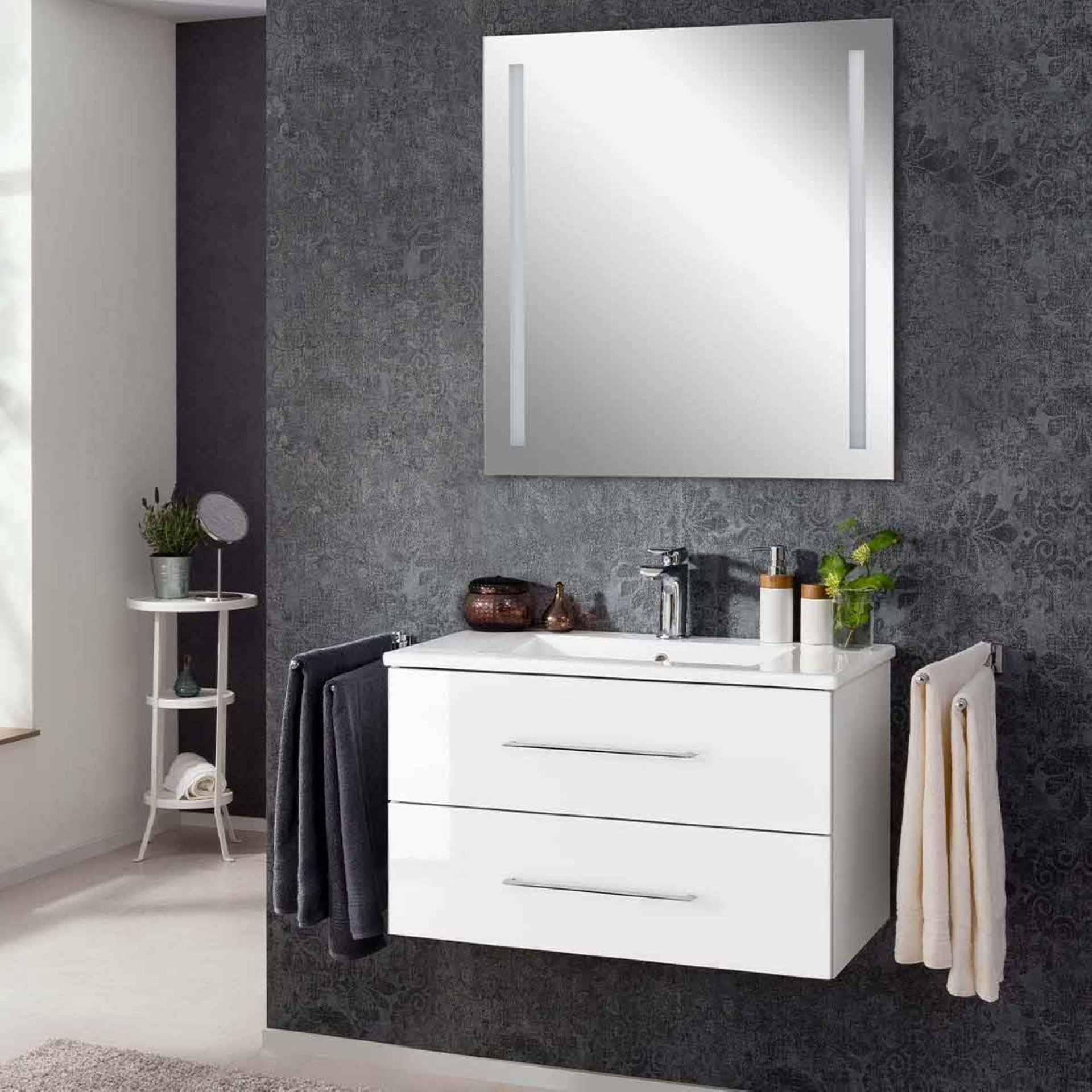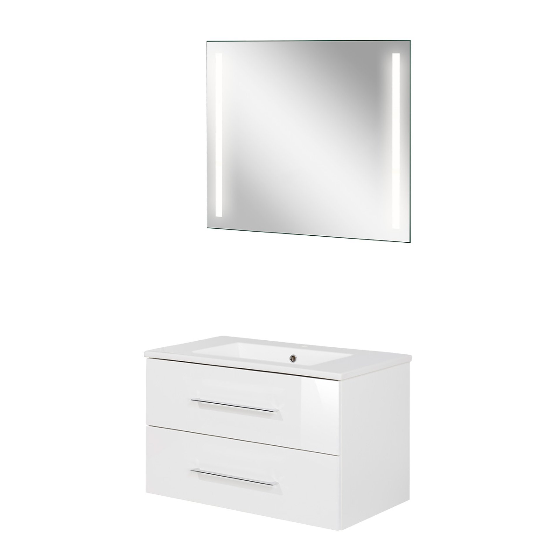 Klare Linien. Klare Strukturen. Der Klassiker Weiß bringt Dein Badezimmer oder kleines Bad zum Leuchten. Das 3-teilige 80 cm breite Badmöbel Set in Weiß aus der Serie B.perfekt von Fackelmann besticht durch seine symmetrische Gestaltung. Die Breite des Waschtischunterschrank mit Waschbecken wird von dem 80 cm breiten LED Spiegelelement aufgenommen. So entsteht eine perfekte Harmonie. Die glänzend weiße Front verbunden mit dem matt weißen Korpus erzeugt Freude in Deinem Bad. Weiß assoziiert Reinheit. Zwei Schubladen mit chromglänzenden Griffen bieten ausreichend Platz für Deine Badaccessoires. Perfekt auf den Waschtischunterschrank passt das hochwertige, weiße Keramikbecken. Der 80 cm breite Spiegel mit austauschbarer LED-Beleuchtung ermöglicht ein gut ausgeleuchtetes Spiegelbild. Durch die beiden Leuchtstreifen, die links und rechts im Spiegel integriert sind, wird Schminken und Rasieren zu einem Erlebnis. Das Fackelmann B.perfekt Badmöbel Set 3-teilig, 80 cm, Weiß, LED-Spiegel wird mit viel Liebe zum Detail in Deutschland hergestellt. Eine perfekte und leicht verständliche Aufbauanleitung hilft Dir beim Aufbau Deines zerlegten Badmöbel Sets.