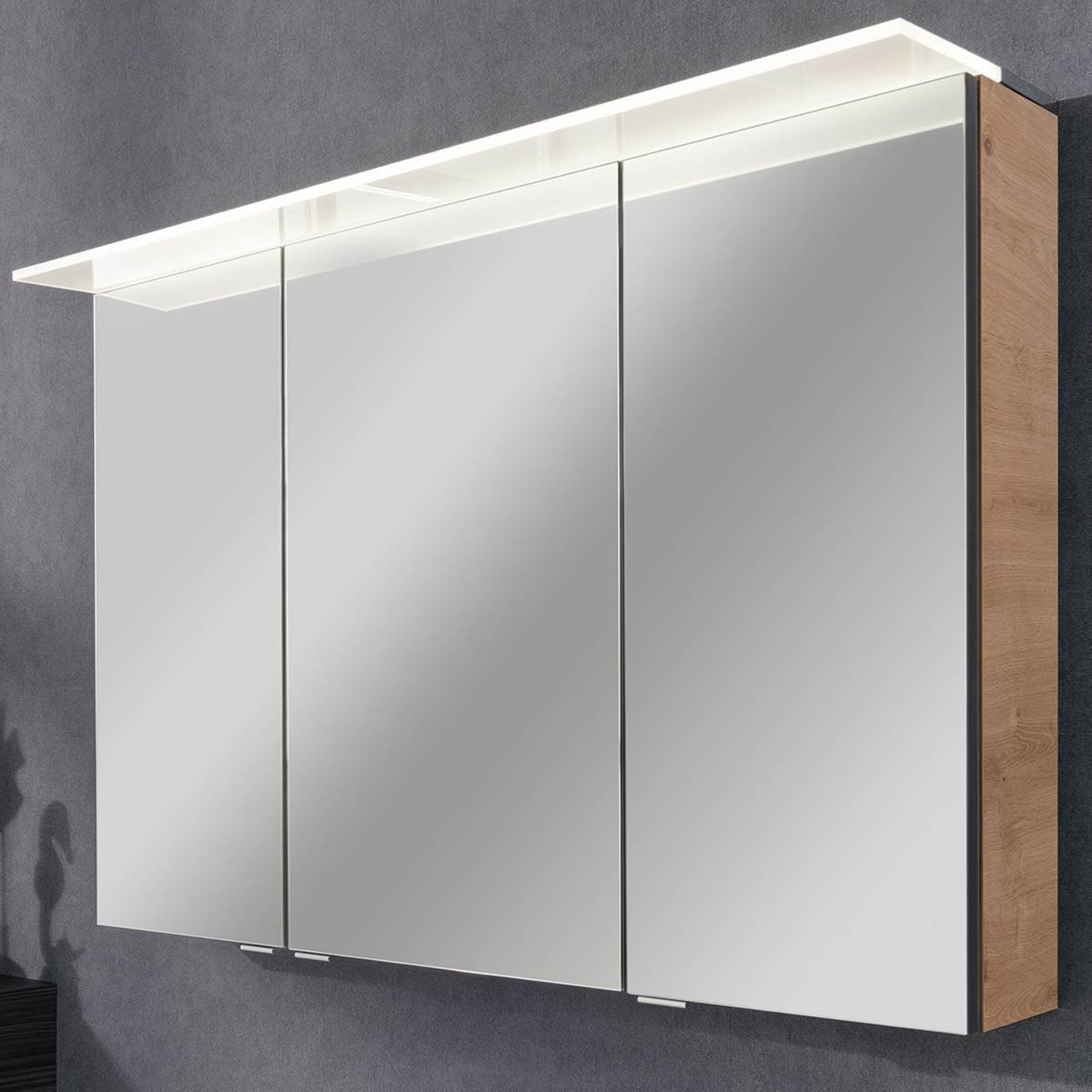 - Ausstattung: energiesparende LED-Paneelleuchte mit einer Tiefe von 231 mm aus Acrylglas 9,4 Watt, 3 Türen mit gedämpften Scharnieren, links u. rechts mit Innenspiegel, 4 Glaseinlegeböden, E-Box mit Steckdose und Schalter