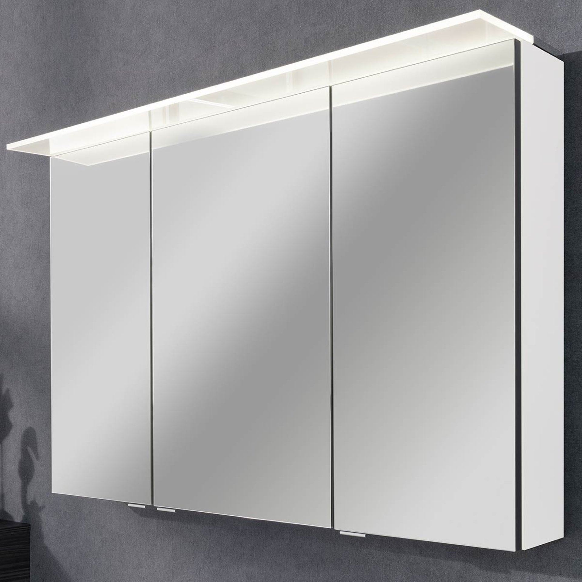 - Ausstattung: energiesparende LED-Paneelleuchte aus Acrylglas 9,4 Watt, 3 Türen mit gedämpften Scharnieren, links u. rechts mit Innenspiegel, 4 Glaseinlegeböden, E-Box mit Steckdose und Schalter