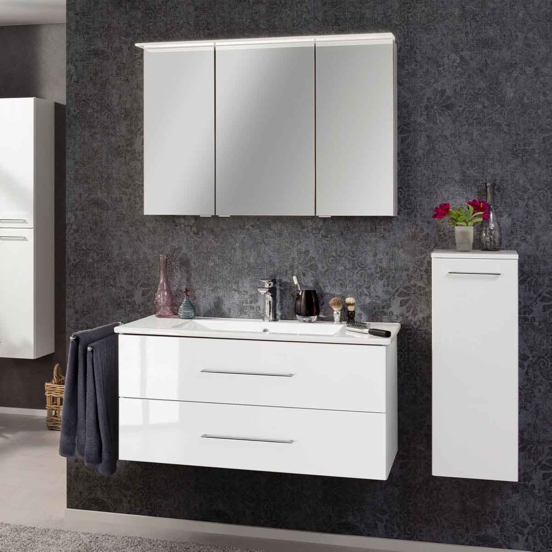 Klare Linien. Klare Strukturen. Der Klassiker Weiß bringt Dein Badezimmer zum Leuchten. Das 3-teilige 100 cm breite Badmöbel Set in Weiß aus der Serie B.PERFEKT von Fackelmann besticht durch seine symmetrische Gestaltung. Die Breite des Waschtischunterschrank mit Waschbecken wird von dem 100 cm breiten LED Spiegelschrank aufgenommen. So entsteht eine perfekte Harmonie. Die glänzend weiße Front verbunden mit dem matt weißen Korpus erzeugt Freude in Deinem Badezimmer. Weiß assoziiert Reinheit. Zwei Schubladen mit chromglänzenden Griffen bieten ausreichend Platz für Deine Badaccessoires. Perfekt auf den Waschtischunterschrank passt das hochwertige, weiße Keramikbecken. Damit Du die Dinge des täglichen Pflegerituals immer griffbereit hast, kannst Du die Ablageflächen rechts und links vom Waschbecken nutzen. Gekrönt wird Dein Badmöbel Set mit dem modernen Spiegelschrank von Fackelmann. Er ist mit einer LED-Paneelleuchte aus Acrylglas ausgestattet. Ein Blickfang für Dein neues Bad. Beim Öffnen der Türen zeigen sich die Innenspiegel. Dadurch entsteht ein sogenannter 3D-Effekt, der ein 180 Grad Rundum-Styling gestattet. Das FACKELMANN B.PERFEKT Waschtisch Set mit Spiegelschrank 103 cm breit, Weiß, Waschbecken Keramik Weiß wird mit viel Liebe zum Detail in Deutschland hergestellt. Eine perfekte und leicht verständliche Aufbauanleitung hilft Dir beim Aufbau Deines zerlegten Badmöbel Sets.