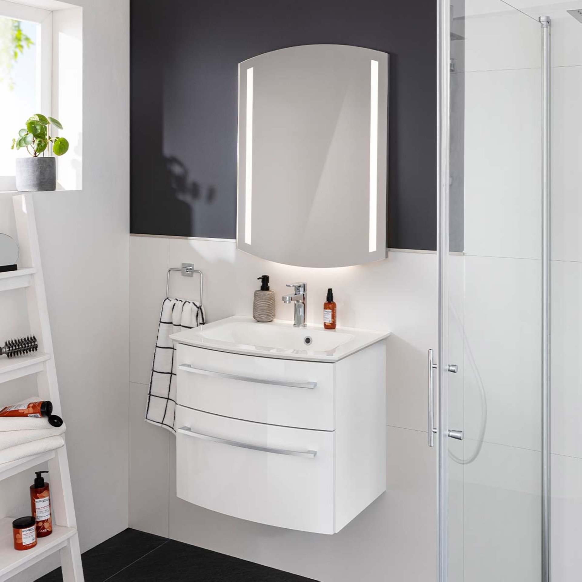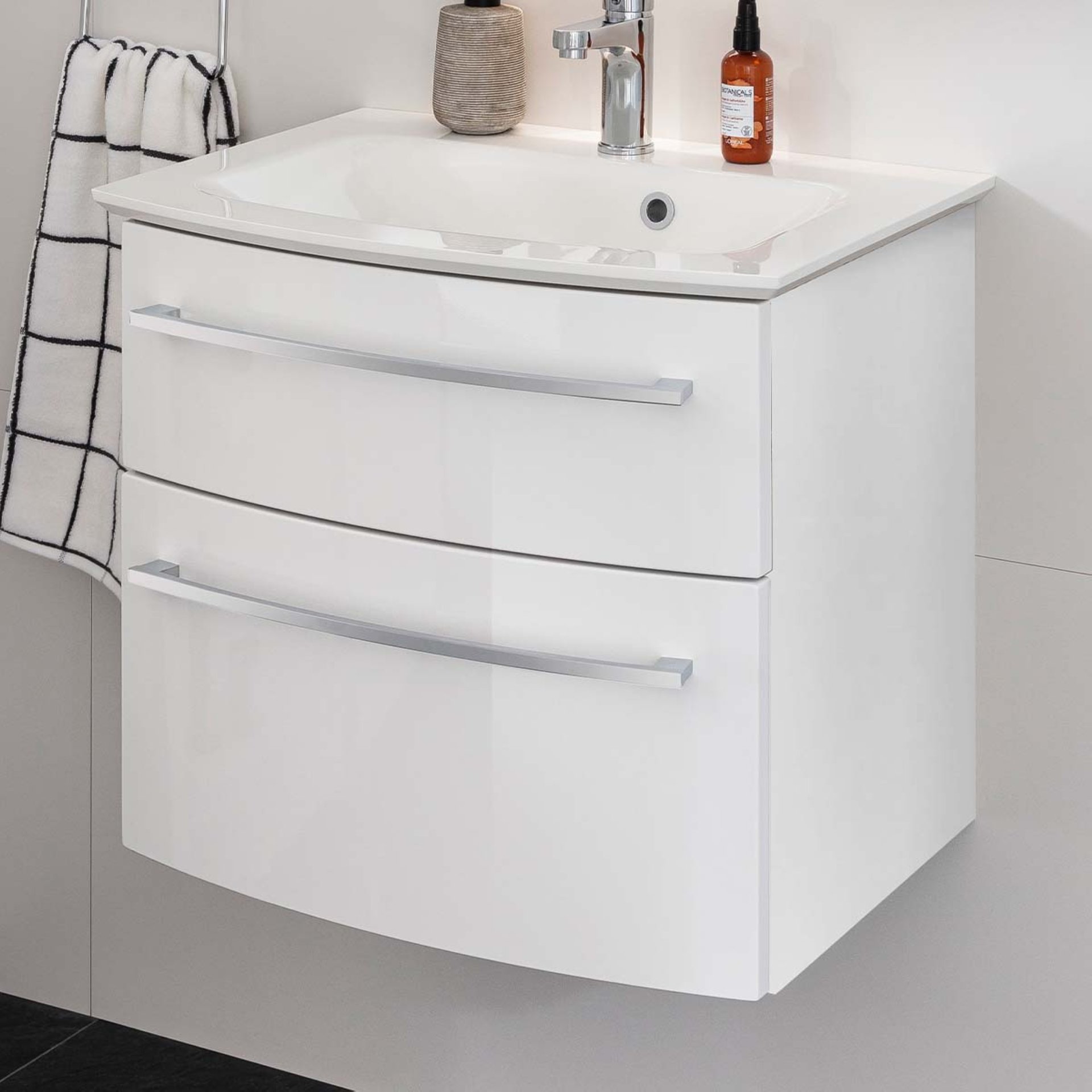 Klassisches Weiß hat nie seine Aktualität im Bad verloren. Es steht für Reinheit und Klarheit. Das moderne 60 cm breite Badmöbel Set aus der Serie B-STYLE von Fackelmann ist ein zeitloser und effektvoller Blickfang und ein perfekter Waschplatz in Deinem neuen Badezimmer. Die leicht geschwungene Front des Waschtischunterschranks mit seinen zwei Schubladen und den beiden chromglänzenden Griffen verleiht dem Möbel Leichtigkeit. Enorm viel Stauraum bieten die beiden Schubladen mit Soft-Close-System. All die kleinen Dinge für das tägliche Pflegeritual sind im integrierten Ordnungssystem perfekt aufgeräumt und immer griffbereit. Das Set mit einer Breite von 60 cm eignet sich hervorragend für kleine Bäder und Gäste WC'sund bietet ausreichend Platz für viele Badaccessoires. Der robuste Waschtisch aus Gussmarmor nimmt die Form des Waschtischunterschranks auf und bildet eine perfekte Harmonie. Mit viel Liebe zum Detail werden Badmöbel von Fackelmann für Dich in Deutschland hergestellt. Damit Du das Fackelmann B.STYLE Badmöbel Set 2-teilig, 63,2 cm breit, Weiß, Gussmarmor ganz leicht in Deinem neuen Badezimmer integrieren kannst ist es vormontiert.