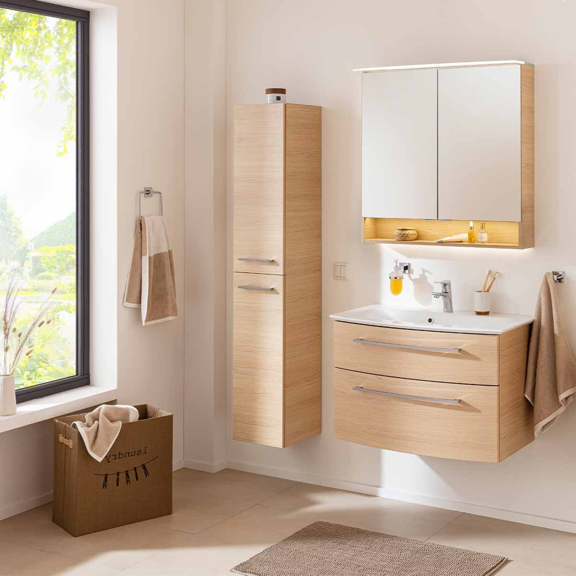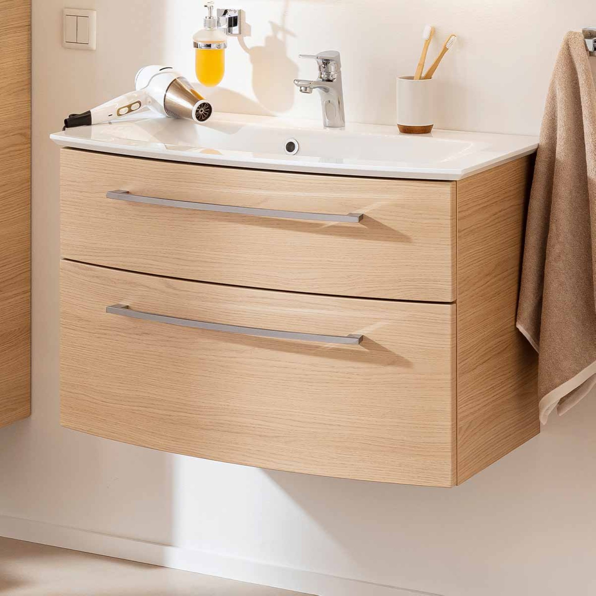 Ein perfekter Waschplatz! Das zweiteilige Set aus der Serie B.STYLE von Fackelmann. Die leicht geschwungene Front mit seinen zwei Schubladen und den beiden chromglänzenden Griffen verleiht dem Möbel Leichtigkeit. Enorm viel Stauraum bieten die beiden Schubladen mit Soft-Close-System. All die kleinen Dinge für das tägliche Pflegeritual sind im integrierten Ordnungssystem perfekt aufgeräumt und immer griffbereit. Badmöbel im Farbton Sandeiche liegen aktuell im Trend und sind ein Blickfang in Deinem modernen Badezimmer. Das Fackelmann B.STYLE Badmöbel Set 2-teilig, 83,2 cm breit, Braun, Gussmarmor Weiß mit einer Breite von 80 cm eignet sich hervorragend für moderne Familienbäderund bietet ausreichend Platz für viele Badaccessoires. Der robuste Waschtisch aus Gussmarmor nimmt die Form des Waschtischunterschranks auf und bildet eine perfekte Harmonie. Mit viel Liebe zum Detail wird der Schrank für Dich in Deutschland hergestellt und vormontiert. Damit ist er ganz leicht in Deinem neuen Badezimmer integriert.