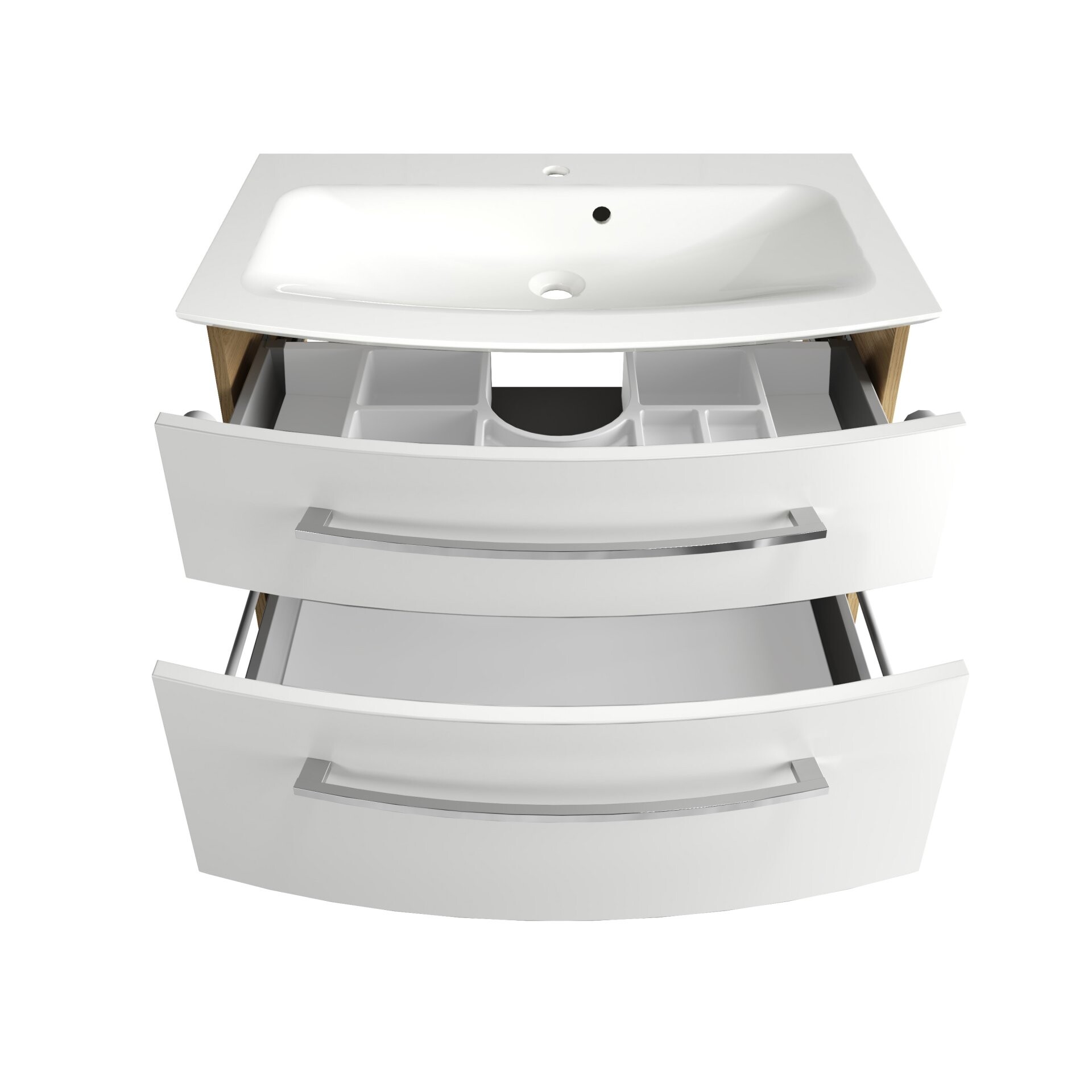 Eine der wohl gelungensten Farbkombinationen kennzeichnet das moderne dreiteilige Set aus der Serie B.STYLE von Fackelmann mit einer Breite von 83 cm. Sandeiche trifft auf hochglänzendes Weiß. So entsteht ein effektvoller Blickfang und ein perfekter Waschplatz in Deinem Badezimmer. Die leicht geschwungene Front mit seinen zwei Schubladen und den beiden chromglänzenden Griffen verleiht dem Möbel Leichtigkeit. Enorm viel Stauraum bieten die beiden Schubladen mit Soft-Close-System. All die kleinen Dinge für das tägliche Pflegeritual sind im integrierten Ordnungssystem perfekt aufgeräumt und immer griffbereit. Der robuste Waschtisch aus Gussmarmor nimmt die Form des Waschtischunterschranks auf und bildet eine perfekte Harmonie. Gekrönt wird das Waschtischset durch den modernen LED-Spiegel. Dein neues Designobjekt für Dein Badezimmer! Im unteren Teil des Spiegels befindet eine Ambientebeleuchtung und rechts und links zwei senkrechte, in den Spiegel integrierte, Leuchtsäulen. Mit viel Liebe zum Detail werden Badmöbel von Fackelmann für Dich in Deutschland hergestellt. Das Fackelmann B.STYLE Badmöbel Set 3-teilig, 83 cm, Weiß/Braun, LED-Spiegeleignet sich hervorragend für kleine oder große Bäder und bietet ausreichend Platz für Deine Badaccessoires. Damit das dreiteilige Badset ganz leicht in Deinem neuen Badezimmer integriert werden kann ist es vormontiert.