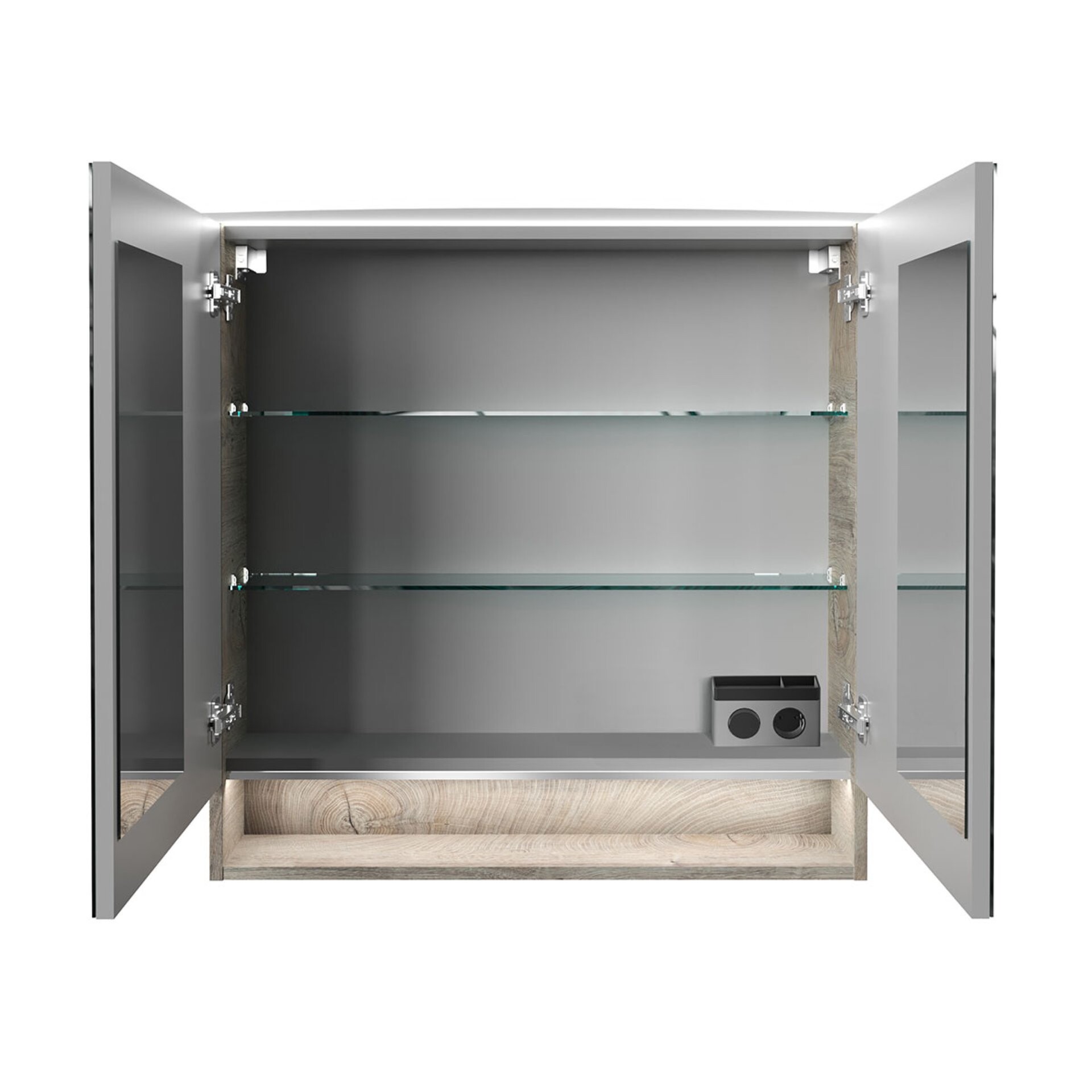 - Ausstattung: 2 Türen mit Innenspiegel, 2 Glasböden, gedämpfte Scharniere, Anschlusskabel ca. 100 cm, Querteile und Rückwand silbergrau