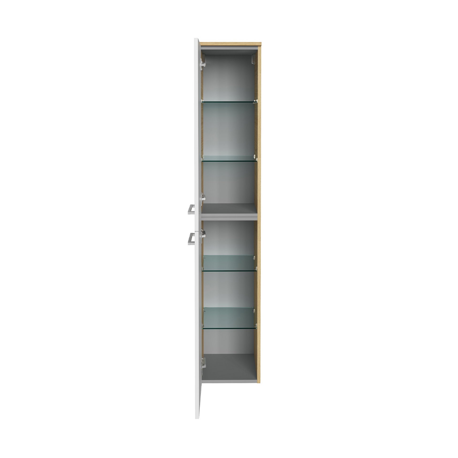 - Ausstattung: 2 Türen, Türanschlag links, 4 Glaseinlegeböden, 2 Griffe chromglänzend, gedämpfte Scharniere
