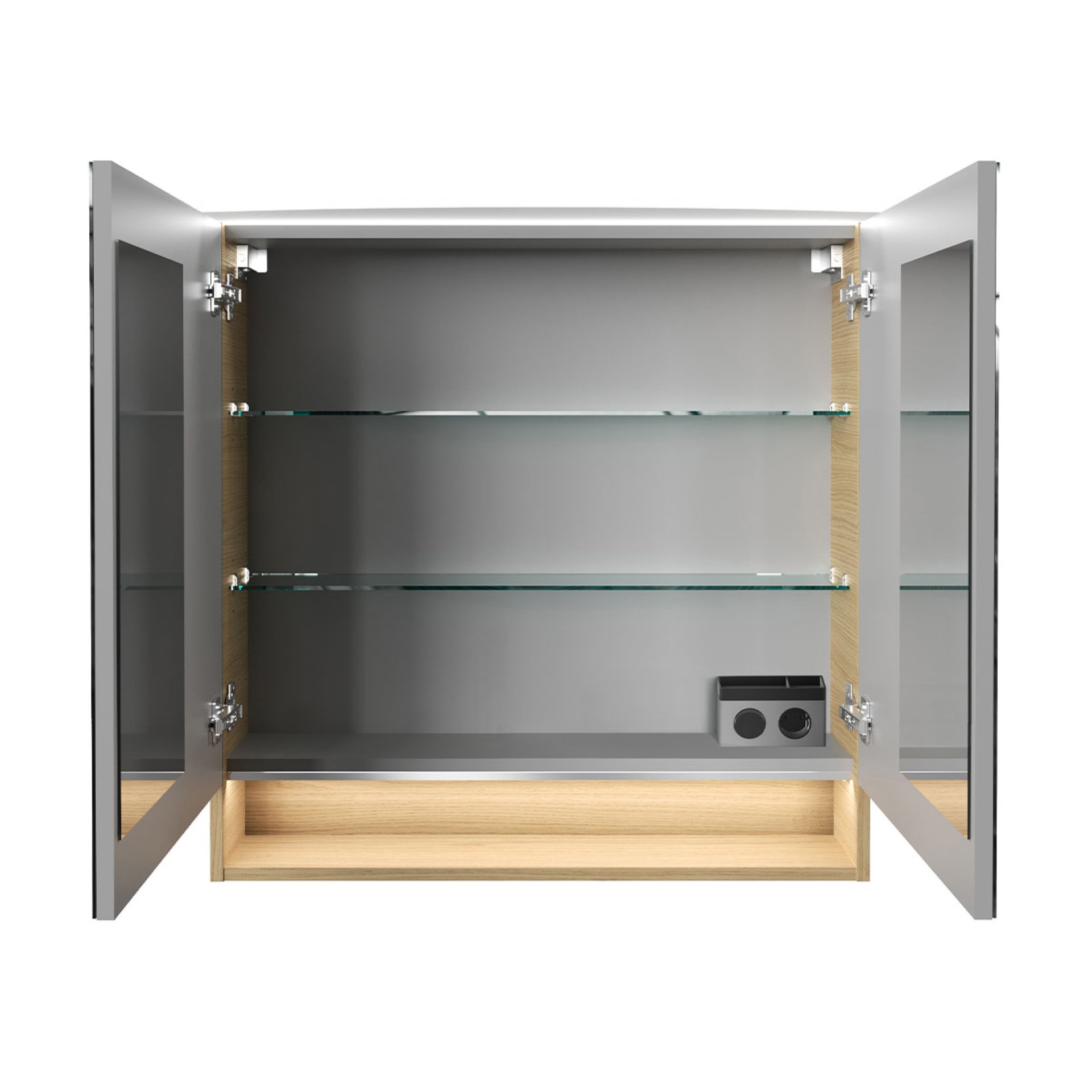 - Ausstattung: 2 Türen mit Innenspiegel, 2 Glasböden, gedämpfte Scharniere, Anschlusskabel ca. 100 cm, Querteile und Rückwand silbergrau