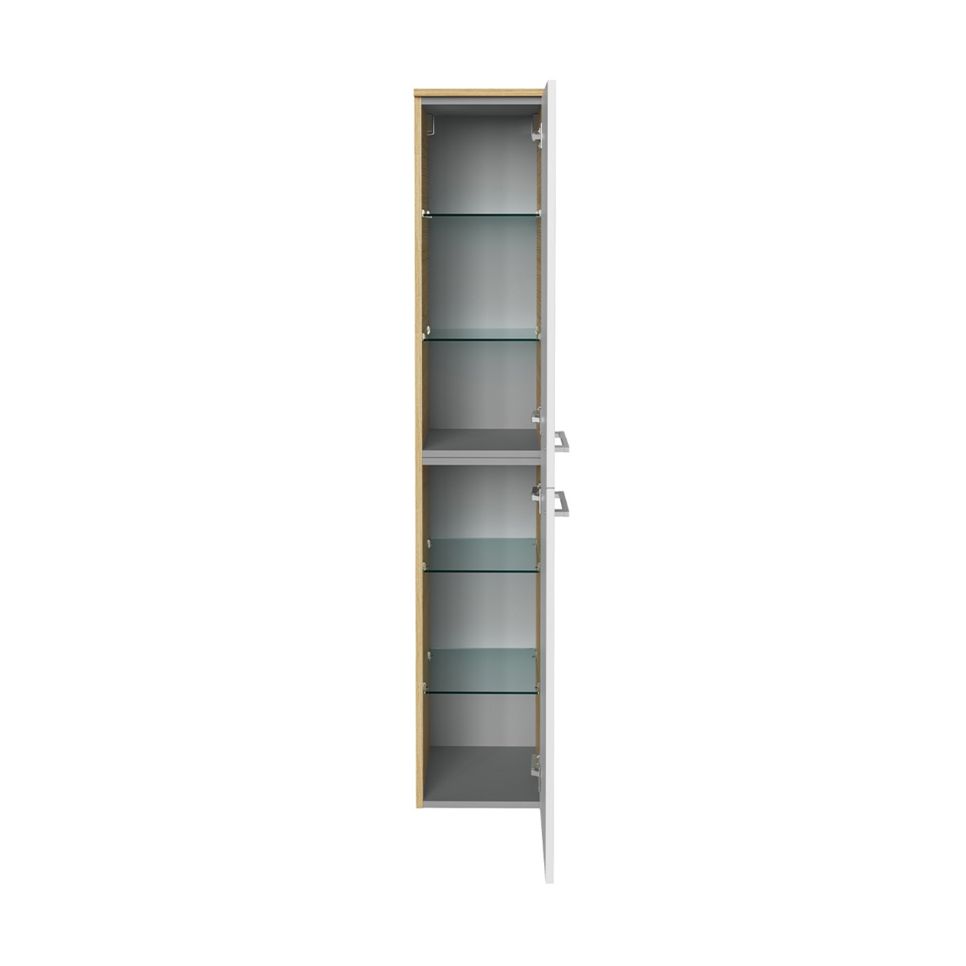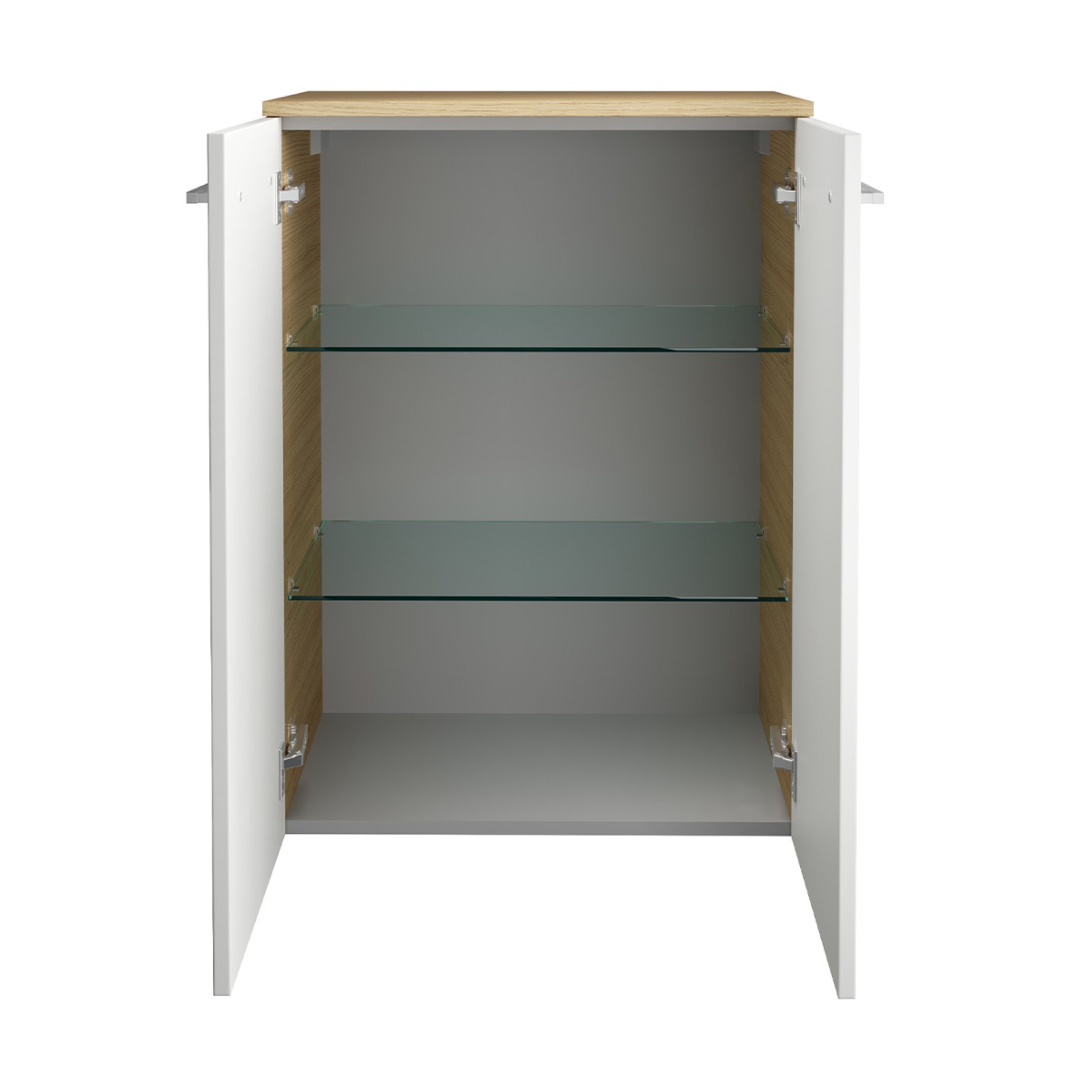 - Ausstattung: 2 Türen, 2 Glaseinlegeböden, 2 Griffe chromglänzend, gedämpfte Scharniere