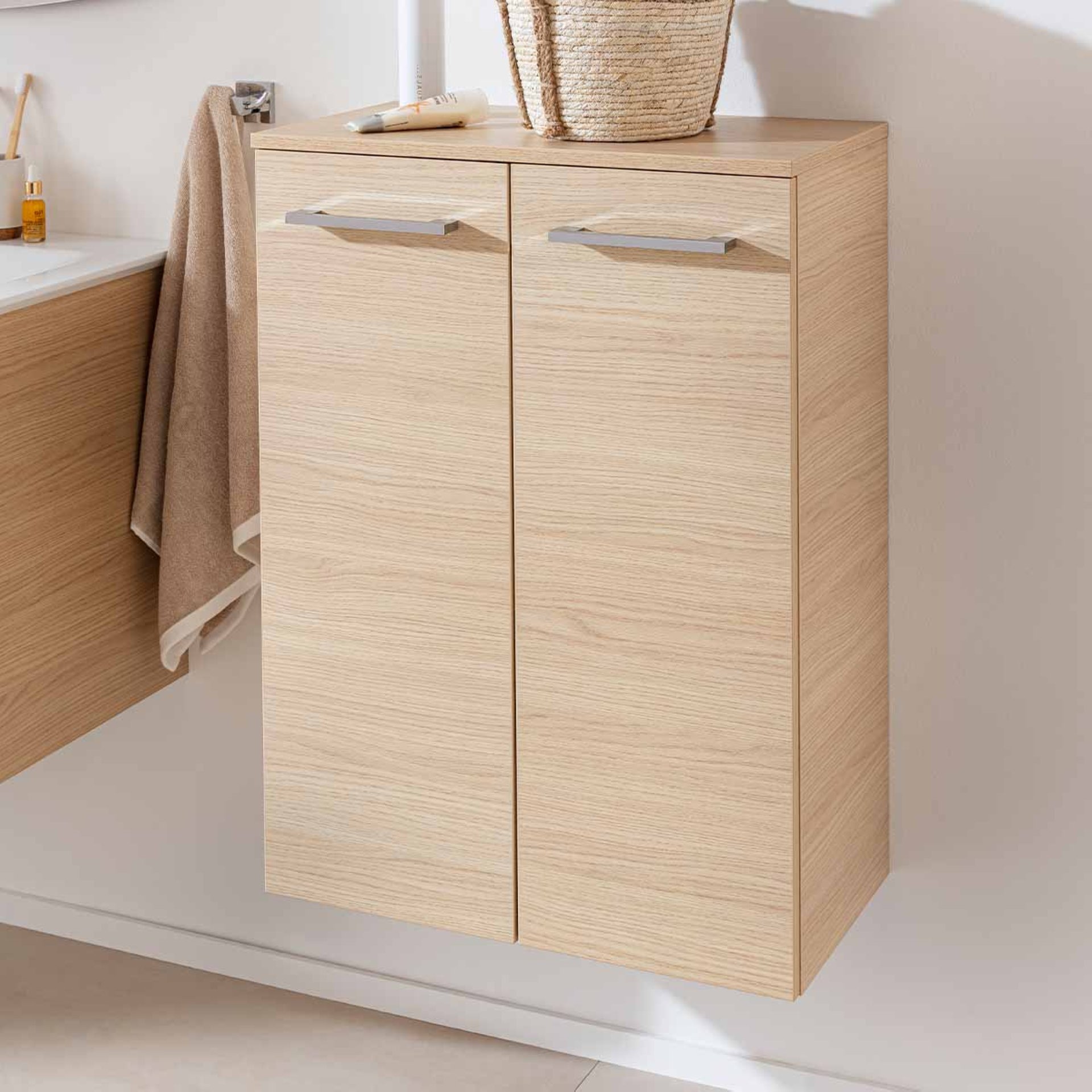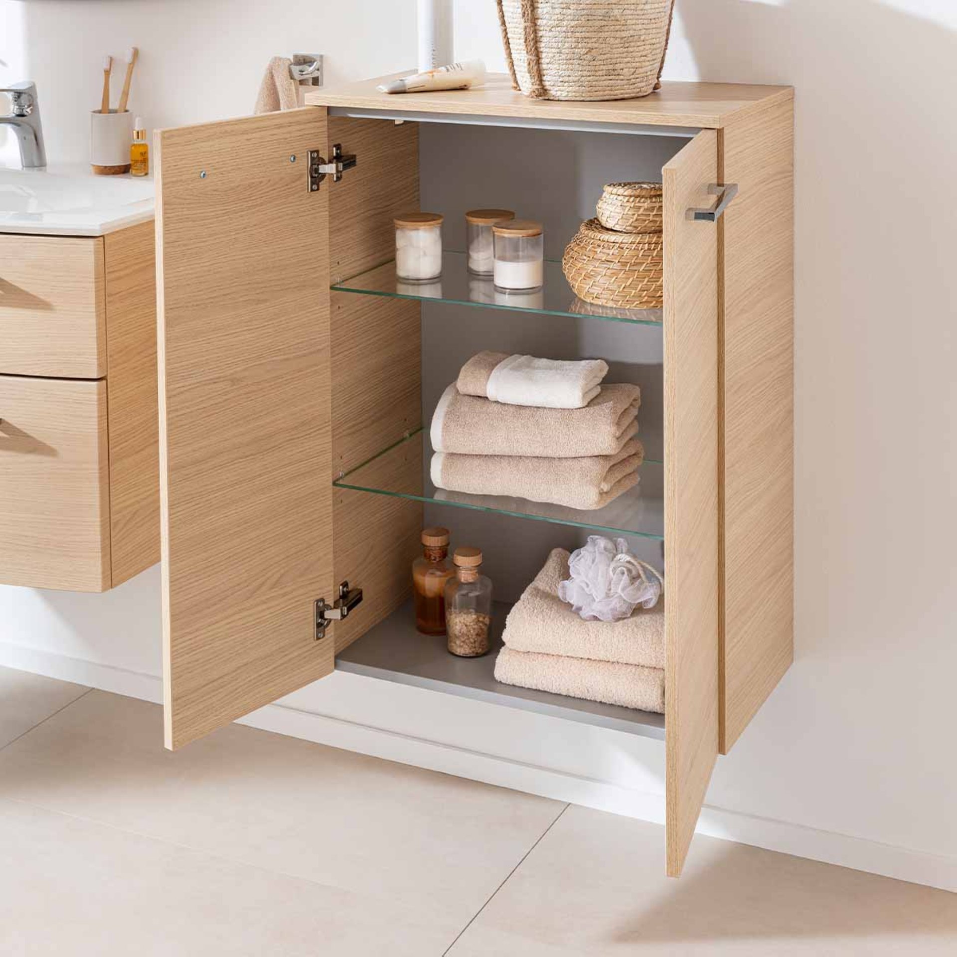 Doppelt gut! Doppelt Stauraum! Mit dem Doppel-Midischrank im Farbton Sandeiche hast Du nicht nur die besten Voraussetzungen für ein aufgeräumtes Bad sondern Du liegst mit der Farbwahl im aktuellen Trend. Durch den neutralen Farbton des Doppel-Midischranks aus der Serie B.STYLE von Fackelmann entsteht ein effektvoller Blickfang in Deinem Badezimmer. Mit einer Breite von mehr als 60 cm und seinen zwei Glaseinlegeböden bietet das Möbel ausreichend Stauraum für Deine Badaccessoires und sie sind blickgeschützt aufbewahrt. Optik und Haptik werden Dich begeistern, denn sie kommen dem Original, der Eiche, sehr nah. Zum sanften Schließen sind die Türen mit gedämpften Scharnieren ausgestattet. Die chromglänzenden Griffe unterstreichen die Exklusivität dieses Badmöbels. Mit viel Liebe zum Detail wird der Fackelmann B.STYLE Doppel-Midischrank, 60 cm breit, Braun für Dich in Deutschland hergestellt und vormontiert. Damit ist er ganz leicht in Deinem neuen Badezimmer integriert.