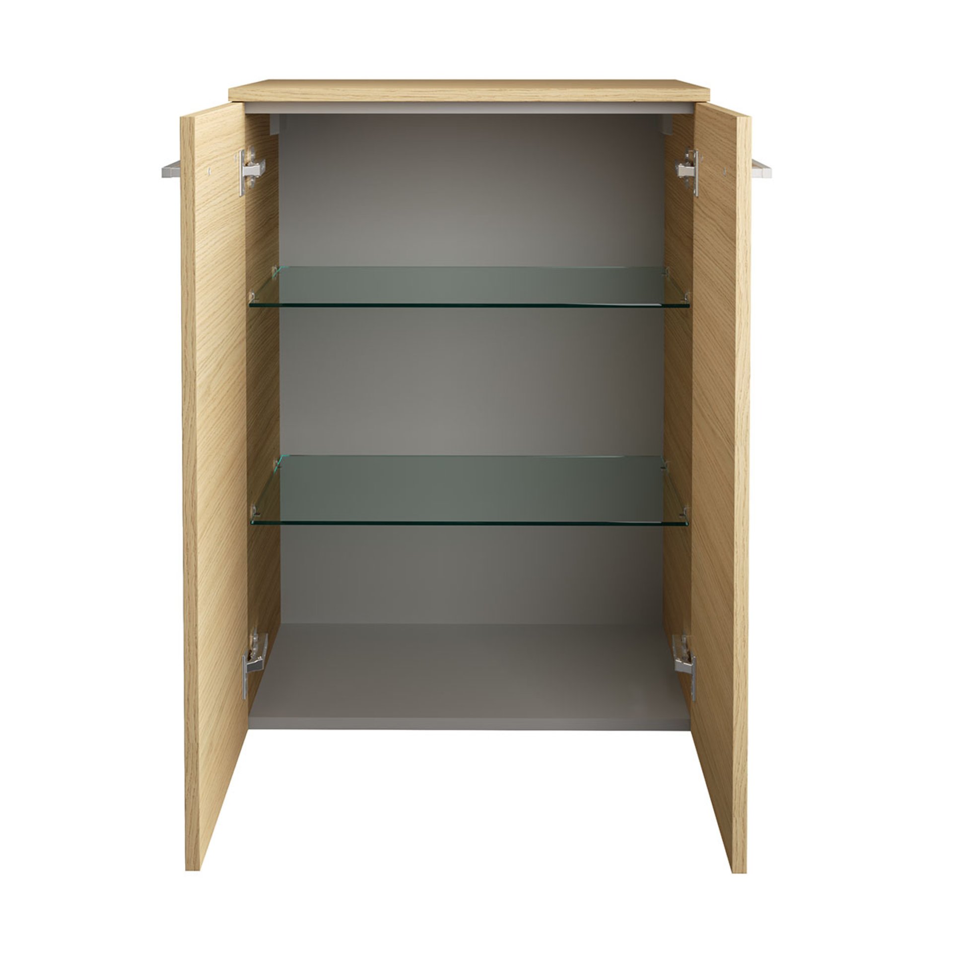 - Ausstattung: 2 Türen, 2 Glaseinlegeböden, 2 Griffe chromglänzend, gedämpfte Scharniere