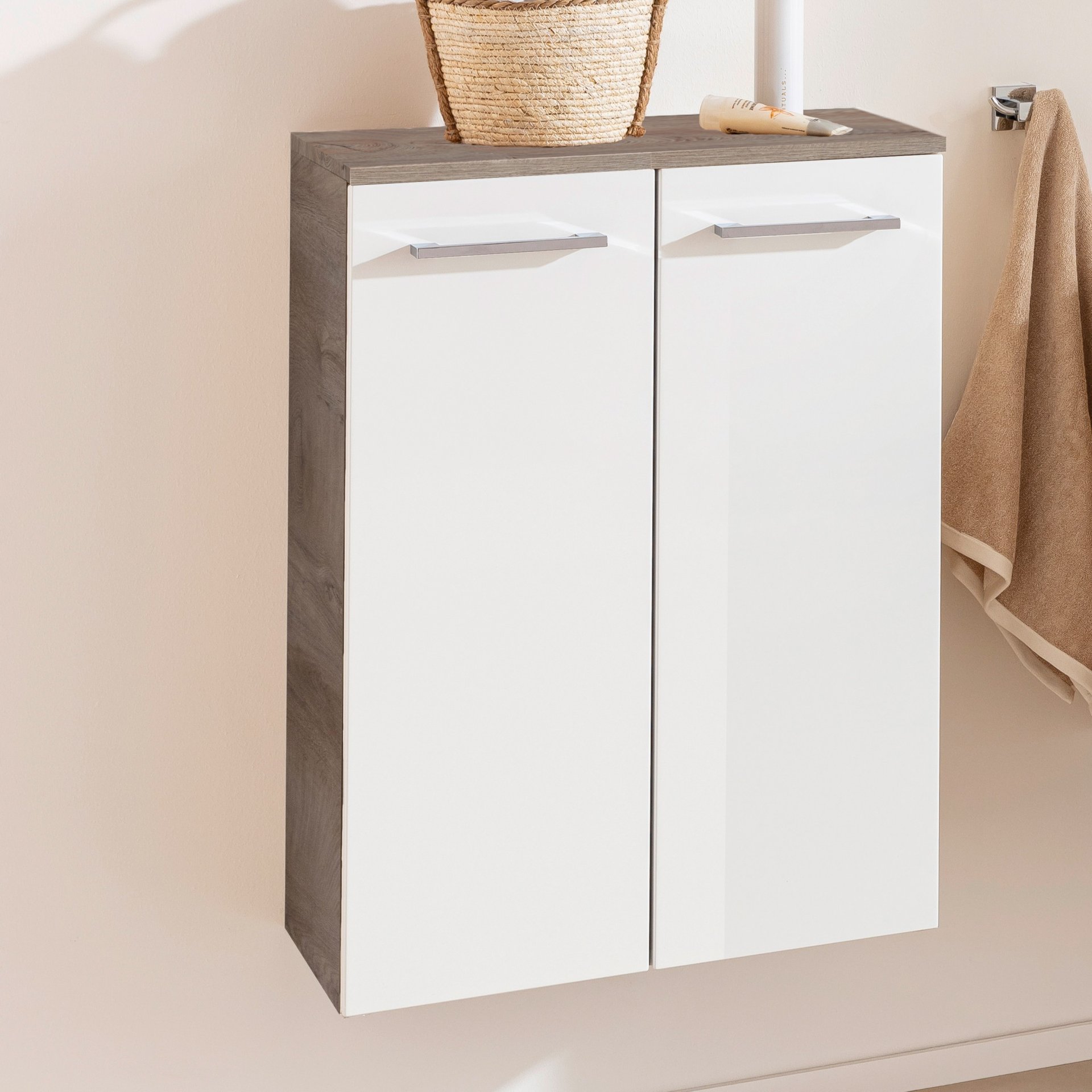 Fackelmann B.STYLE Doppel Midischrank 60 cm, Weiß/Braun mit Wäschekorb