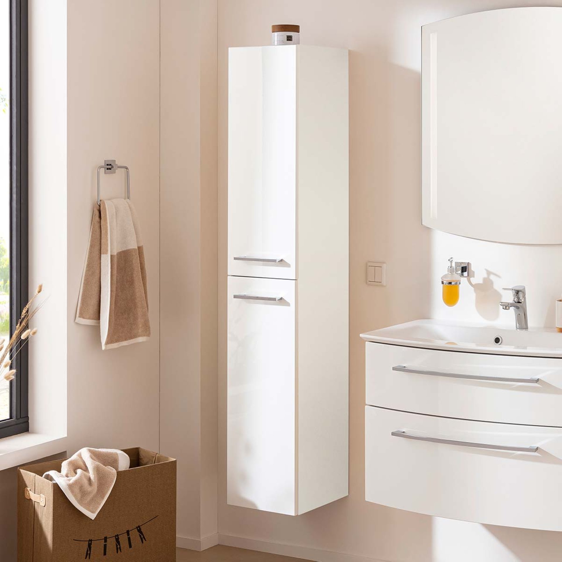 Klassisches Weiß hat nie seine Aktualität im Bad verloren. Es steht für Reinheit und Klarheit. Mit dem zweiteiligen Hochschrank aus der Serie B.STYLE von Fackelmann in strahlendem Weiß entsteht ein effektvoller, klarer Blickfang in Deinem Badezimmer. Durch seine Breite von 30 cm eignet er sich auch für schmale Bereiche in Deinem Bad. Vier Glaseinlegeböden bieten eine durchdachte Unterteilung und ausreichend Stauraum für Deine Badaccessoires und sie sind blickgeschützt aufbewahrt. Optik und Haptik des vormontierten Schranks werden Dich begeistern. Zum sanften Schließen sind die Türen mit gedämpften Scharnieren ausgestattet. Die chromglänzenden Griffe unterstreichen die Exklusivität dieses Badmöbels. Mit viel Liebe zum Detail wird der Fackelmann B.STYLE Hochschrank links, 30 cm breit, Weiß für Dich in Deutschland hergestellt und vormontiert. Damit ist er ganz leicht in Deinem neuen Badezimmer integriert.