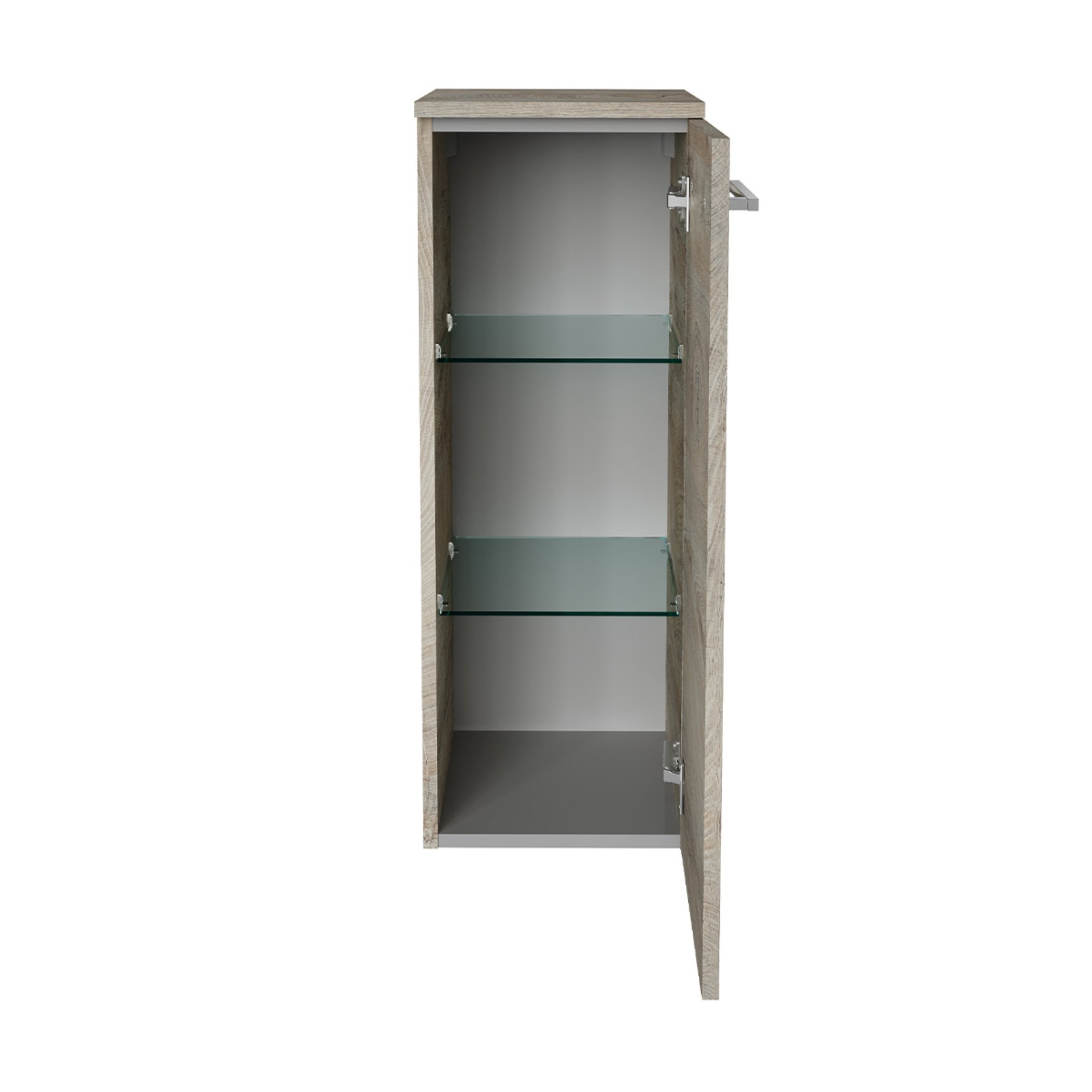 - Ausstattung: 1 Tür, Türanschlag rechts, 2 Glaseinlegeböden, 1 Griff chromglänzend, gedämpfte Scharniere