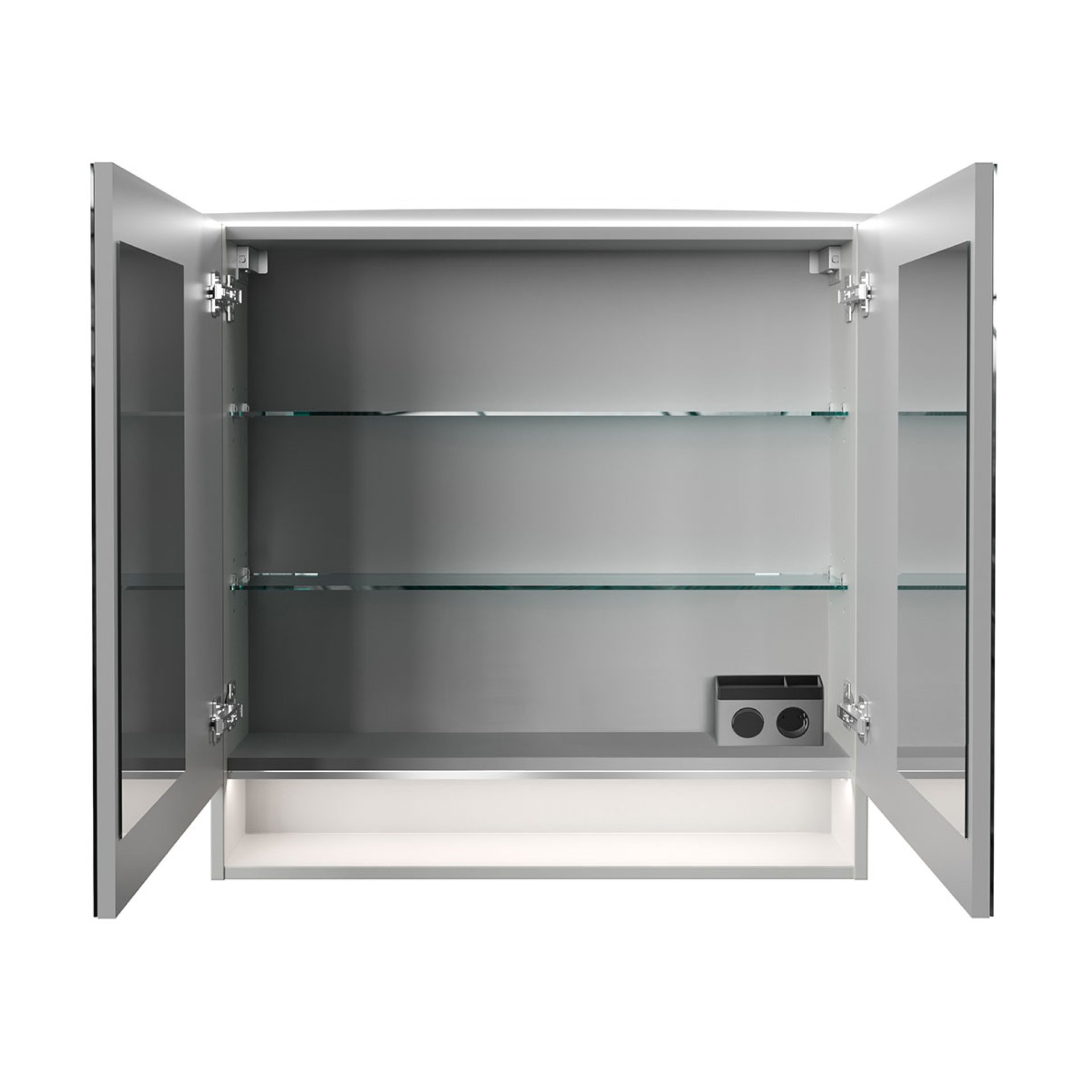 - Ausstattung: 2 Türen mit Innenspiegel, 2 Glasböden, gedämpfte Scharniere, Anschlusskabel ca. 100 cm, Querteile und Rückwand silbergrau, Elektrobox mit Schalter und Steckdose