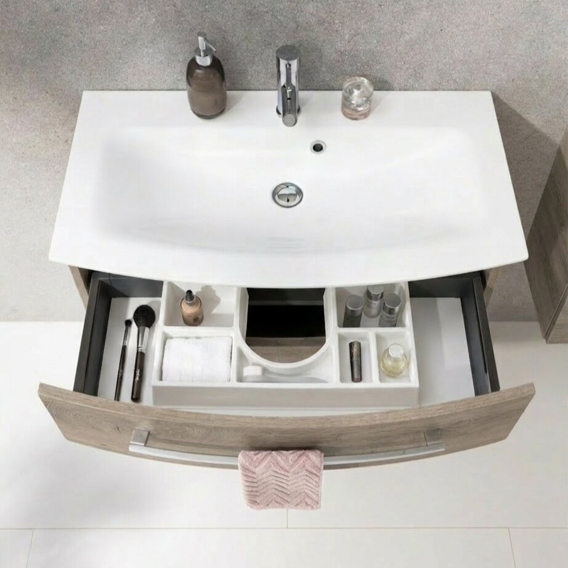 Eichenholz nimmt in seinem natürlichen Veredlungsprozess einen Farbton an, der zwischen hellem Grau und sanftem Braun variieren kann. Die neuen Badmöbel aus der Serie B.STYLE im Design Nature Oak (Eiche Natur) orientieren sich an diesem Farbspiel der Natur. Das zweiteilige Badmöbel Set von Fackelmann greift diese Natürlichkeit auf. Die leicht geschwungene Front des Waschtischunterschranks mit seinen zwei Schubladen und den beiden chromglänzenden Griffen verleiht dem Möbel Leichtigkeit. Enorm viel Stauraum bieten die beiden Schubladen mit Soft-Close-System. All die kleinen Dinge für das tägliche Pflegeritual sind im integrierten Ordnungssystem perfekt aufgeräumt und immer griffbereit. Das Fackelmann B.STYLE Badmöbel Set 2-teilig, 83,2 cm breit, Grau, Gussmarmor mit einer Breite von 80 cm eignet sich hervorragend für größere Bäder und Familienbäderund bietet ausreichend Platz für viele Badaccessoires. Der robuste Waschtisch aus Gussmarmor nimmt die Form des Waschtischunterschranks auf und bildet eine perfekte Harmonie. Mit viel Liebe zum Detail wird der Schrank für Dich in Deutschland hergestellt und vormontiert. Damit ist er ganz leicht in Deinem neuen Badezimmer integriert.