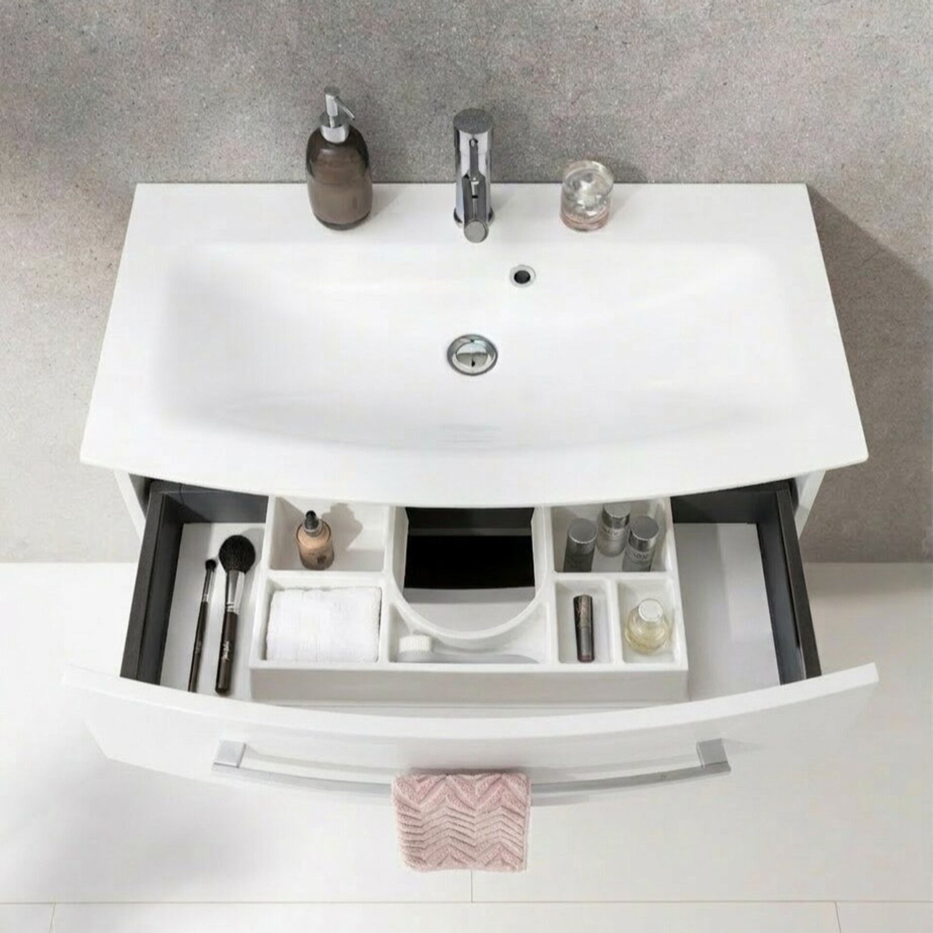 - Besonderheit: Ordnungssystem im oberen Schub integriert, Schublade innen und Querteile silbergrau
