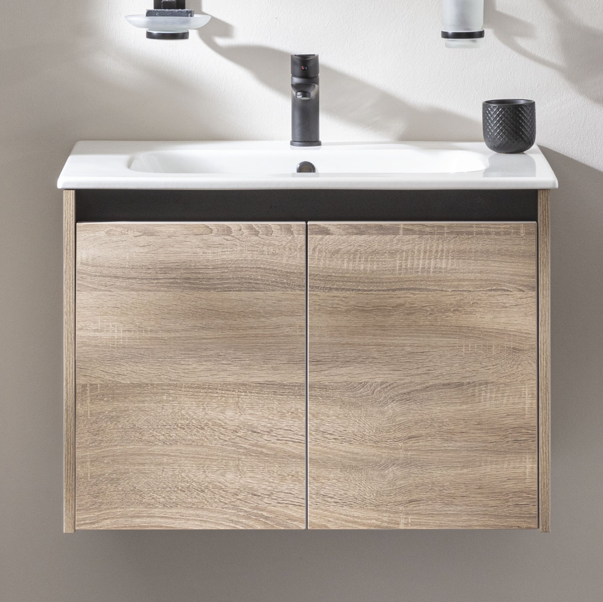 Fackelmann COMPACT LINE Waschbecken mit Unterschrank 71 cm breit, Braun, Waschbecken Keramik Weiß
