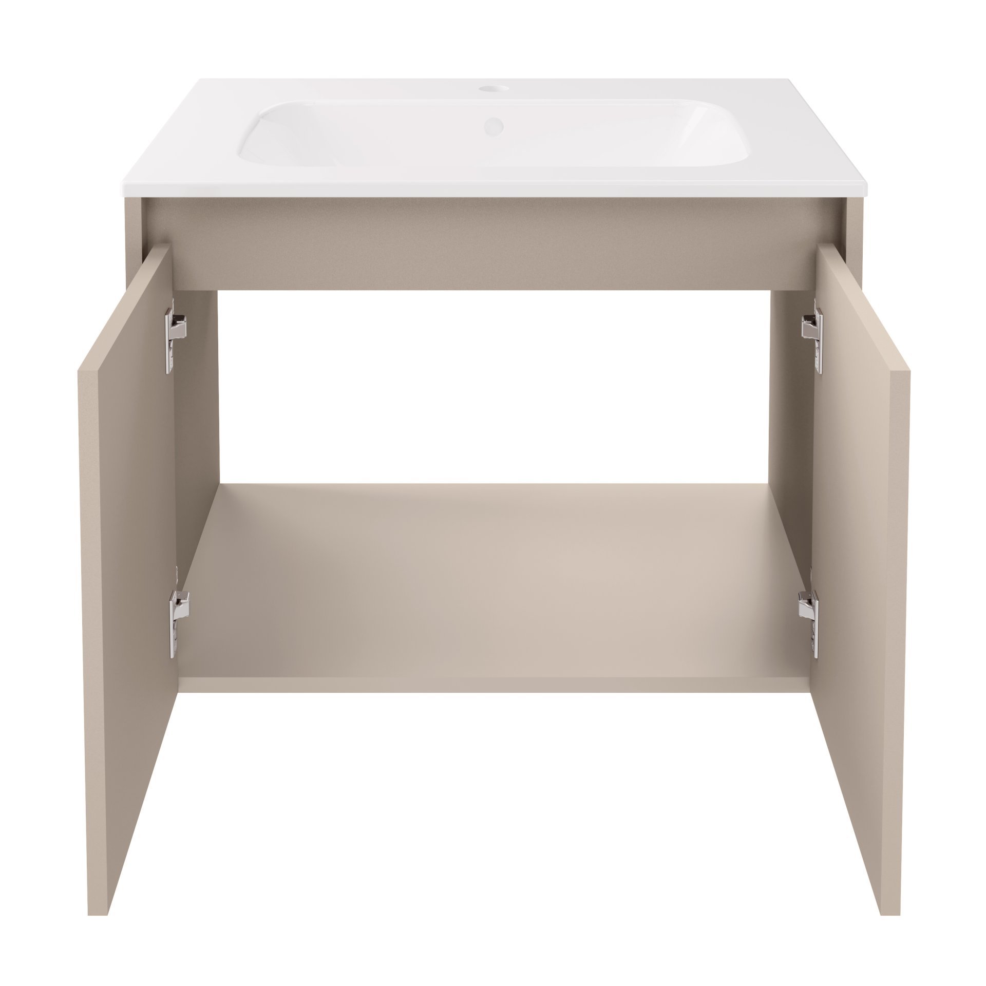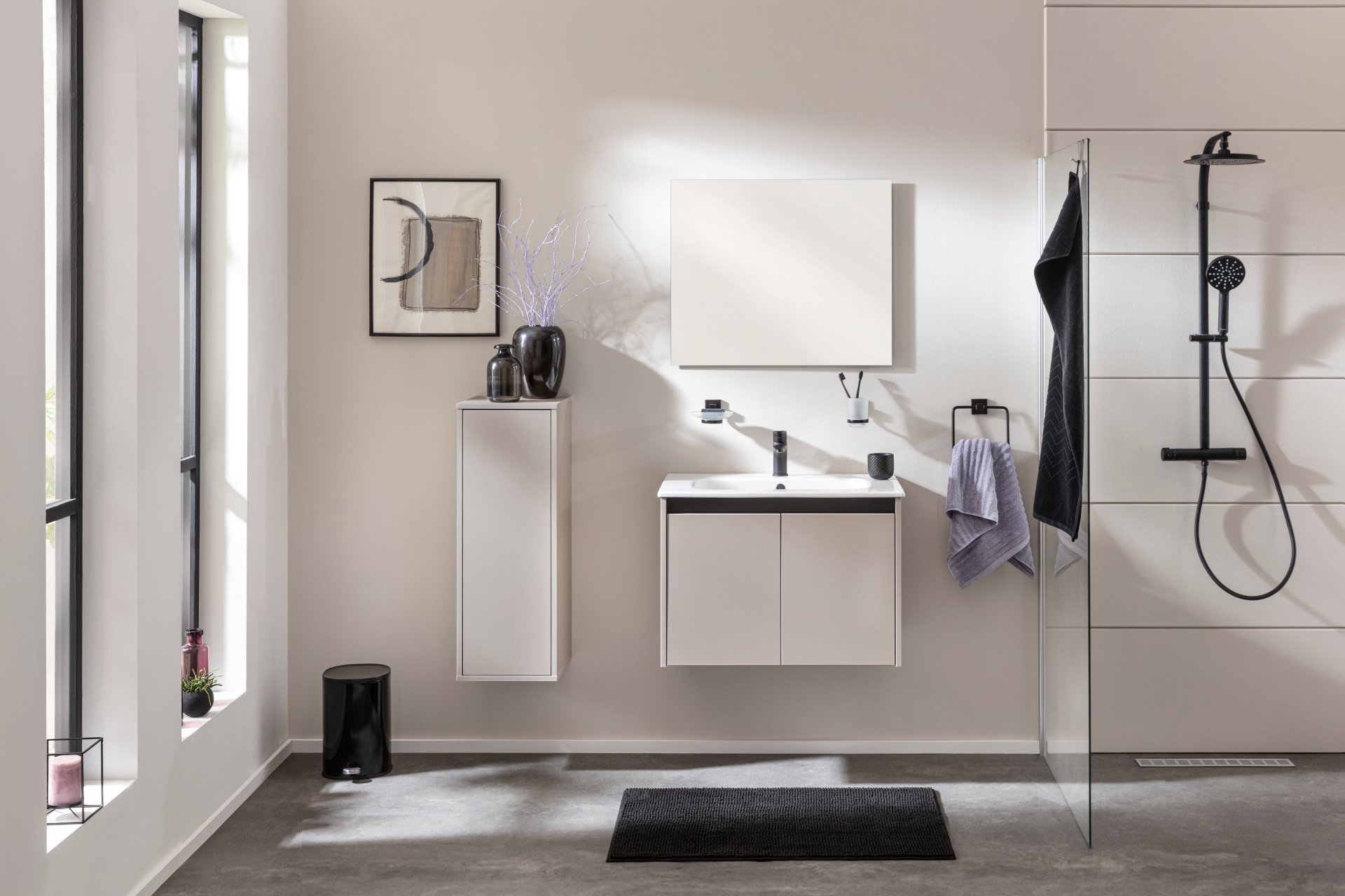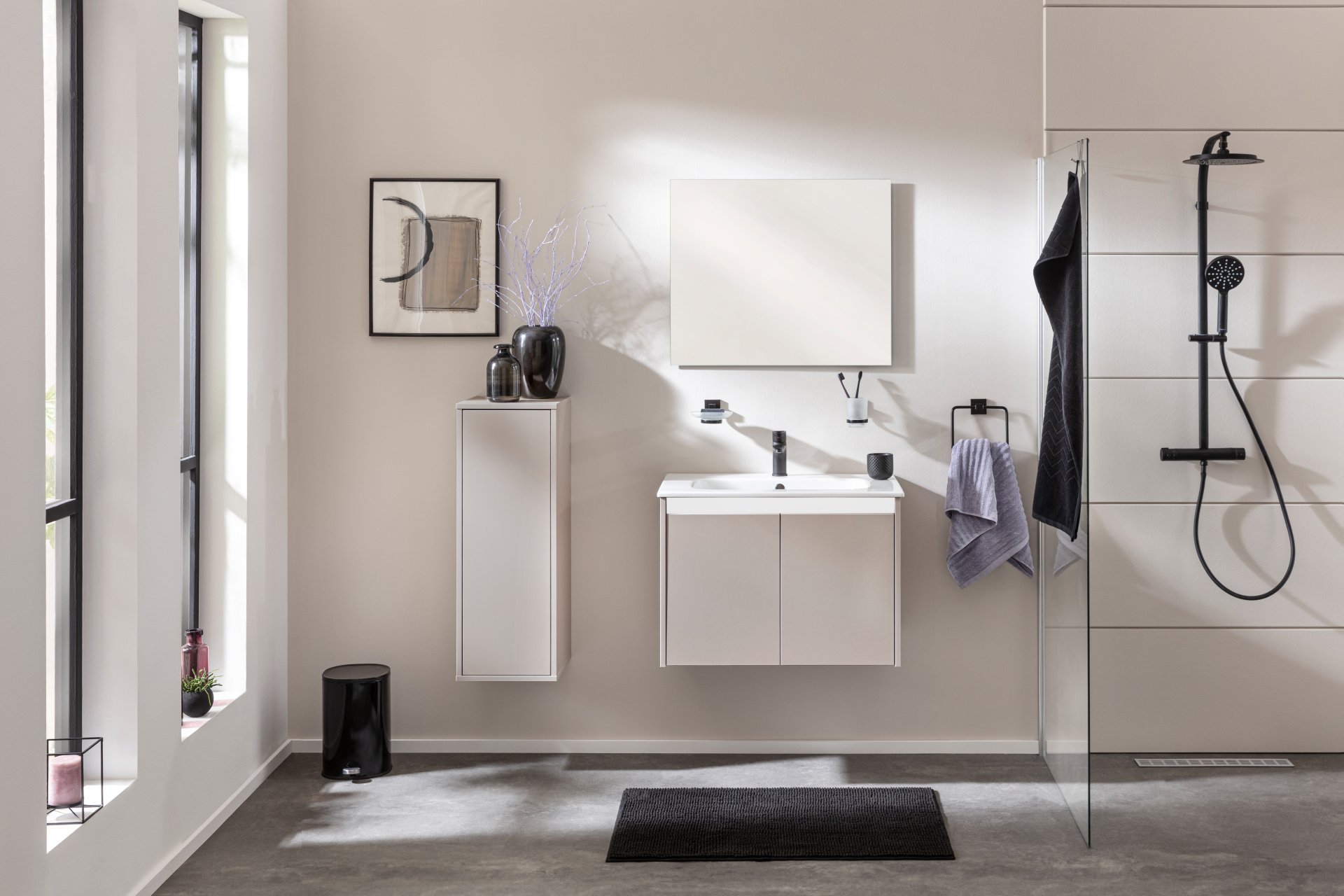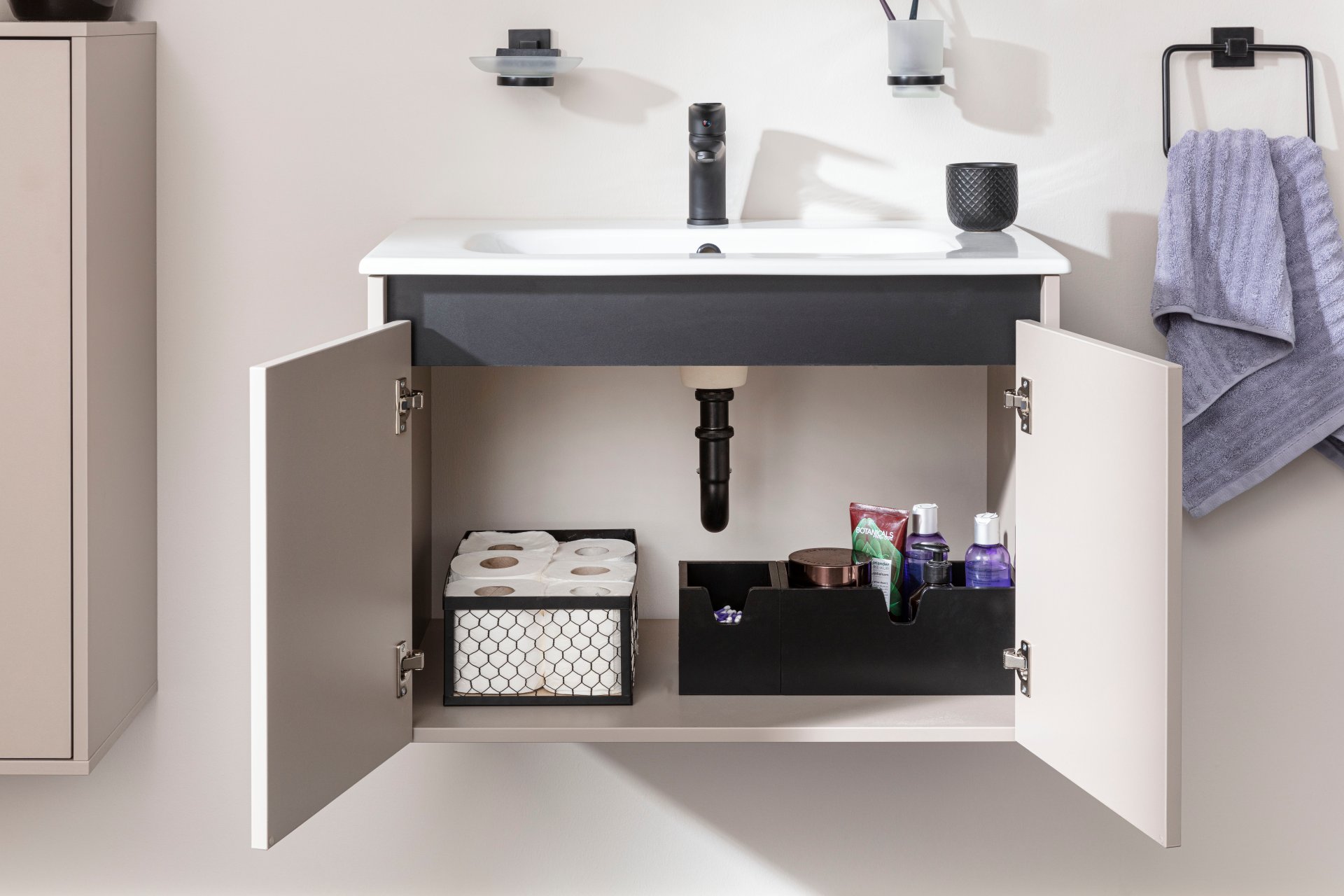 Viel Stauraum unter dem Waschtisch gewünscht? Dann bist Du mit dem 2-teiligen Badmöbelset von Fackelmann in elegantem Kaschmir gut beraten. Du holst Dir nicht nur ausreichend Platz für Deine Badaccessoires, sondern mit seinem Design auch einen Hauch von Luxus in Dein Bad. Die Serie COMPACT LINE von Fackelmann bringt inspirierende Vielfalt in Dein Badezimmer. Der 70 cm breite Waschtischunterschrank ist mit zwei Türen ausgestattet. Im Inneren offenbart sich eine geräumige und übersichtliche Ablagefläche. Grifflose Badmöbel geben dem Design Dominanz und unterstreichen die klare Linienführung. Gedämpfte Scharniere sorgen für ein sanftes, berührungsloses Schließen. Das Besondere: Die Blenden sind wandelbar. Dein Waschtischunterschrank wird mit drei verschiedenen Griffblenden geliefert. In Schwarz, Weiß und in der Korpusfarbe. Du entscheidest, was zu Deiner Badausstattung und Deinem Stil passt. Harmonisch sitzt das 71 cm breite Waschbecken aus feiner, weißer Keramik auf dem Unterschrank. Eine tiefe Waschmulde ist ideal für das tägliche Pflegeritual und Wasserspritzer bleiben da, wo sie hingehören. Überlauf und Hahnlochbohrung runden die durchdachte Funktionalität des Waschbeckens ab. Mit dem FACKELMANN COMPACT LINE Waschbecken mit Unterschrank 71 cm breit, Grau, Waschbecken Keramik Weiß, 2 Türen holst Du Dir ein Badmöbelset in Dein neues Badezimmer, das sich durch klare Linien und kluge Details auszeichnet. Badmöbel von Fackelmann werden mit viel Liebe zum Detail in Deutschland gefertigt. Eine leicht verständliche Aufbauanleitung hilft Dir kompetent und zuverlässig beim Aufbau.