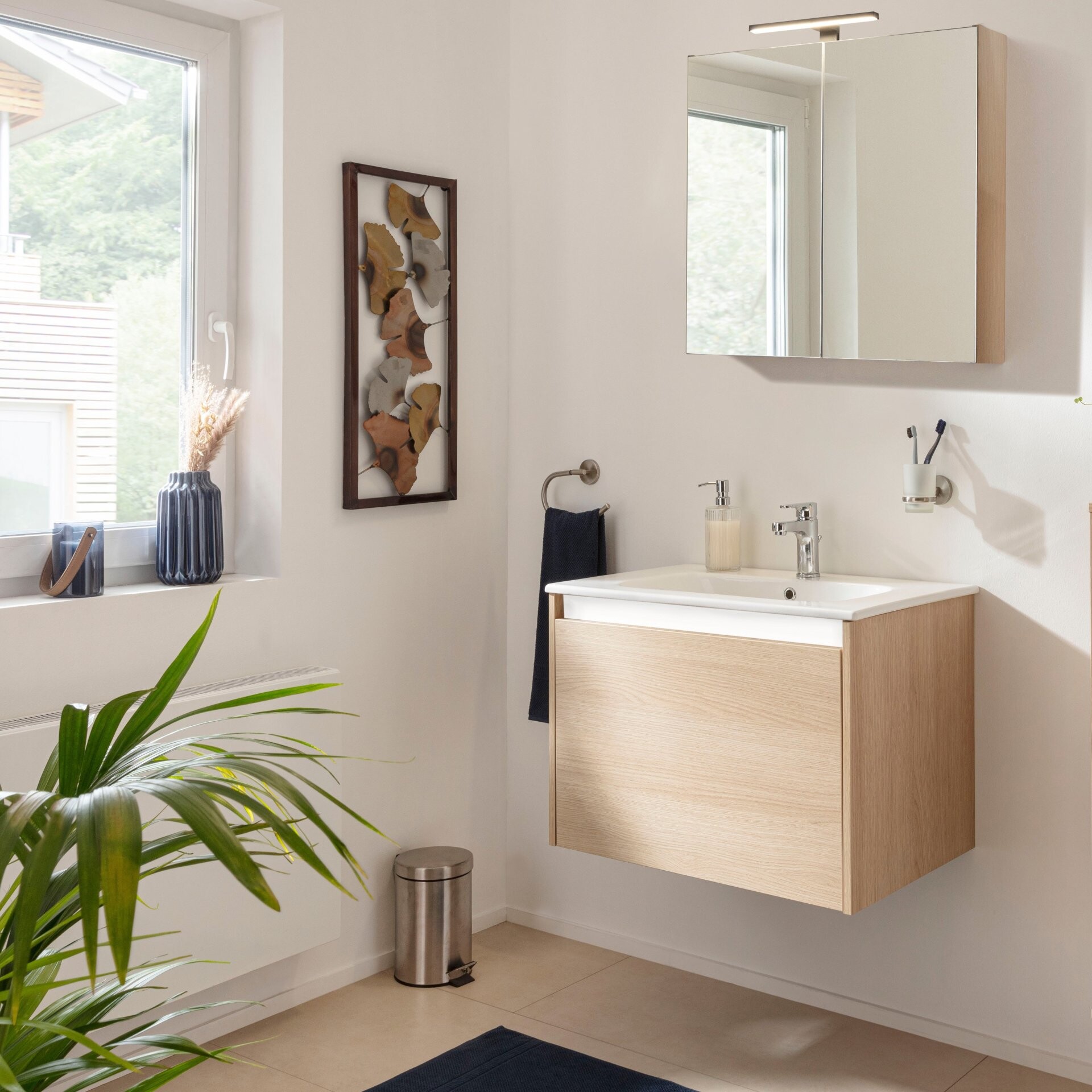Wie wäre es mit einem Badmöbelset im Farbton Lindberg Eiche, das Dir cleveren Stauraum bietet und jeden Tag ein kleines Wohlfühlgefühl auslöst? Mit dem 5-teiligen Waschtisch Set mit Spiegelschrank aus der Serie COMPACT LINE von Fackelmann in 71 cm Breite zieht zeitlose Eleganz in Dein Badezimmer. Das Design Lindberg-Eiche bringt mit seiner warmen Holzoptik und sanften Farbnuancen Frische und Natürlichkeit ins Bad. Eine großzügige Schublade bietet cleveren Stauraum im Waschtischunterschrank. Hier lassen sich Badaccessoires, Hygieneartikel und Handtücher ordentlich verstauen und sind immer griffbereit. Dank Soft-Close-System schließt die Schublade sanft und komfortabel. Drei wechselbare Griffblenden ermöglichen Dir eine individuelle Gestaltung passend zu Deinem Bad Interior. Formvollendet sitzt das weiße Keramik Waschbecken mit tiefer Waschmulde und Hahnlochbohrung auf dem Unterschrank. Ein moderner Spiegelschrank mit Innenspiegeln und Glaseinlegeböden sorgt für zusätzlichen Komfort. Die stromsparende LED-Aufsatzleuchte bringt ausreichend Licht auf die Spiegelfläche, während die integrierte Energie Box Strom für Rasierer oder Zahnbürste liefert. Mit dem FACKELMANN COMPACT LINE Waschtisch Set mit Spiegelschrank 71 cm breit, Braun hell, Waschbecken Keramik Weiß, inklusive Aufsatzleuchte und Energie Box, 1 Schublade, holst Du Dir ein modernes Badmöbelset mit vielen Raffinessen in Dein Bad. Das Badset ist zerlegt und wird mit einer leicht verständlichen Aufbauanleitung direkt zu Dir nach Hause geliefert. Badmöbel von Fackelmann werden mit viel Liebe zum Detail in Deutschland hergestellt. Sie stehen für langlebige Qualität und durchdachte Funktionalität.