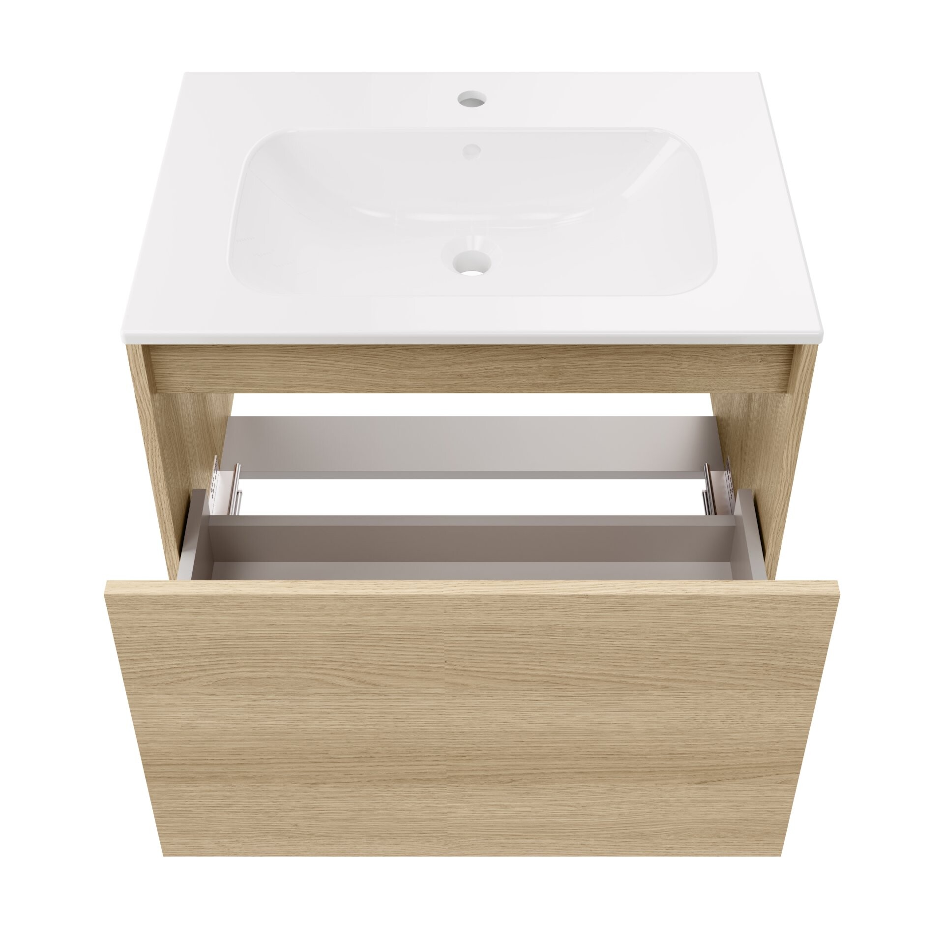 Fackelmann COMPACT LINE Waschtisch Set mit Spiegelschrank 71 cm breit, Braun hell, Waschbecken Keramik Weiß, inklusive Aufsatzleuchte und Energie Box, 1 Schub