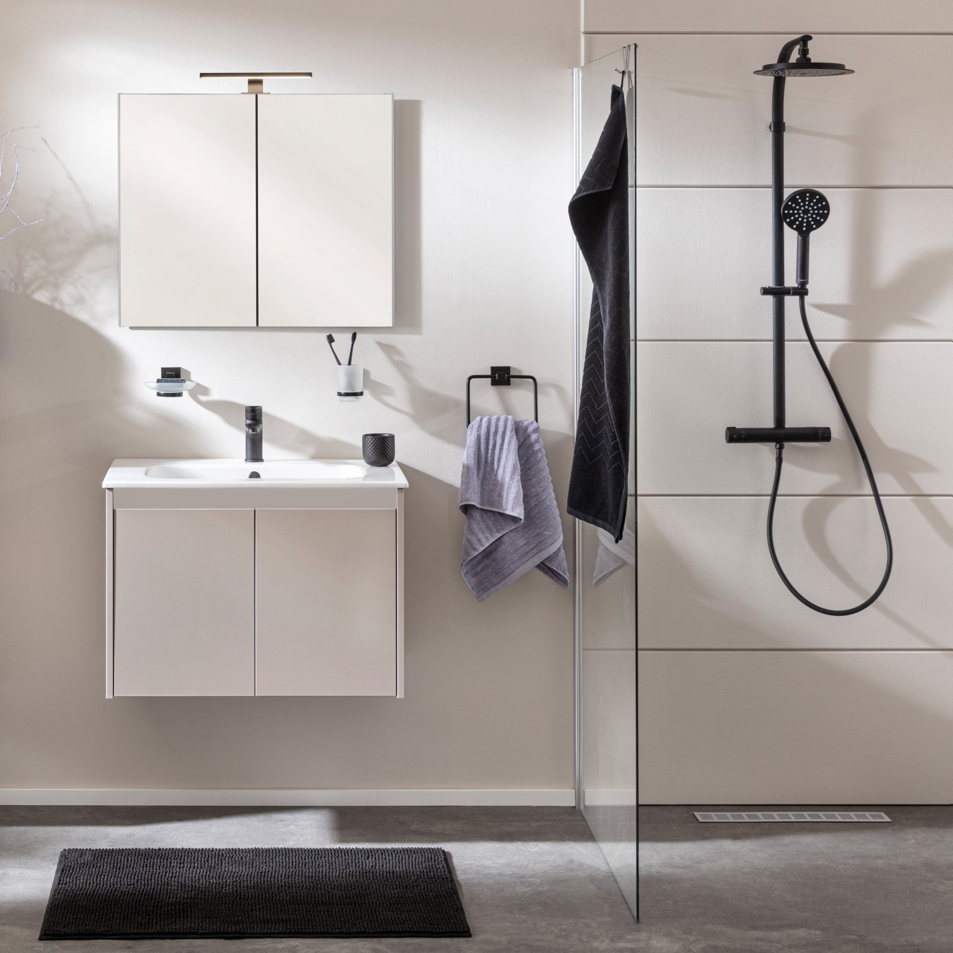 Wie wäre es mit einem zweitürigen Badmöbelset, das Dir cleveren Stauraum bietet und jeden Tag ein kleines Wohlfühlgefühl auslöst? Mit dem 5-teiligen Waschtisch Set mit Spiegelschrank aus der Serie COMPACT LINE von Fackelmann in 71 cm Breite zieht zeitlose Eleganz in Dein Badezimmer. Der Farbton Kaschmir wirkt warm, ruhig und edel zugleich. Hinter den beiden Türen verbirgt sich ein cleverer Stauraum im Waschtischunterschrank. Auf Einlegeböden wurde bewusst verzichtet, damit sich Badaccessoires, Hygieneartikel und Handtücher ordentlich verstauen lassen und immer griffbereit sind. Dank gedämpfter Scharniere schließen die Türen nahezu lautlos. Drei wechselbare Griffblenden ermöglichen Dir eine individuelle Gestaltung passend zu Deinem Bad Interior. Formvollendet sitzt das weiße Keramik Waschbecken mit tiefer Waschmulde und Hahnlochbohrung auf dem Unterschrank. Ein moderner Spiegelschrank mit Innenspiegeln und Glaseinlegeböden sorgt für zusätzlichen Komfort. Die stromsparende LED-Aufsatzleuchte bringt ausreichend Licht auf die Spiegelfläche, während die integrierte Energie Box Strom für Rasierer oder Zahnbürste liefert. Mit dem FACKELMANN COMPACT LINE Waschtisch Set mit Spiegelschrank 71 cm breit, Grau, Waschbecken Keramik Weiß, inklusive Aufsatzleuchte und Energie Box, holst Du Dir ein modernes Badmöbelset mit vielen Raffinessen in Dein Bad. Das Badset ist zerlegt und wird mit einer leicht verständlichen Aufbauanleitung direkt zu Dir nach Hause geliefert. Badmöbel von Fackelmann werden mit viel Liebe zum Detail in Deutschland hergestellt. Sie stehen für langlebige Qualität und durchdachte Funktionalität.