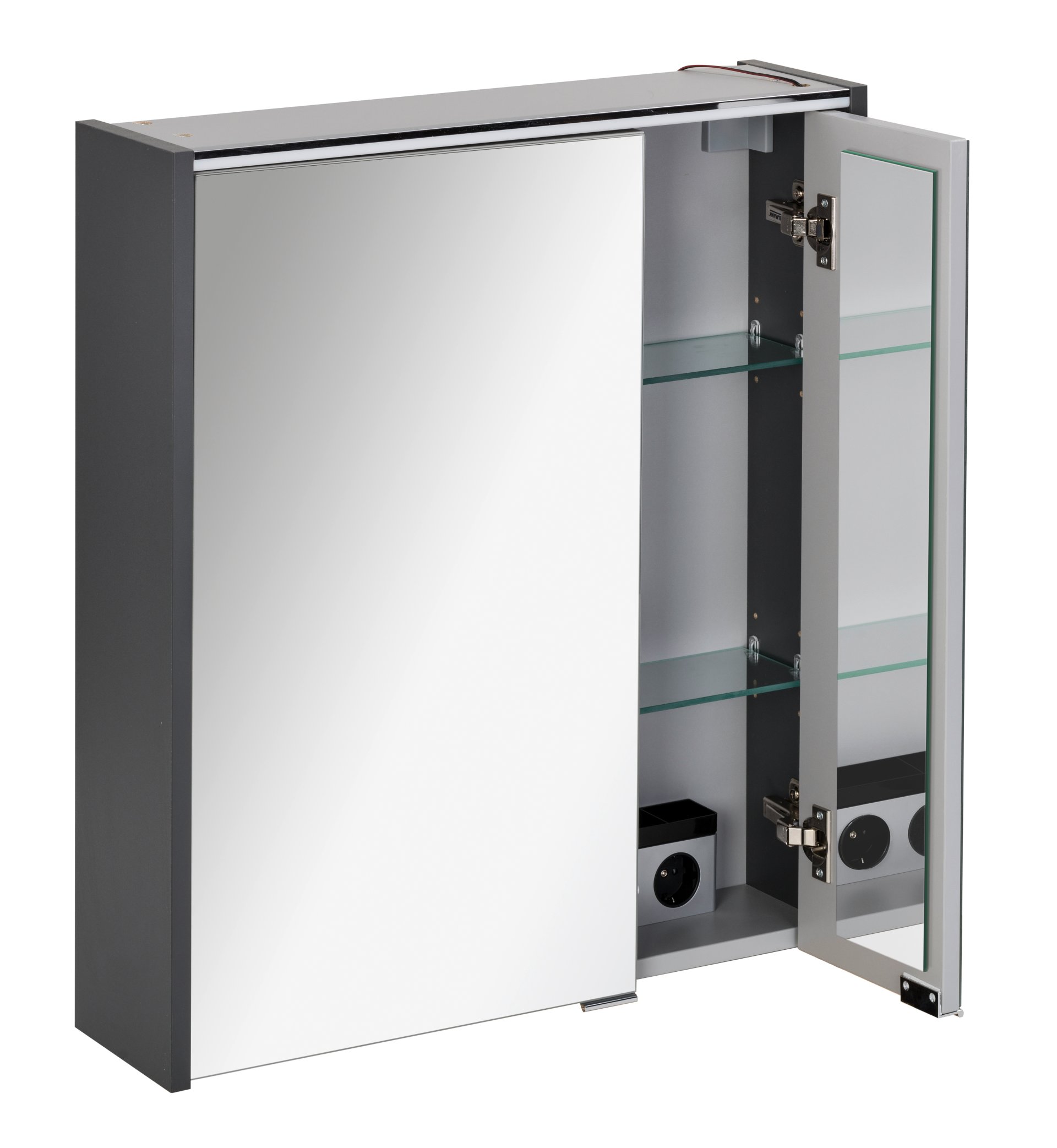 Der 60 cm breite LED-Spiegelschrank Denver von Fackelmann überzeugt durch seine extra breite Spiegeltür auf der linken Seite. Die über die gesamte Spiegelbreite angebrachte LED Leuchte mit 5,5 Watt beleuchtet das Spiegelbild harmonisch für die tägliche Morgentoilette. Ein zusätzliches Highlight ist der Innenspiegel. Bei geöffneter Spiegeltür bietet er Rundum-Ansicht für ein perfektes Styling. Im Inneren des Spiegelschranks befindet sich eine Steckdose und ein An-Ausschalter. So lassen sich problemlos Fön oder elektrische Zahnbürste direkt am Spiegelschrank nutzen. Durch seine Maße eignet sich der Schrank für kleine Bäder und Gäste WC's. Mit seinen zwei Glaseinlegeböden sorgt er für Struktur im Inneren und bietet gleichzeitig einen freien Blick auf alle wichtigen Badutensilien. Modernes Schwarz wurde für den Korpus gewählt. Badmöbel von Fackelmann werden mit viel Liebe zum Detail in Deutschland hergestellt. Der Fackelmann DENVER LED Spiegelschrank 60 cm breit, Schwarz (Anthrazit) wird zerlegt und mit einer leicht verständlichen Aufbauanleitung geliefert.
