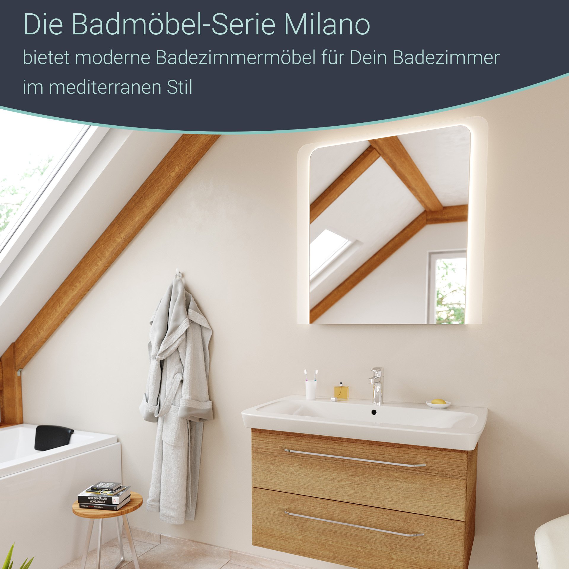 Der quadratische Spiegel mit einer Seitenlänge von 80 cm bildet eine stilvolle Ergänzung zu den neuen und modernen Badmöbel-Serien von Fackelmann. Der Wandspiegel MI 80 zeichnet sich durch seine austauschbare LED-Beleuchtung aus. Die Satinierung auf der linken, rechten und oberen Seite der Spiegelfläche und des Rahmens macht den Design-Spiegel zum Blickfang in jedem Badezimmer und sorgt für blendfreies Licht. Durch sein formvollendetes Design lässt sich der Fackelmann LED Spiegel MI 80 cm hervorragend mit allen bestehenden Fackelmann Badmöbel-Serien kombinieren. Möbel von Fackelmann werden mit viel Liebe zum Detail in Deutschland gefertigt. Dein Fackelmann Design LED Spiegel MI 80 cm wird sicher verpackt direkt zu Dir nach Hause geliefert.