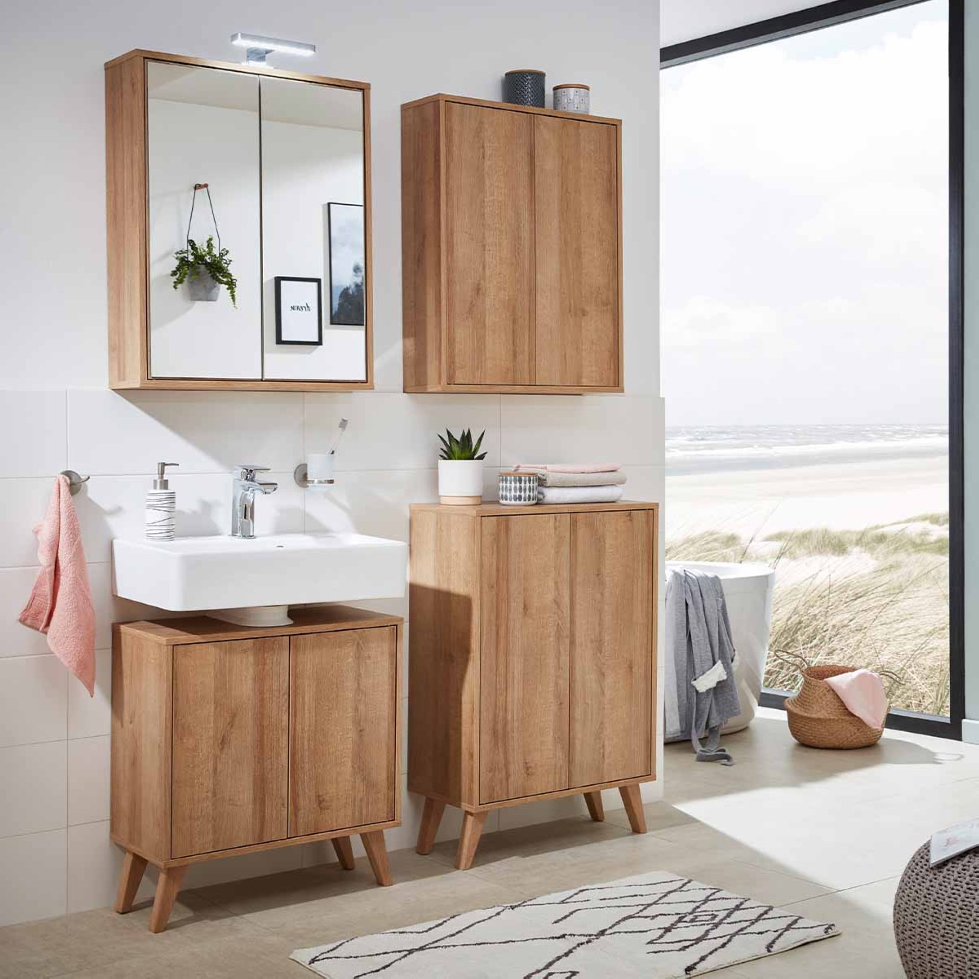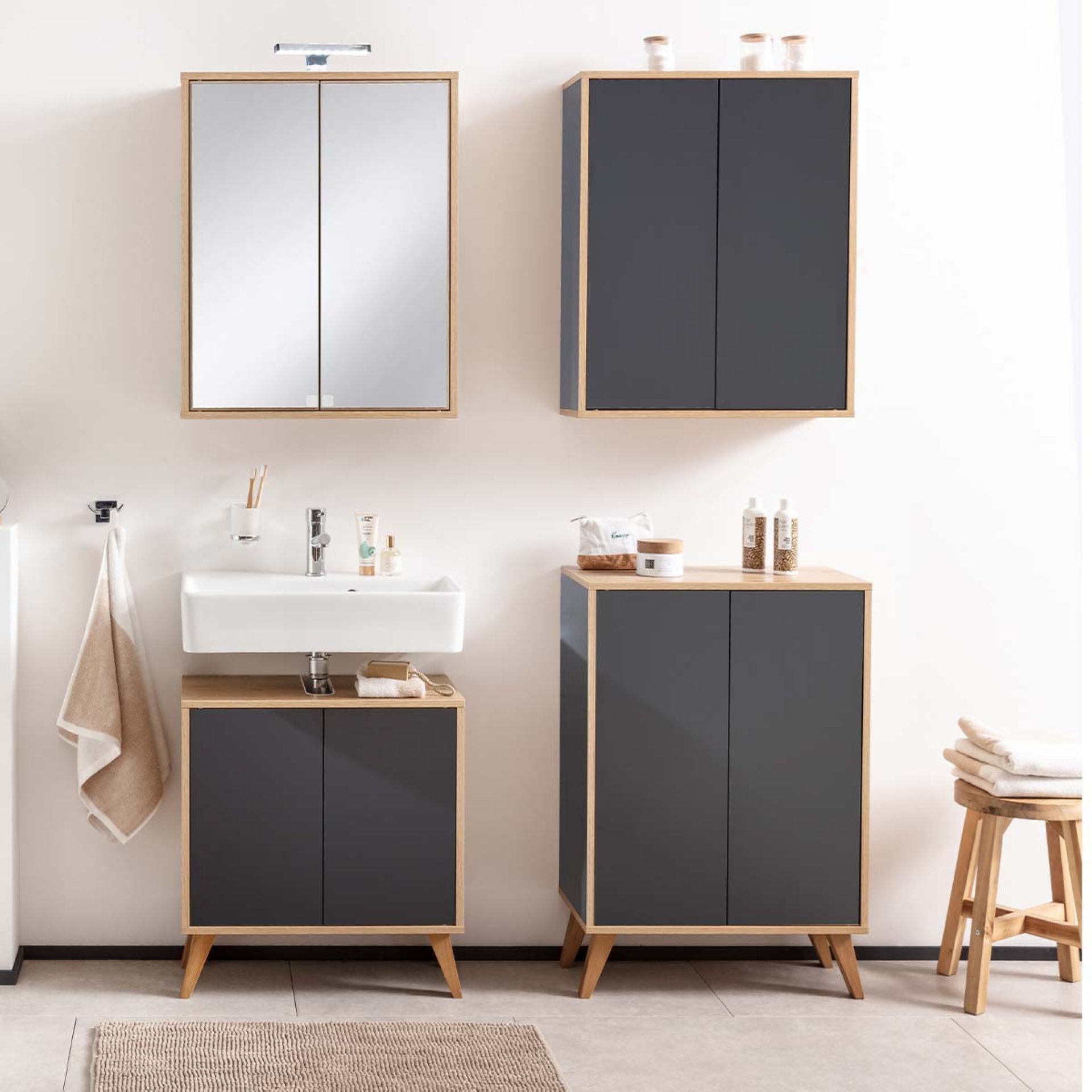 Massive Holzfüße mit einer Höhe von 15 cm machen aus hängenden Badmöbeln der Serie FINN von Fackelmann im Retrostil ganz einfach Stehende im modernen Skandinavien-Design. Die Fackelmann FINN 4-er Set Holzfüße, Braun hell, Eiche massiv eignen sich für den Waschbeckenunterschrank und den doppelten Midischrank (Art. Nr. 84611, 84612, 84613) aus dem Programm FINN. Mit den vier schrägen Füßen aus robustem Eichenholz bringst Du frischen Wind ins Badezimmer und kannst Deine Badschränke auch einfach mal umstellen. Das Set besteht aus vier Stück und dem für die Montage benötigten Befestigungsmaterial. Kreative Handwerker können die Füße aus Eiche natur auch bei anderen Möbeln einsetzen.
