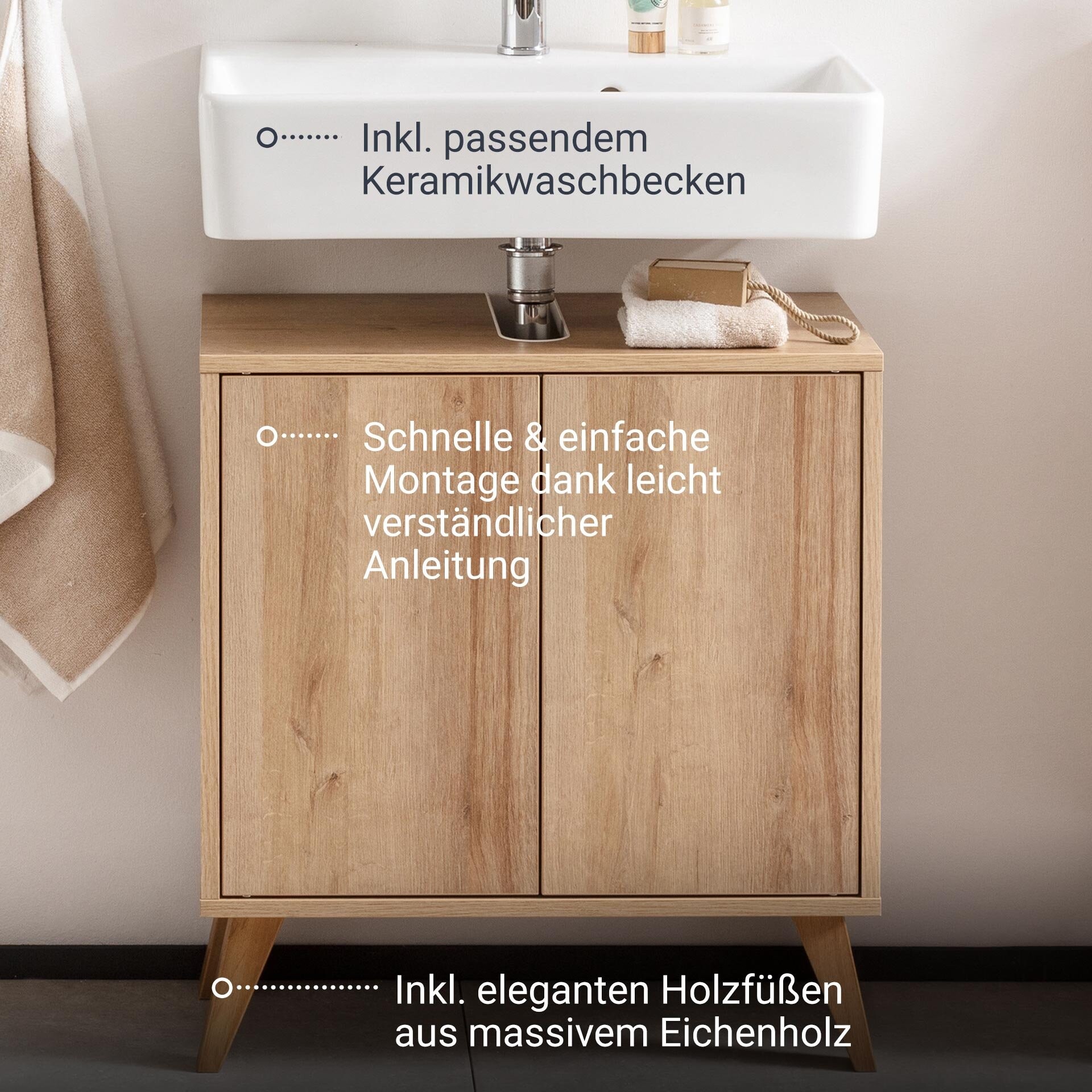 Fackelmann Finn Badmöbel Set 3-teilig 60 cm breit, mit Füßen, Braun hell