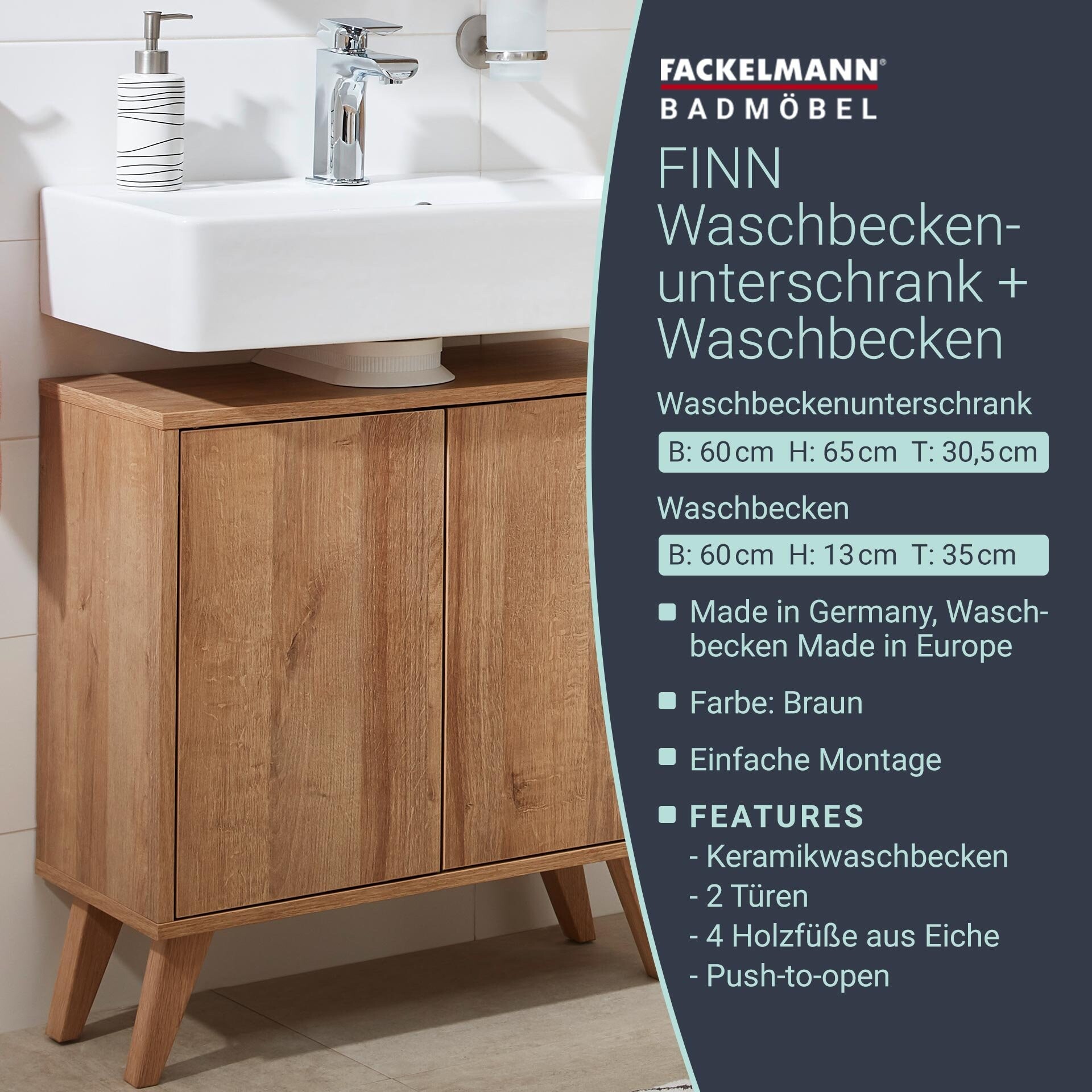 Das Badmöbelset FINN im Retrostil von Fackelmann ist ein Blickfang in kleinen Bädern und Gäste-WCs. Front und Korpus sind in einem hellen Braun gehalten, das dem natürlichen Farbton von Eiche nachempfunden ist. Die vier schrägen Holzfüße geben dem Badmöbel zudem ein modernes skandinavisches Design. Das kubische Keramikwaschbecken hat eine tiefe Waschmulde. Das Fackelmann FINN Badmöbelset 3-teilig, 60 cm breit, mit Füßen, Braun hell wird zerlegt und mit einer leicht verständlichen Aufbauanleitung geliefert.