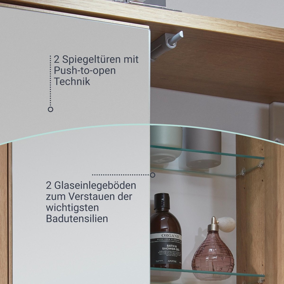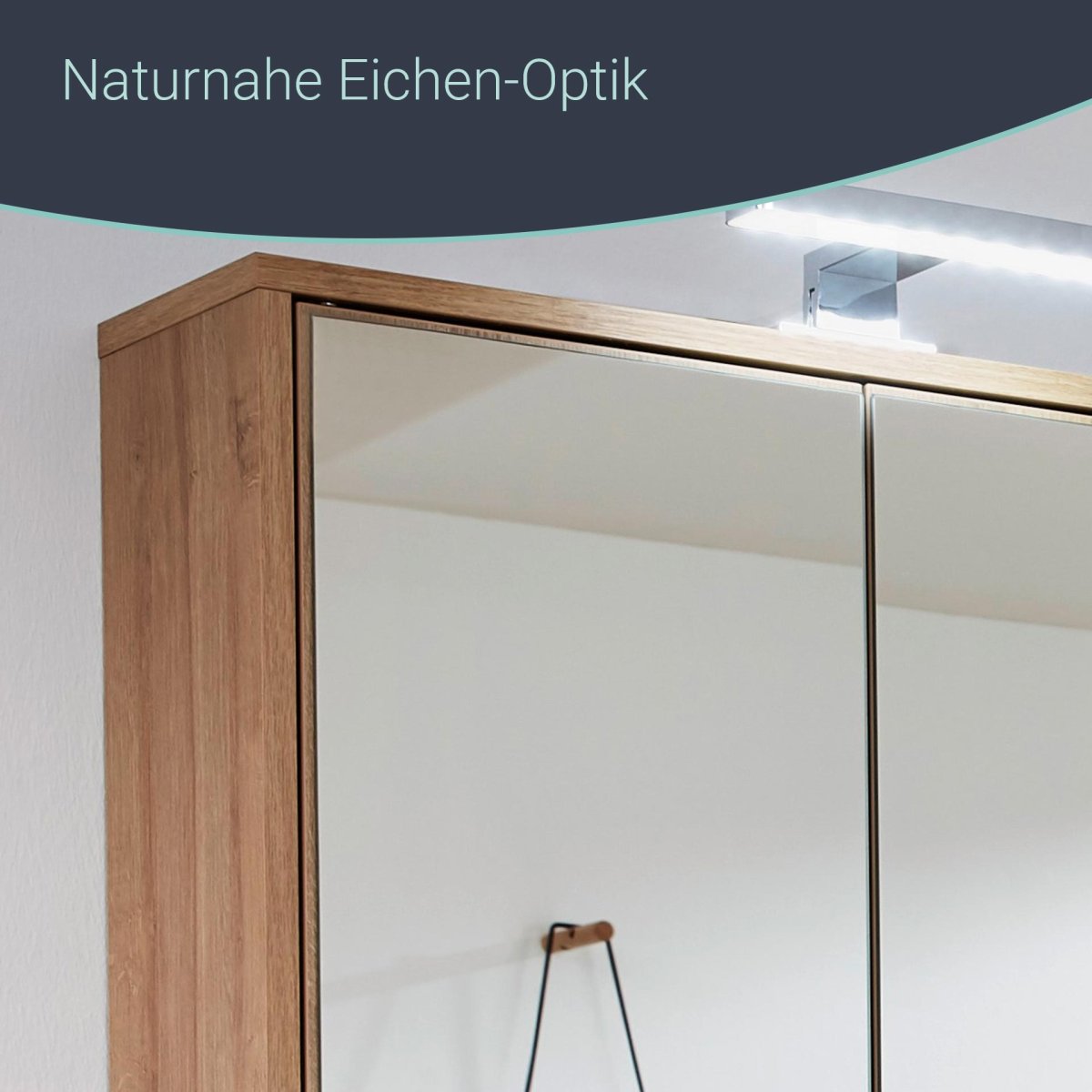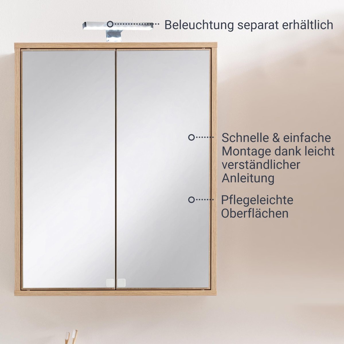 Der Spiegelschrank aus der Serie FINN von Fackelmann im Retrostil überzeugt durch die innovative Push-to-open Technik: Einfach auf die Front des Spiegels drücken und die Tür öffnet sich sanft. Der Korpus in hellem Braun bringt durch die Holzoptik Natürlichkeit in die Badeinrichtung. Der Fackelmann FINN Spiegelschrank 60 cm, Braun hell wird zerlegt und mit einer leicht verständlichen Aufbauanleitung geliefert. Um die Spiegelfläche optimal zu beleuchten, hast Du die Auswahl zwischen zwei LED-Aufsatzleuchten: Diese sind 20 cm (Art.nr. 84372) oder 30 cm (Art.nr. 84373) breit. Mit der E-Box (Art.nr. 84378) kannst Du elektrische Geräte direkt am Spiegelschrank nutzen. Über den integrierten Schalter lässt sich auch die Beleuchtung steuern. Leuchten und E-Box sind nicht im Lieferumfang enthalten und separat hier im Shop erhältlich.